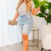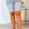 Get ready to rock your summer style with our Belle Bermuda Shorts! Made from a medium wash denim, these shorts feature a distressed frayed hemline for that edgy look! Perfect for any casual outing, these shorts add a touch of cool to any outfit!