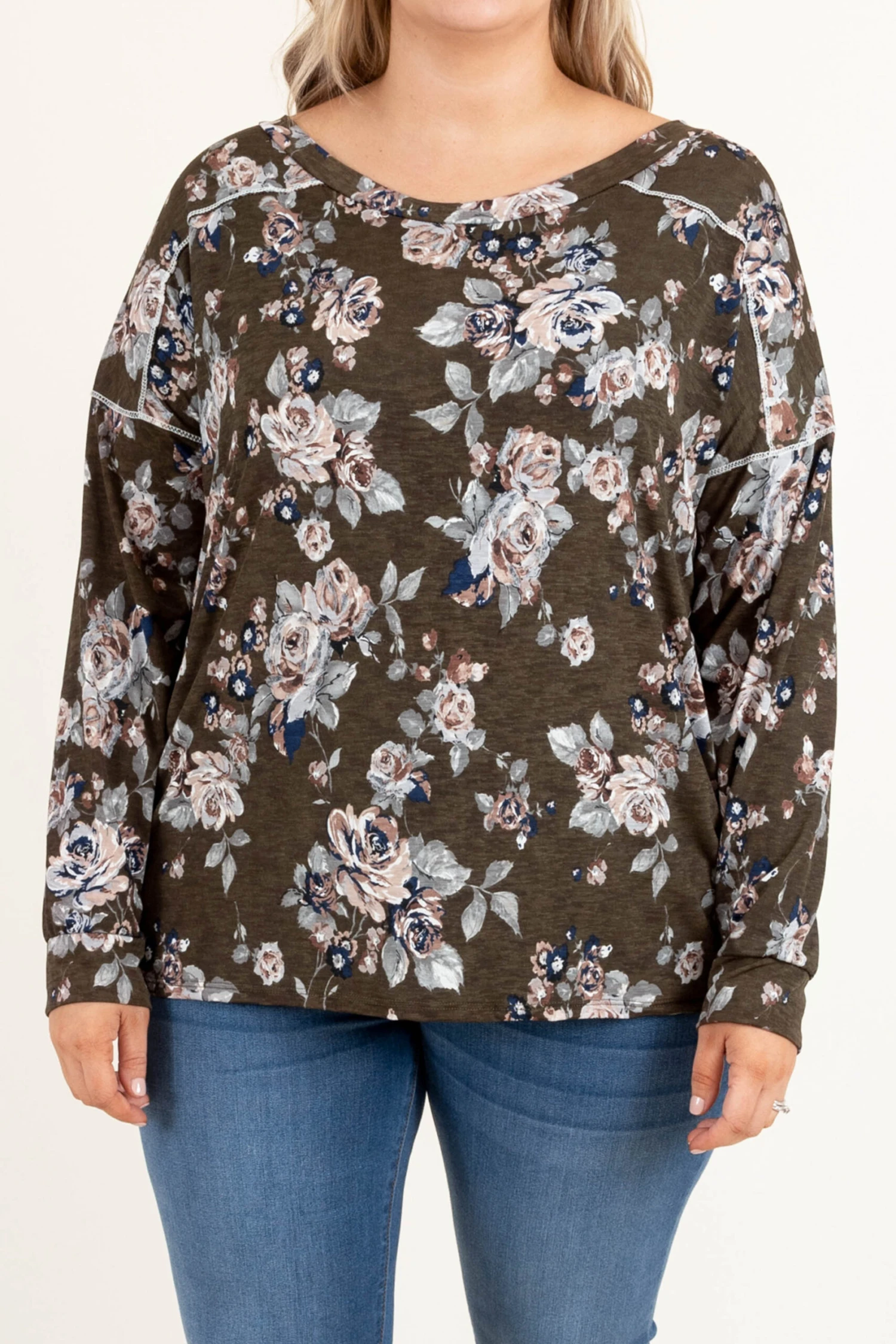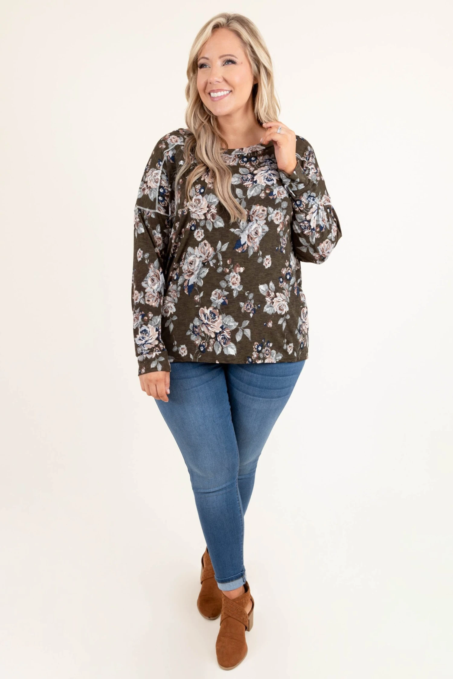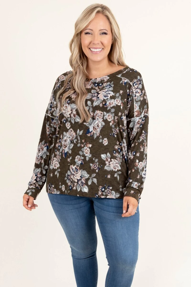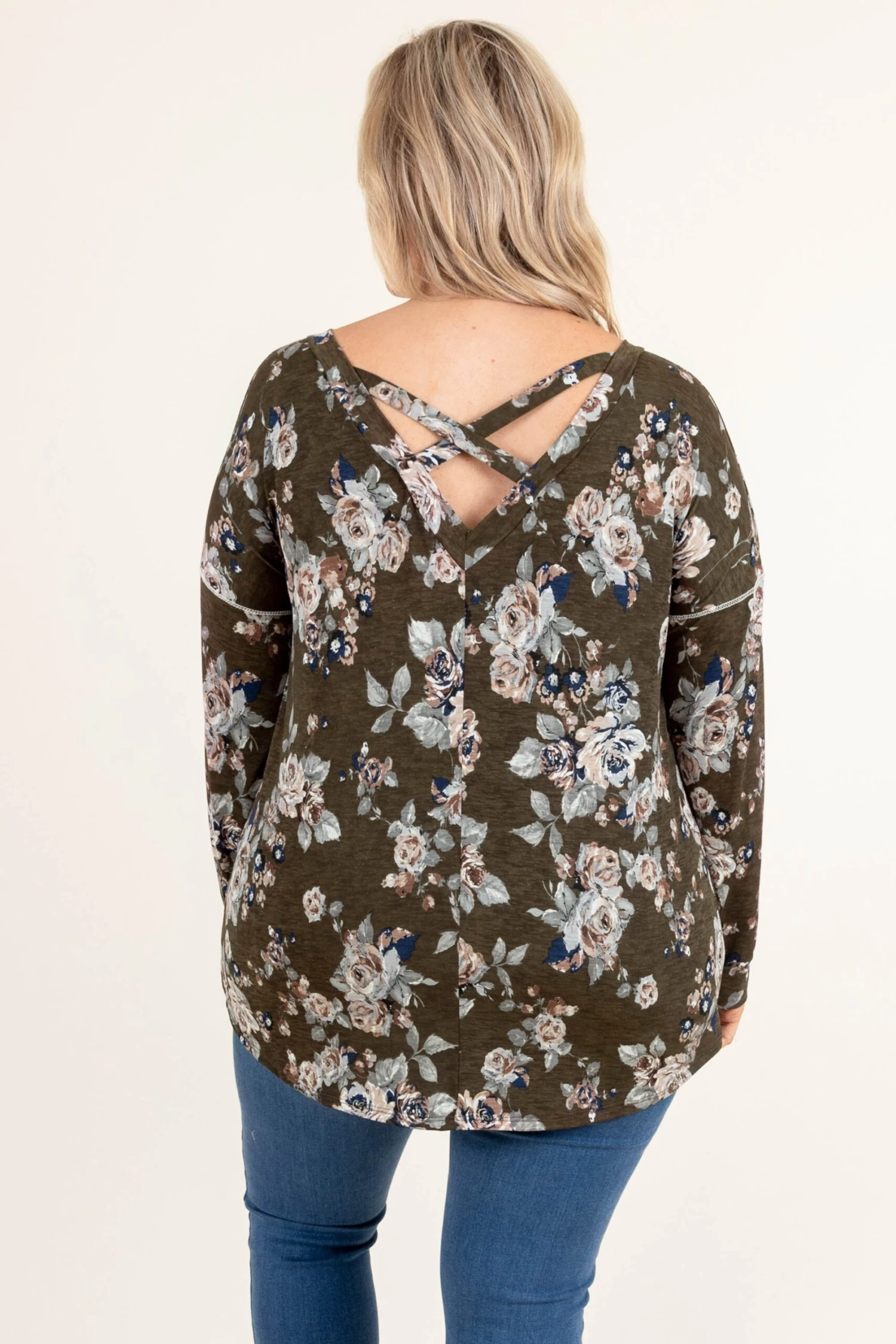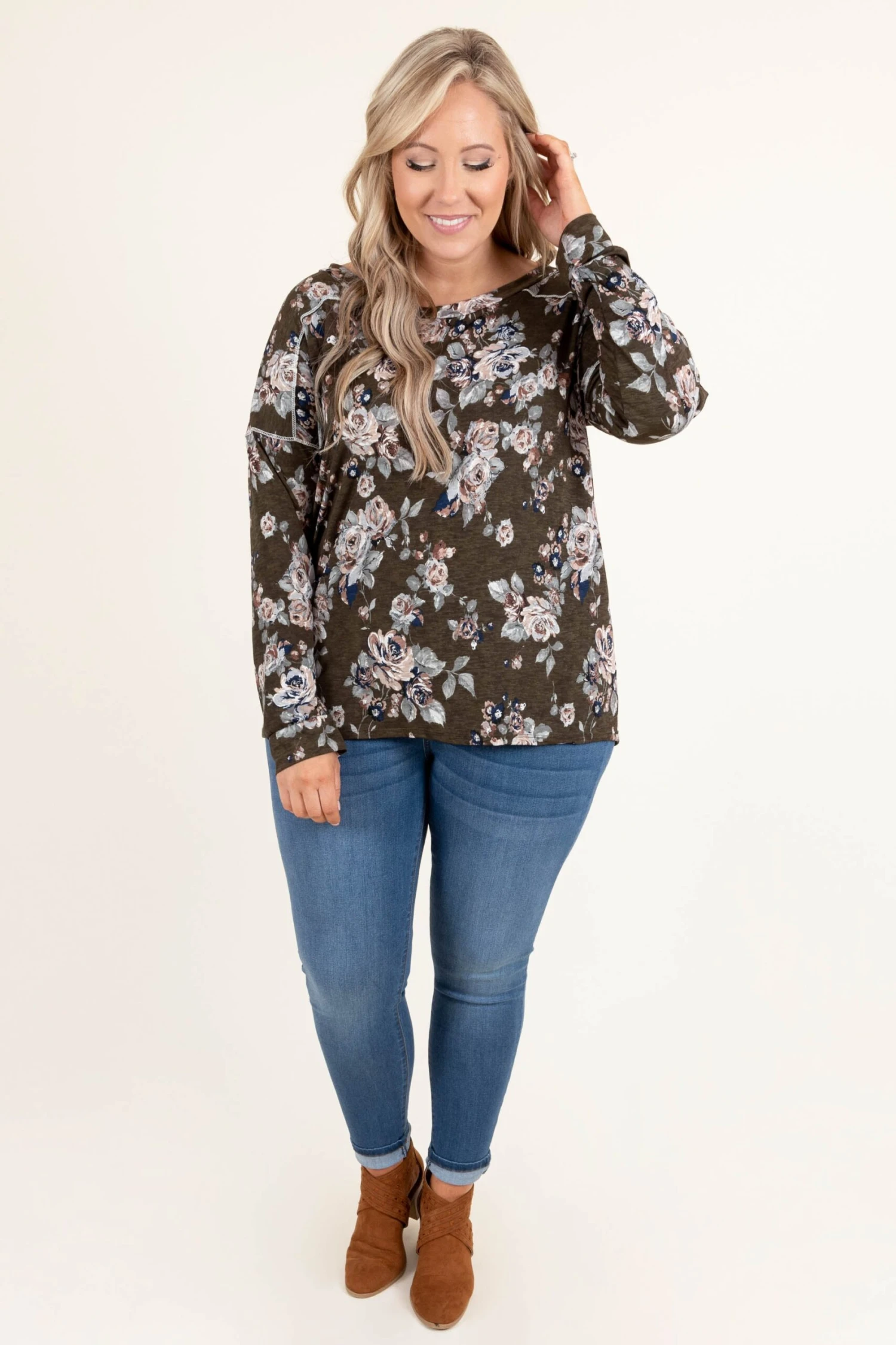 Prepare for better times in this amazing top! The gorgeous olive color and light weight material are perfect for all day wear! This top has a lovely floral pattern that is SO chic! Style this top with some skinnies and booties for a cute, casual look!