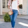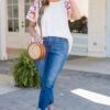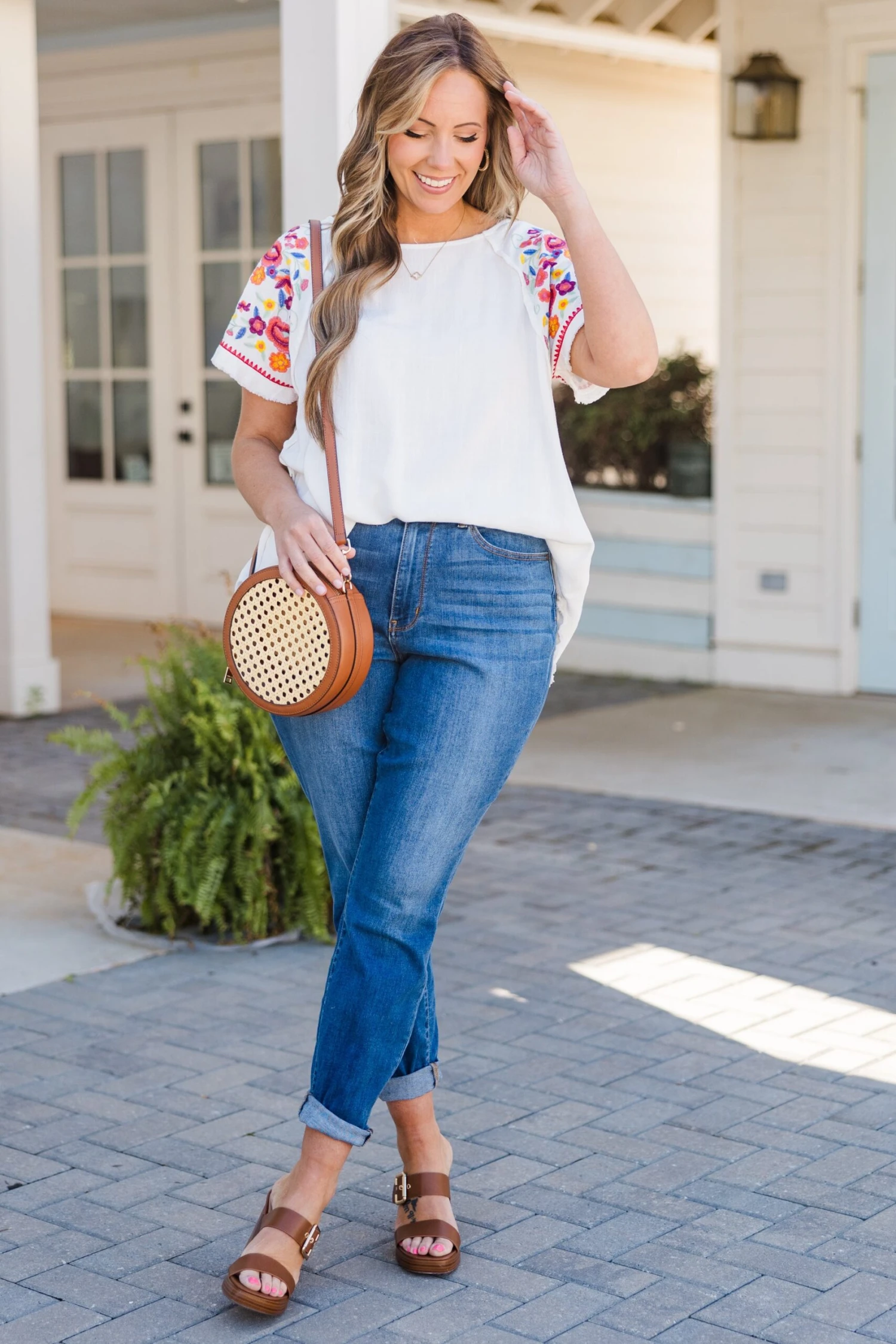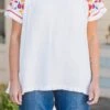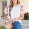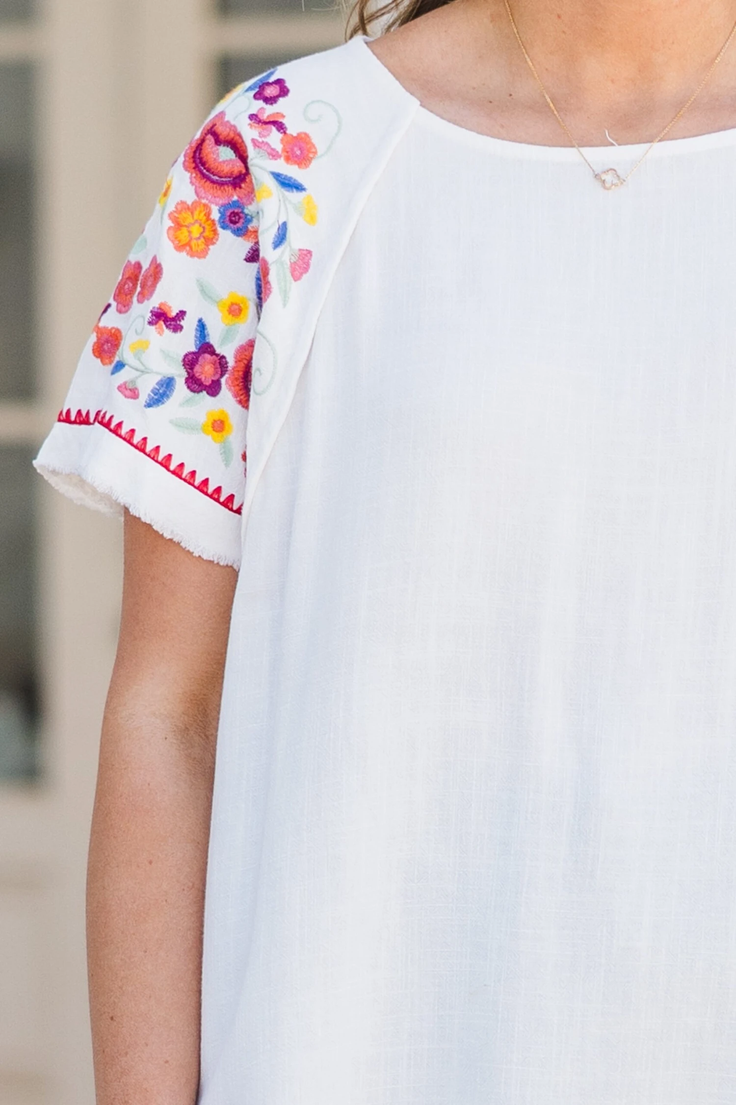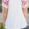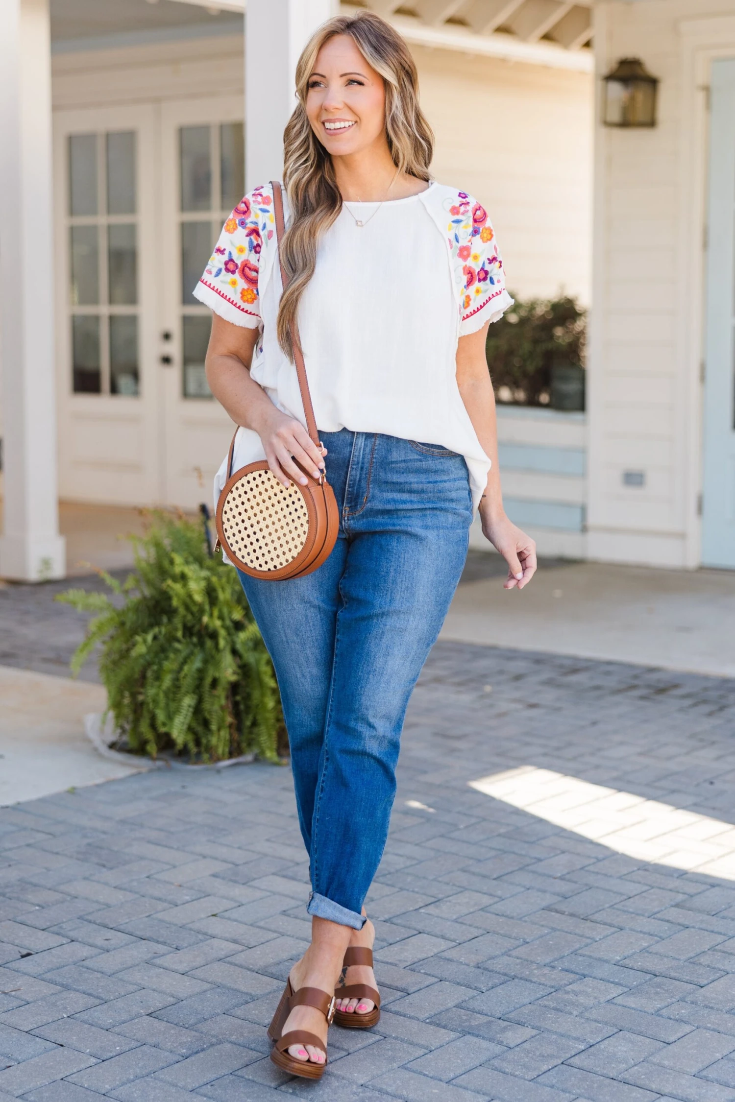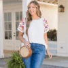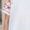 We are so in love with this FAB top! It features a frayed hemline for added texture and style that is so sweet! The neutral off-white color makes it a versatile addition to any wardrobe! Adorable embroidery detailing along the sleeves adds a touch of charm and personality! Elevate your look with this must-have top!