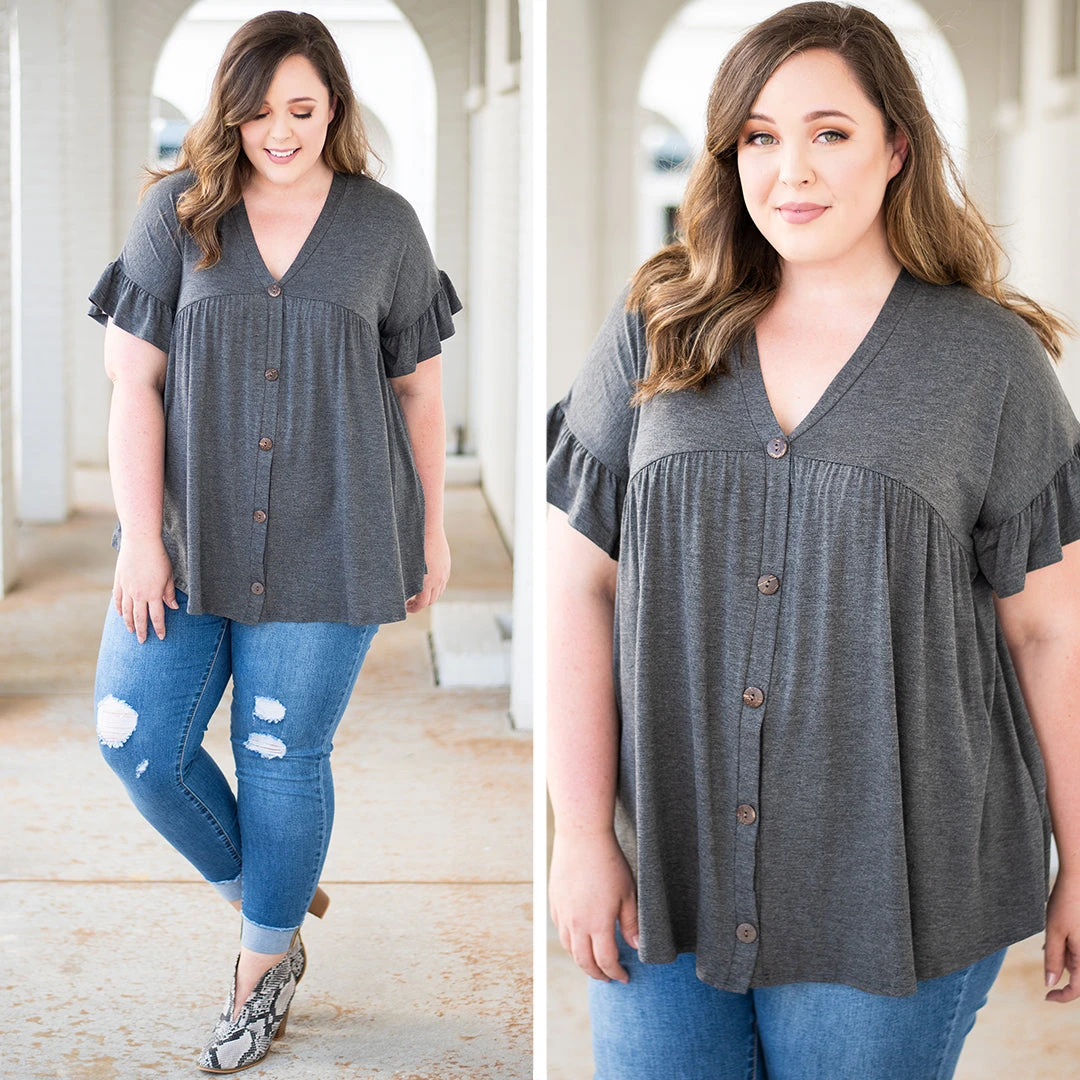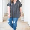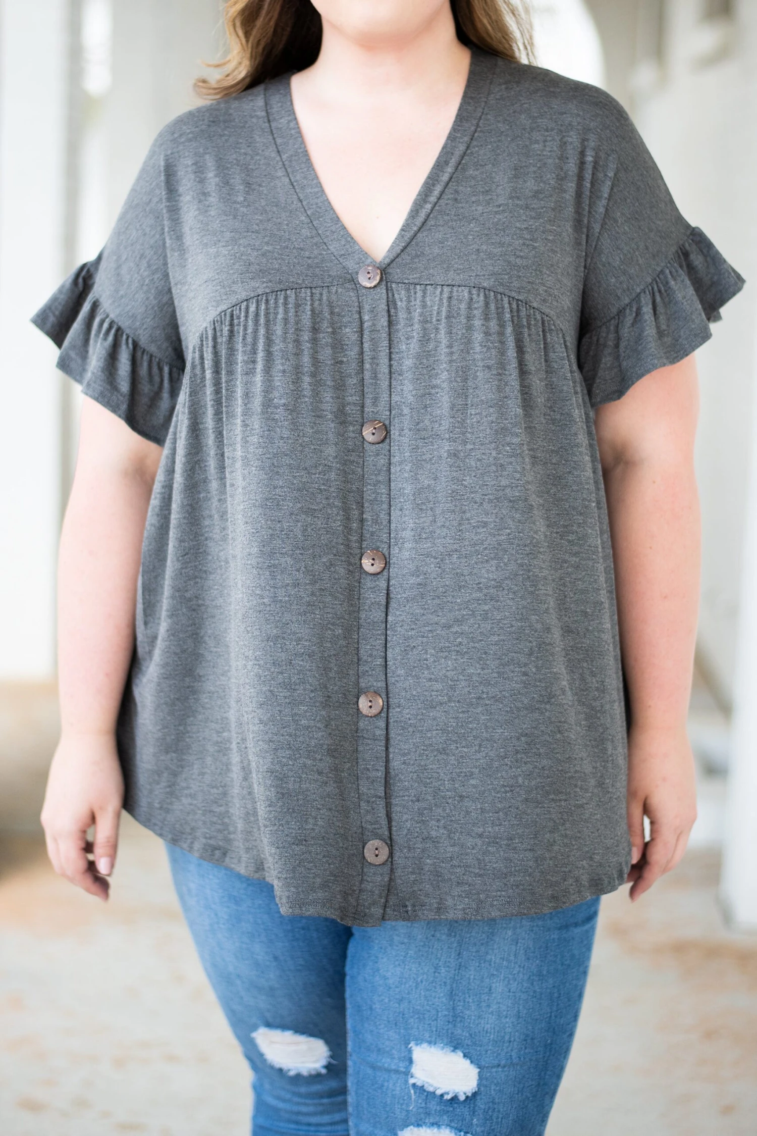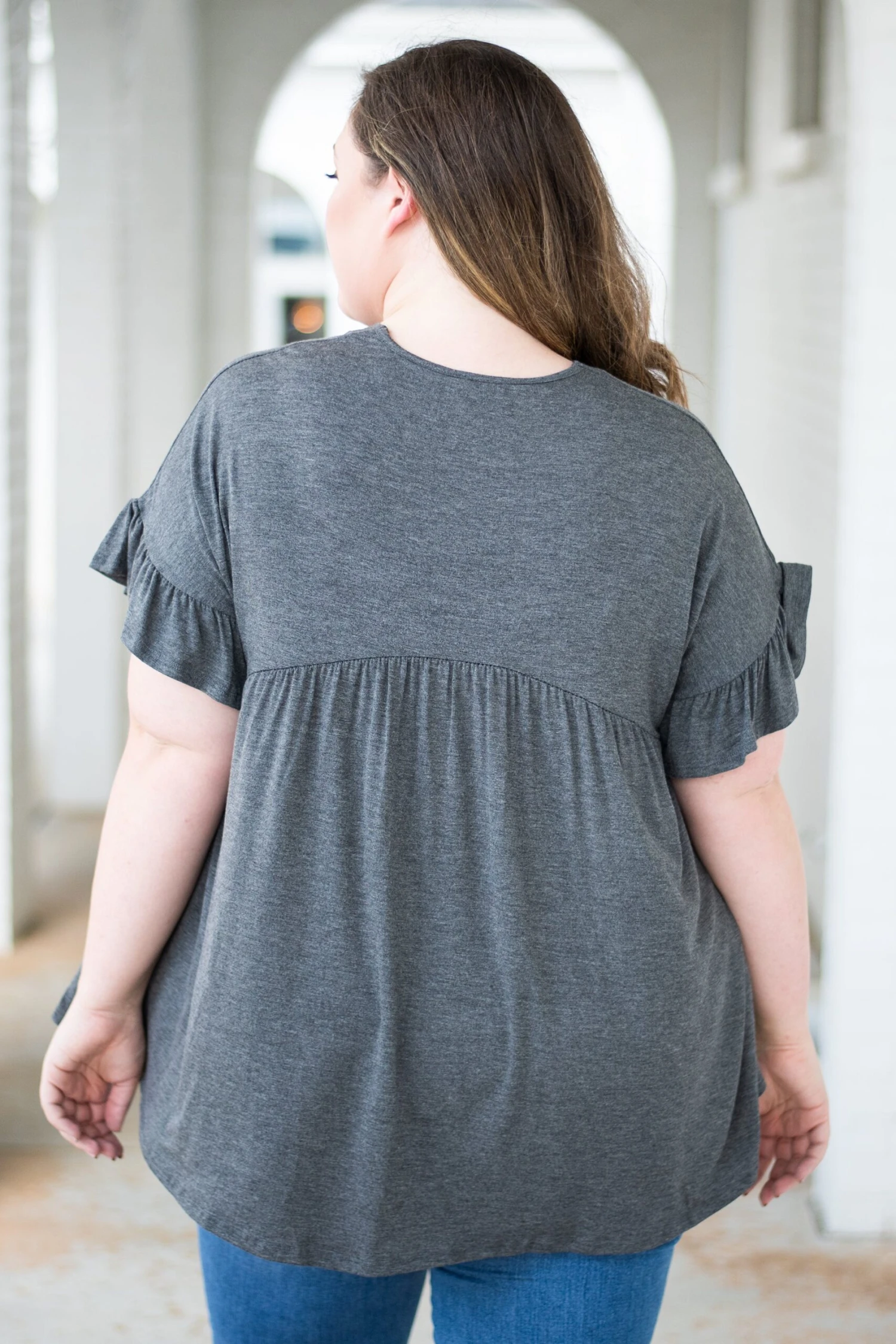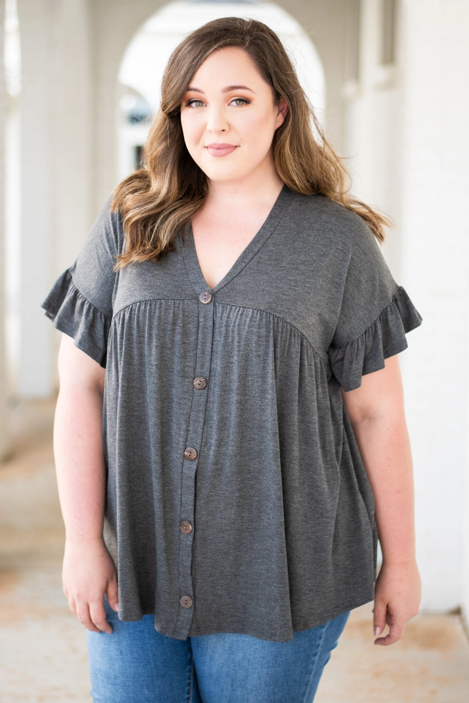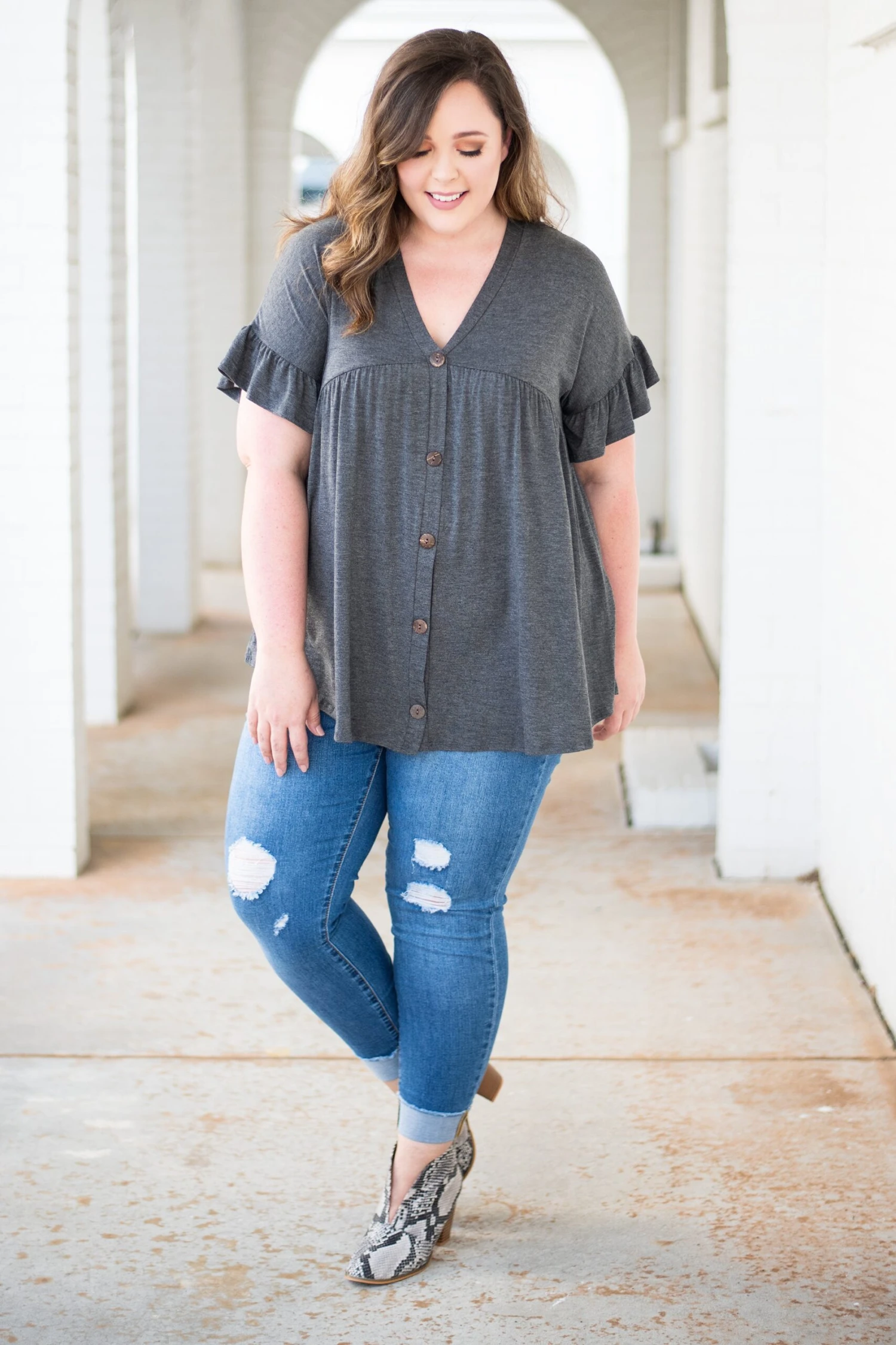This top is too sweet! It has a flirty and feminine design with a figure-flattering fit you’ll want to wear all day long! It’s light and flowy and has the cutest ruffled sleeves! Not to mention how easy the solid charcoal color is to pair with your favorite accessories! Style this top with skinnies and booties or wedges for an effortlessly chic look!
