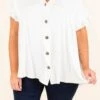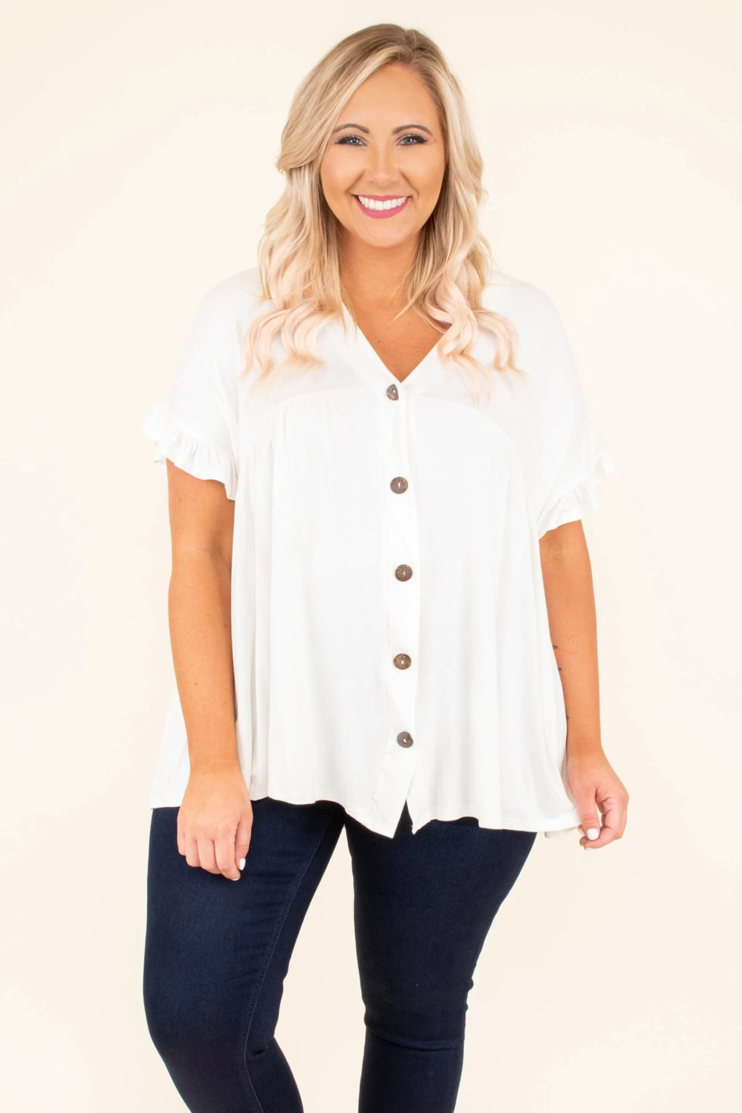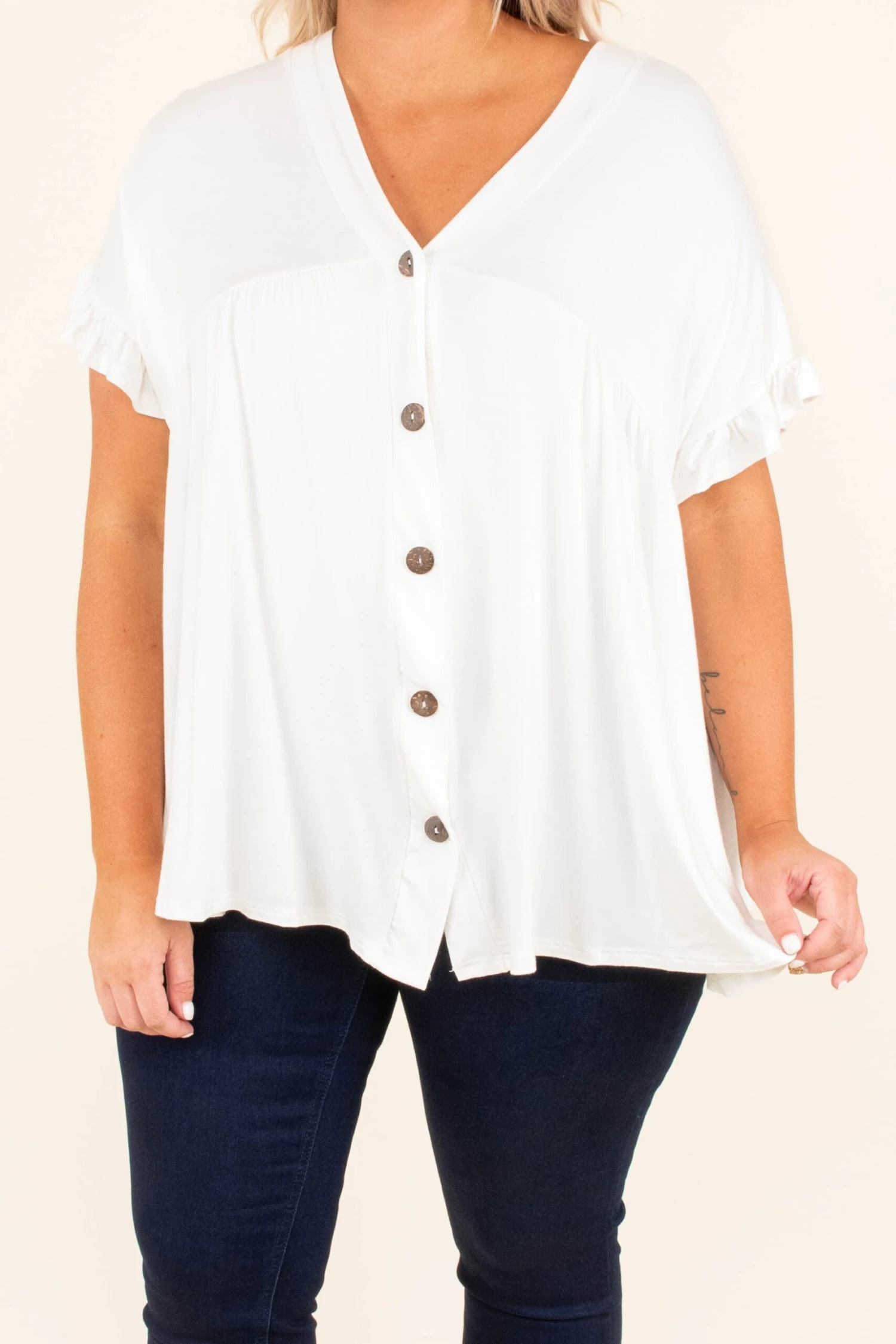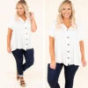 This top is too sweet! It has a flirty and feminine design with a figure-flattering fit you’ll want to wear all day long! It’s light and flowy to keep you cool on warm summer days and has the cutest ruffled sleeves! Not to mention how easy the solid ivory color is to pair with your favorite accessories! Style this top with skinnies and wedges for an effortlessly chic look!