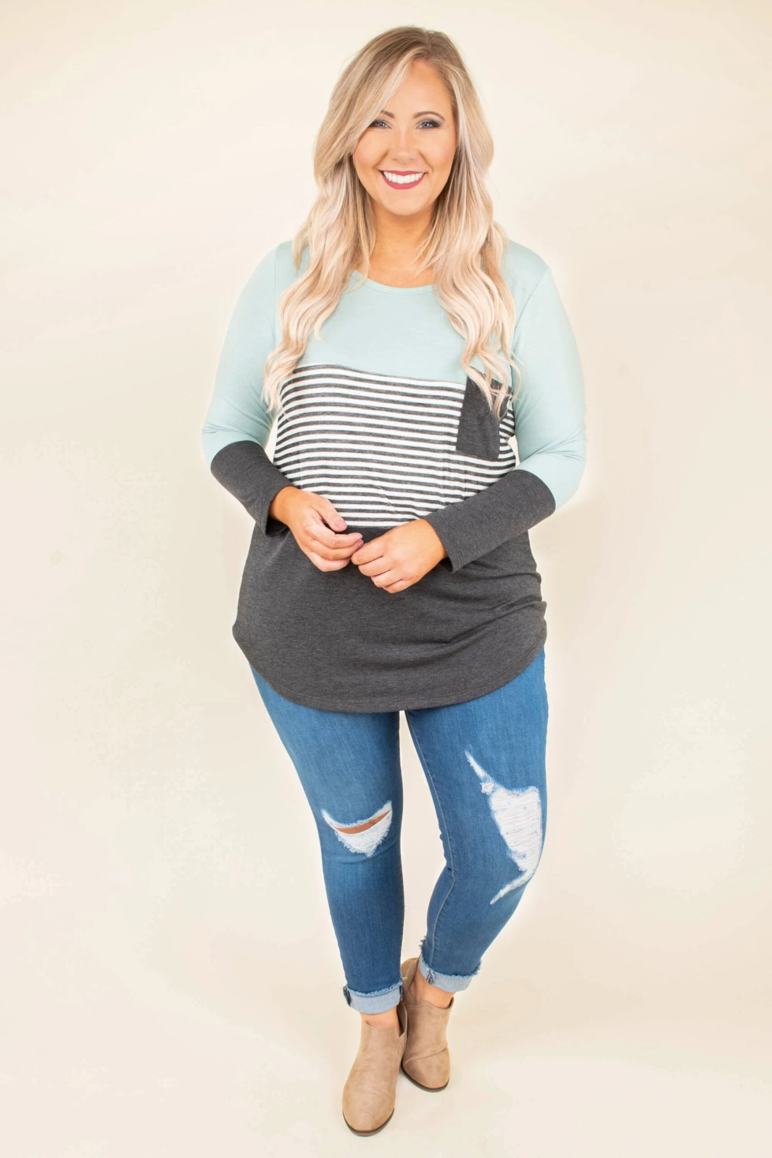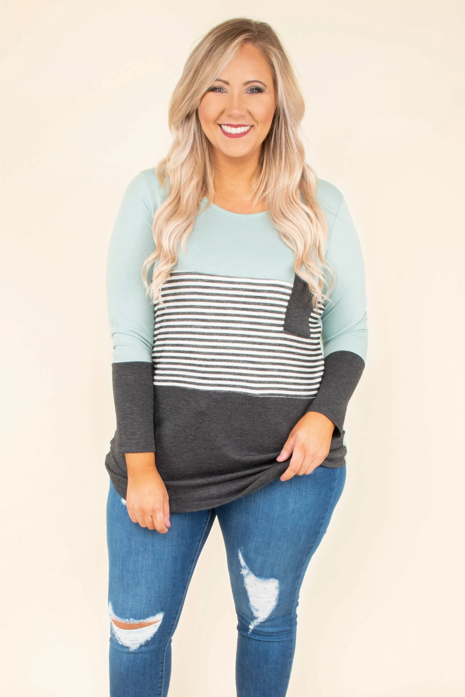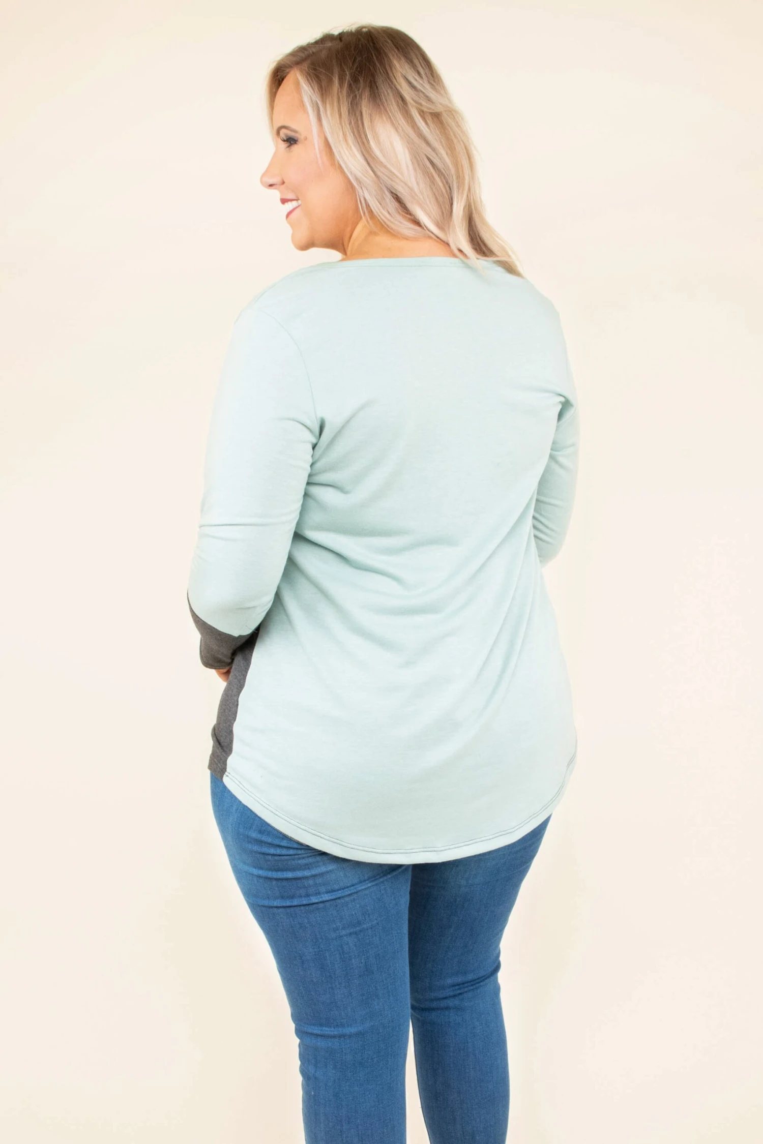 Color block is cool and needs to be worn by you! This cute, casual top has a pretty sage and charcoal color and a dreamy soft fabric. It’s so relaxed and great for busy days when you need an instantly stylish outfit! Throw it on with skinnies for an easy, effortless outfit!
