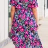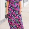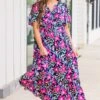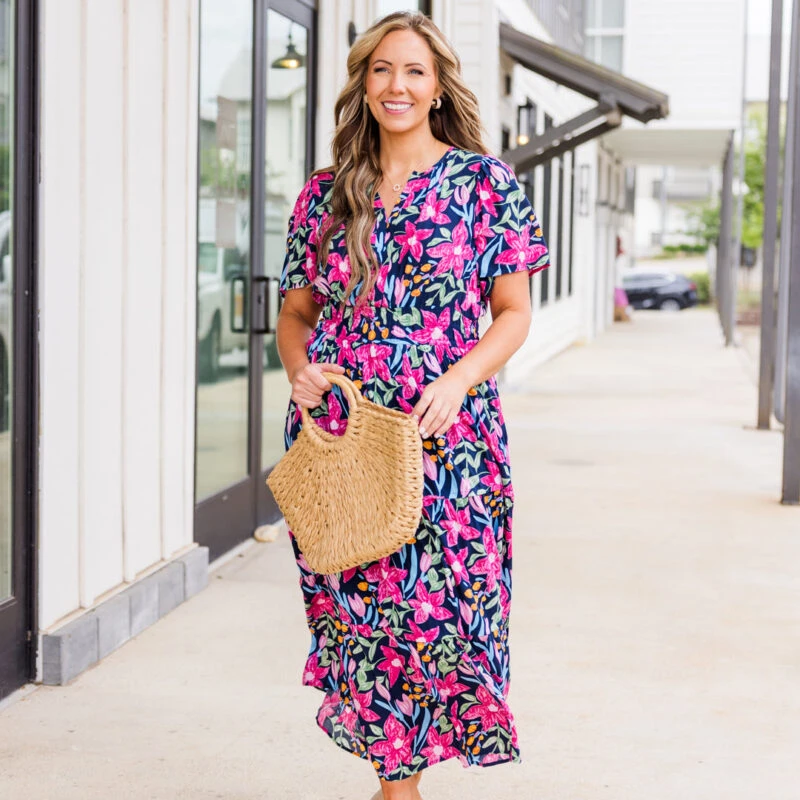 Get ready to bloom in style with our Blooming Vineyard Dress! This charming navy dress boasts a tiered design and a v-neckline, while the bright floral print adds a pop of color! With an elastic waistline, this dress offers both comfort and style!