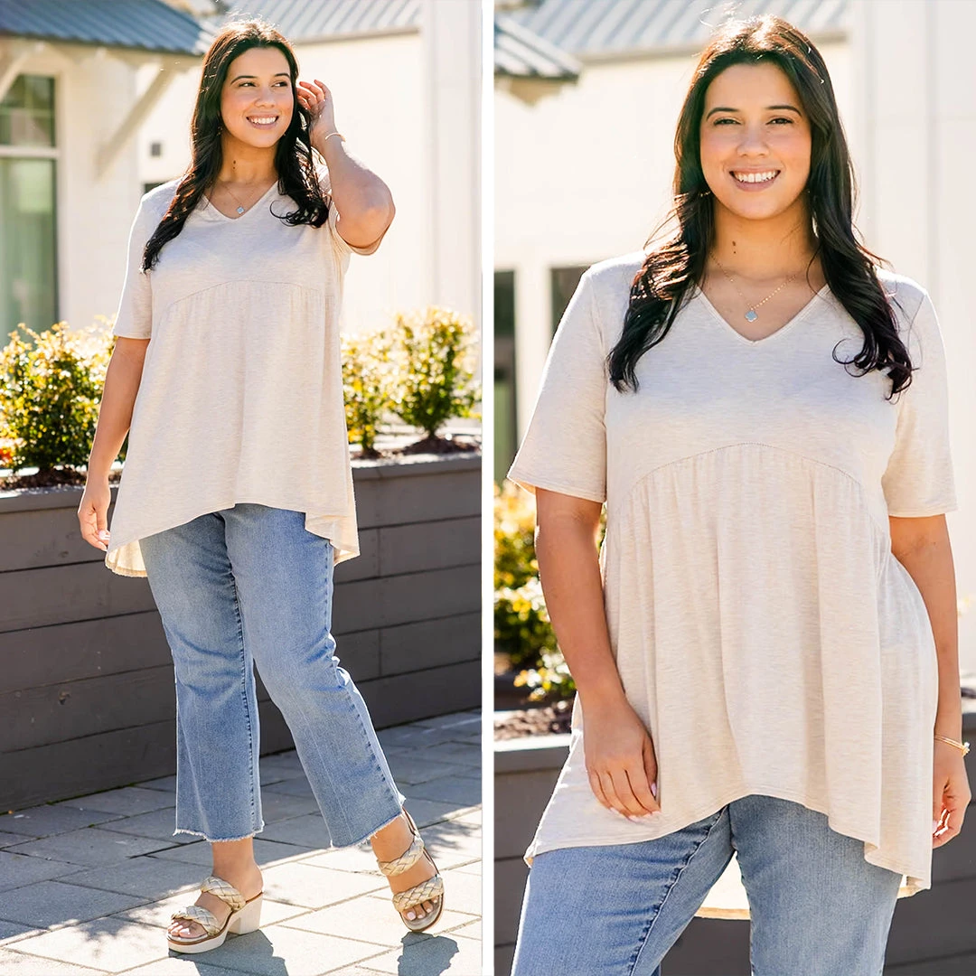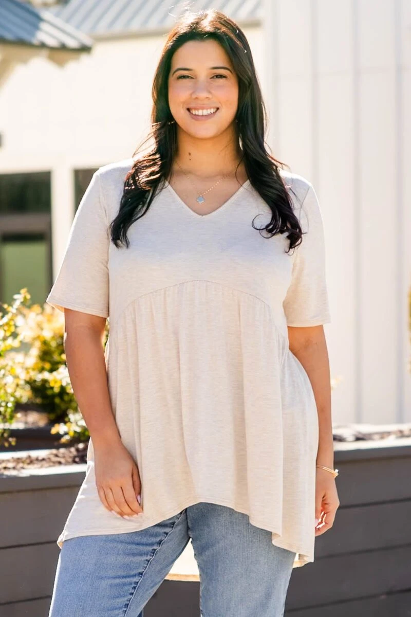We are so in love with this top! This babydoll top features a flowy fit and neutral oatmeal color, combining effortlessly for a flattering and versatile look! It is a must-have in any wardrobe, offering both comfort and style! Embrace a timeless and elegant aesthetic with this top!