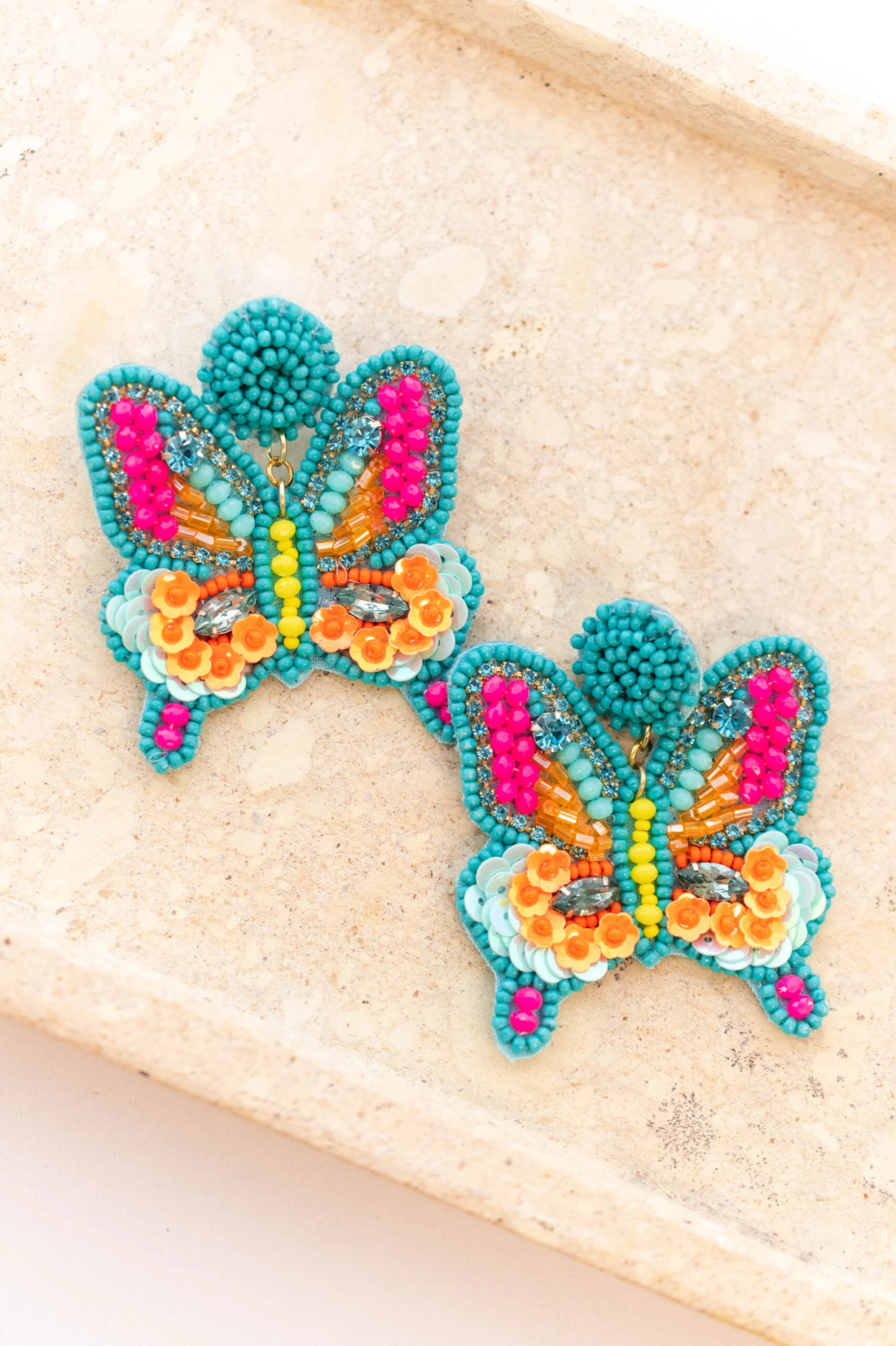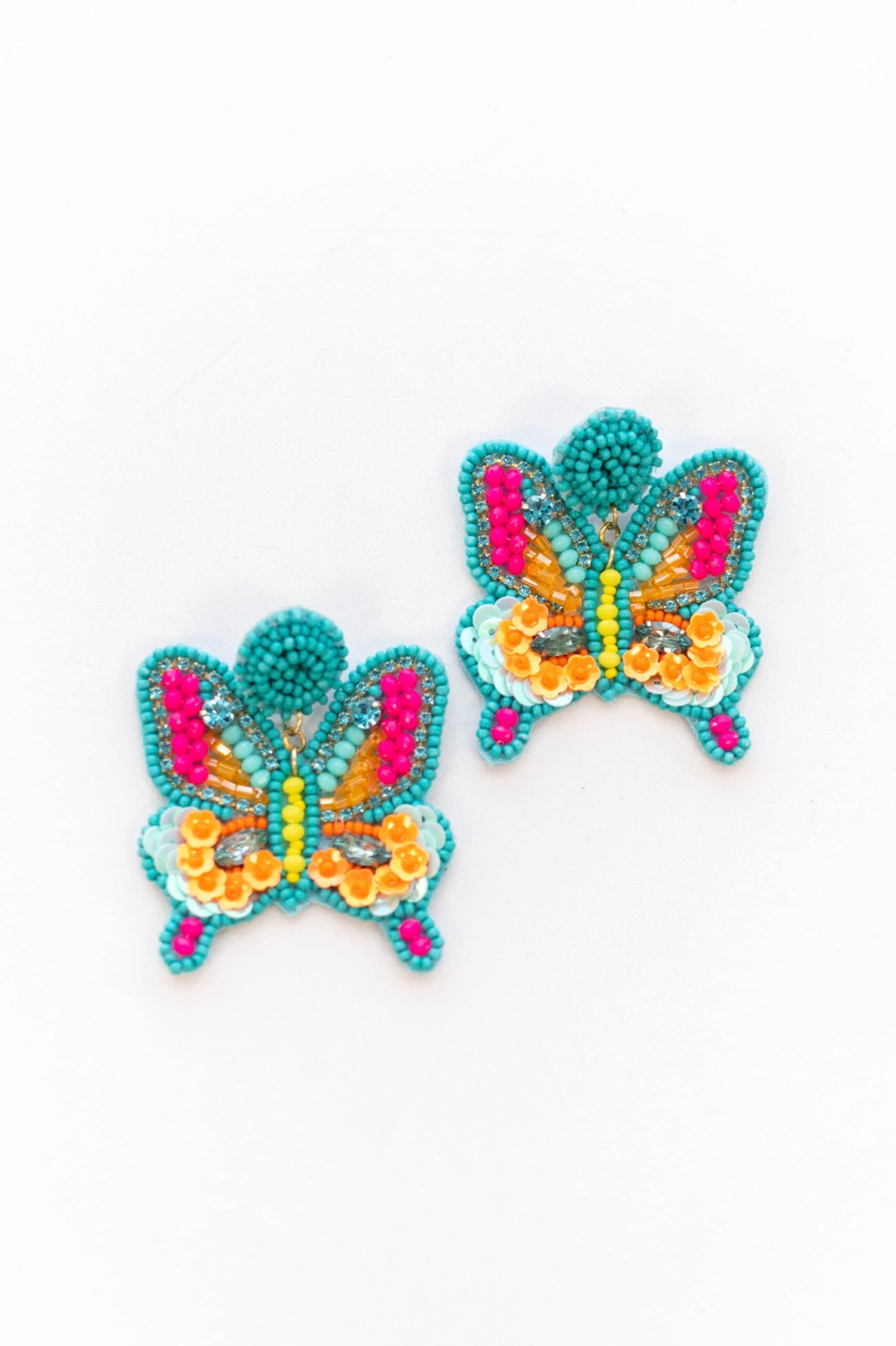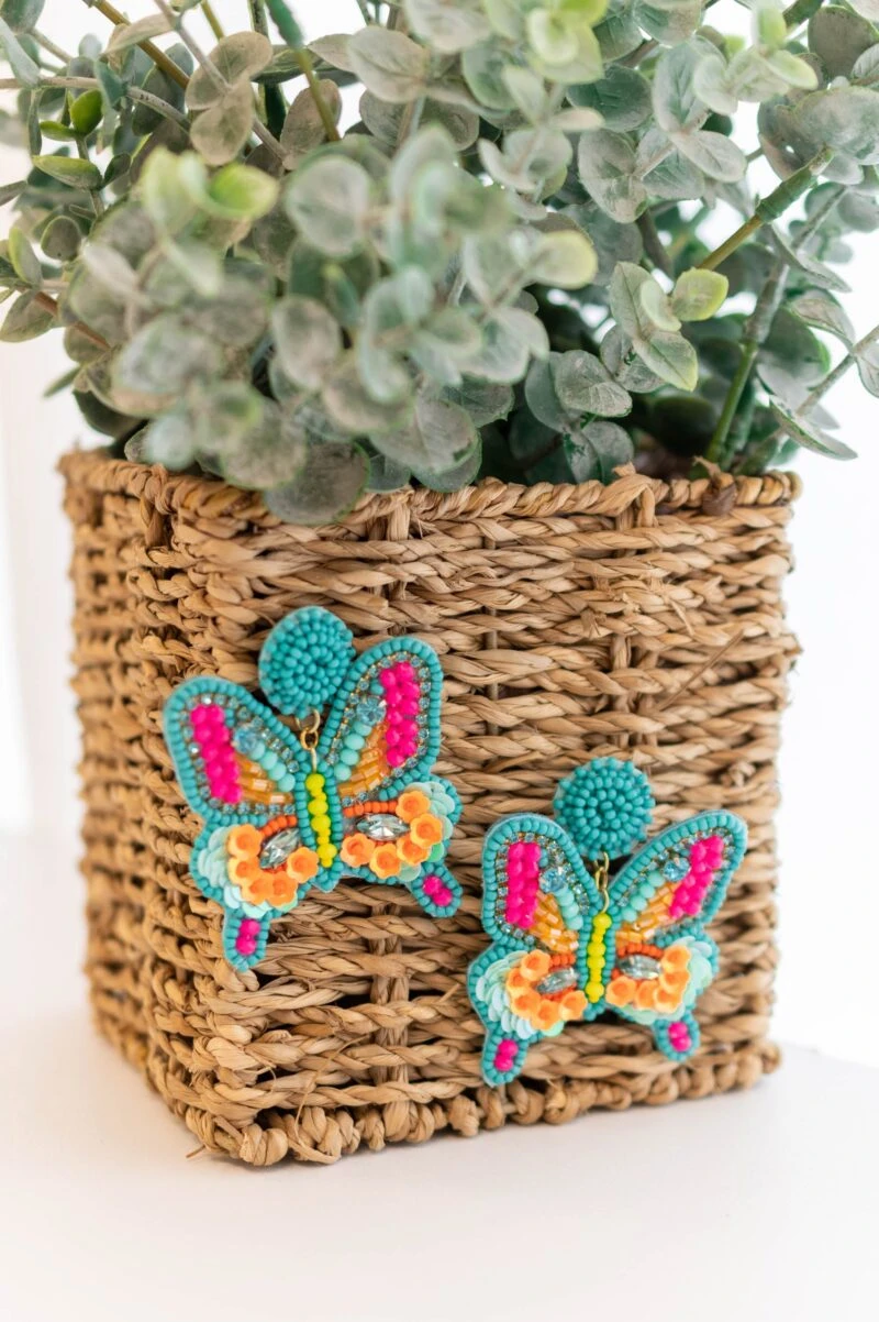 These beautiful earrings will make you blush! They have a bold teal color with a fun butterfly beaded design that is like no other! The dangle style is so easy to pair with all of your favorite dresses and tops for a classic chic look!