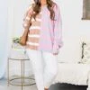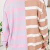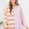 Expertly crafted with contrast stripes in shades of brown, grey, purple, and pink and exposed seam details, this sweater is a must-have for any fashion-forward individual! The drop shoulder design adds a touch of modernity, while the micro-ribbed neckline provides comfortable wear!