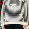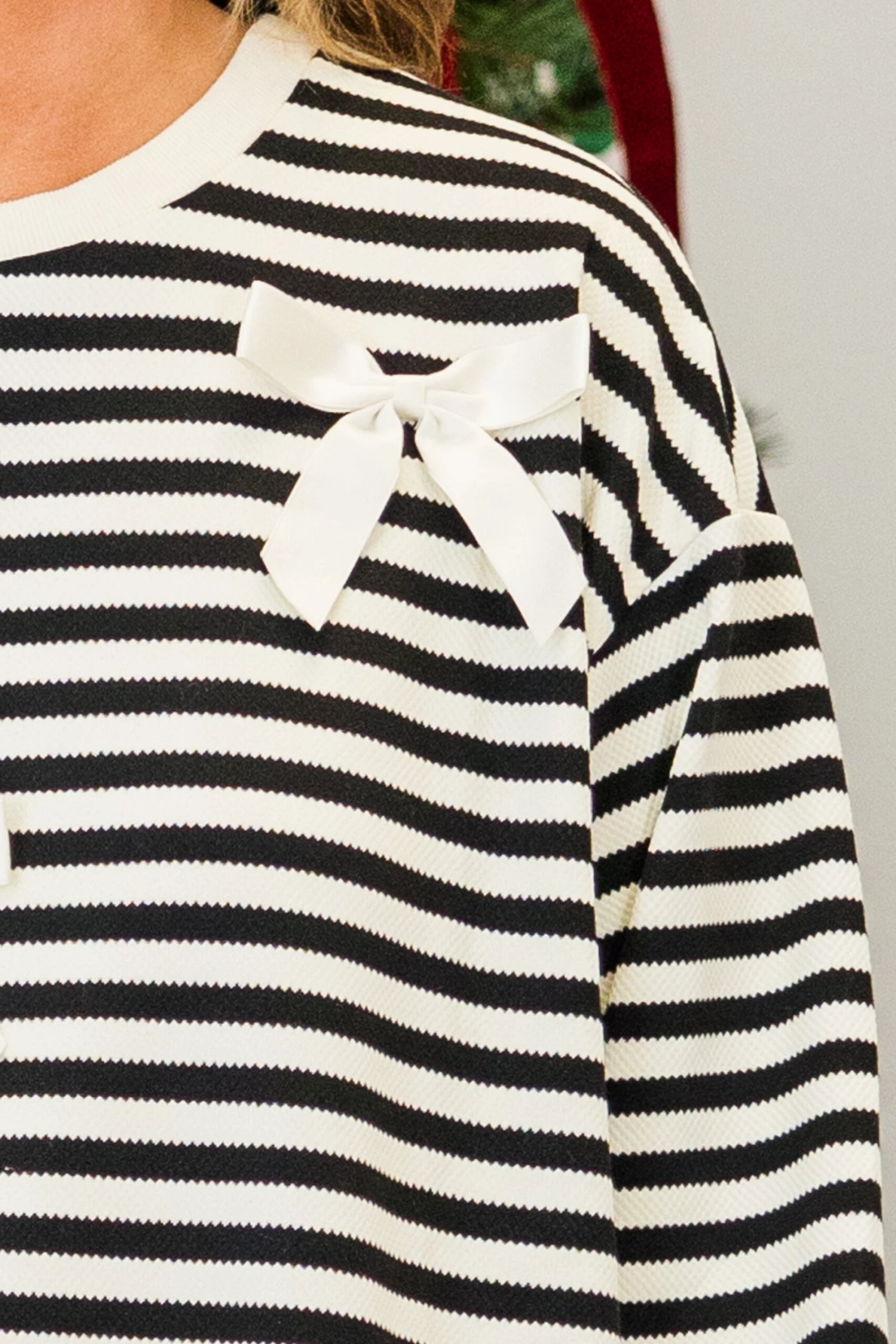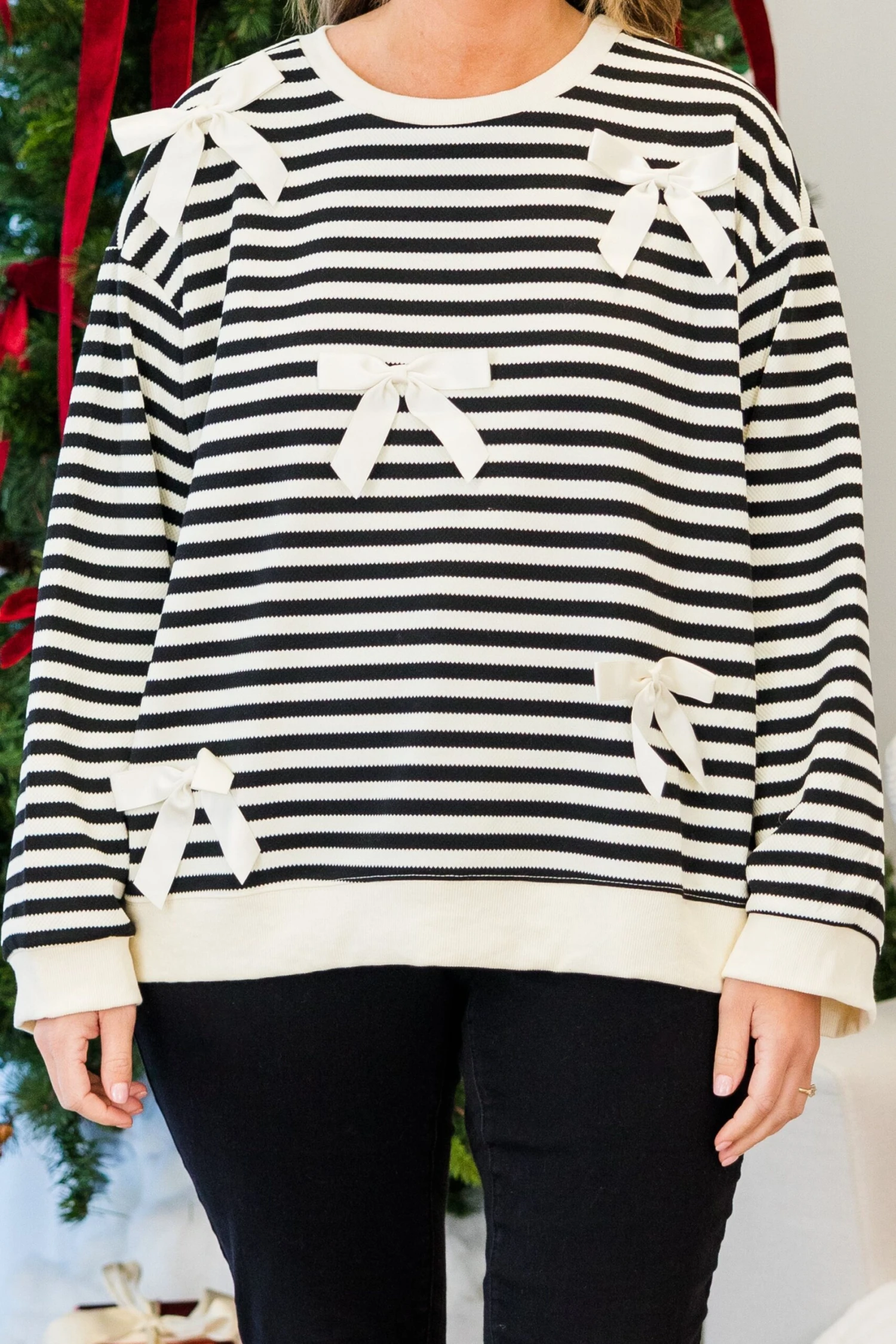 Get ready to look “bow-tiful” in this black long sleeve pullover! Perfect for any occasion, the white stripe pattern and ribbon bow detailing add a touch of elegance! With a round neckline and cuffed sleeves, this pullover is both stylish and comfortable!