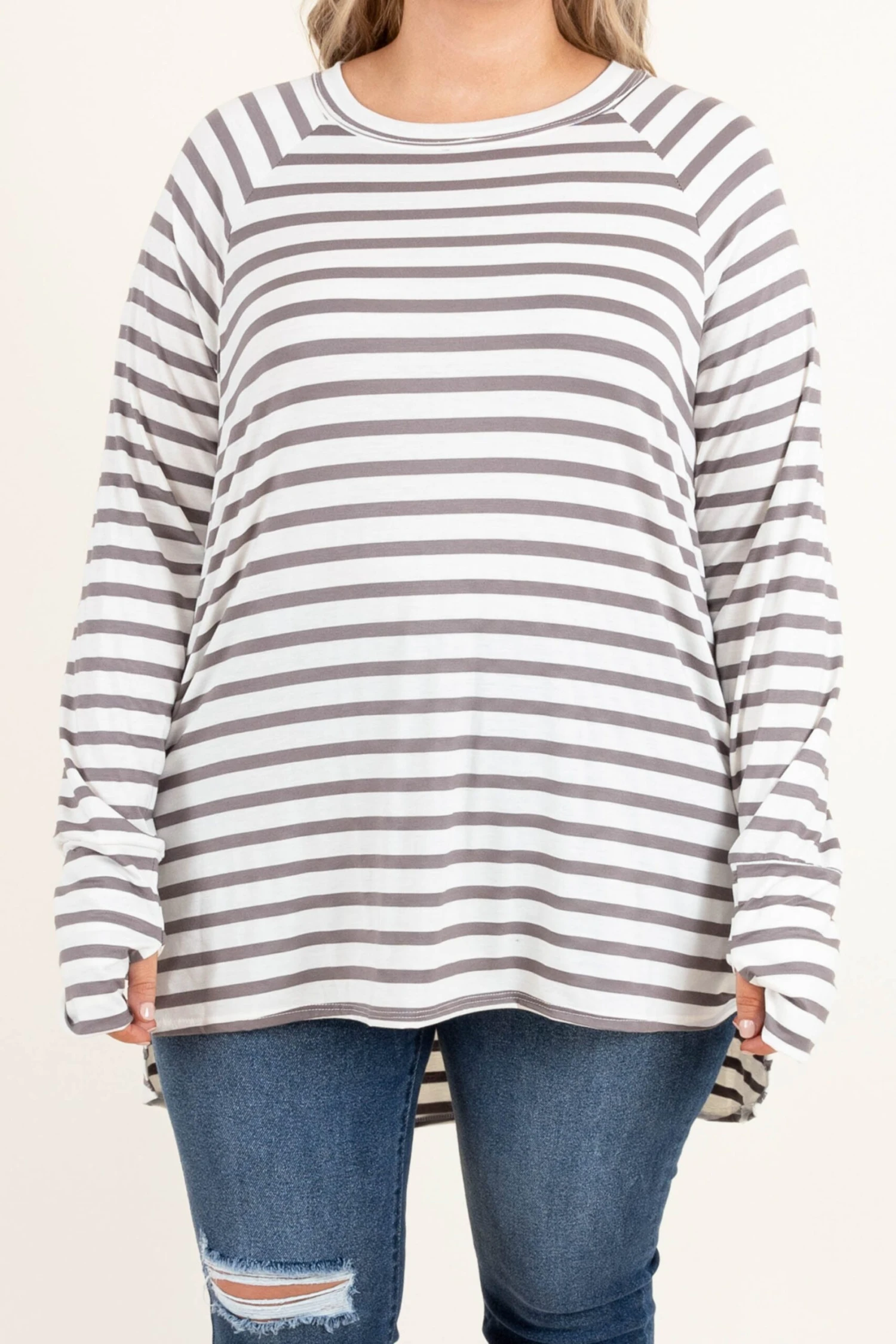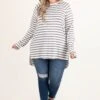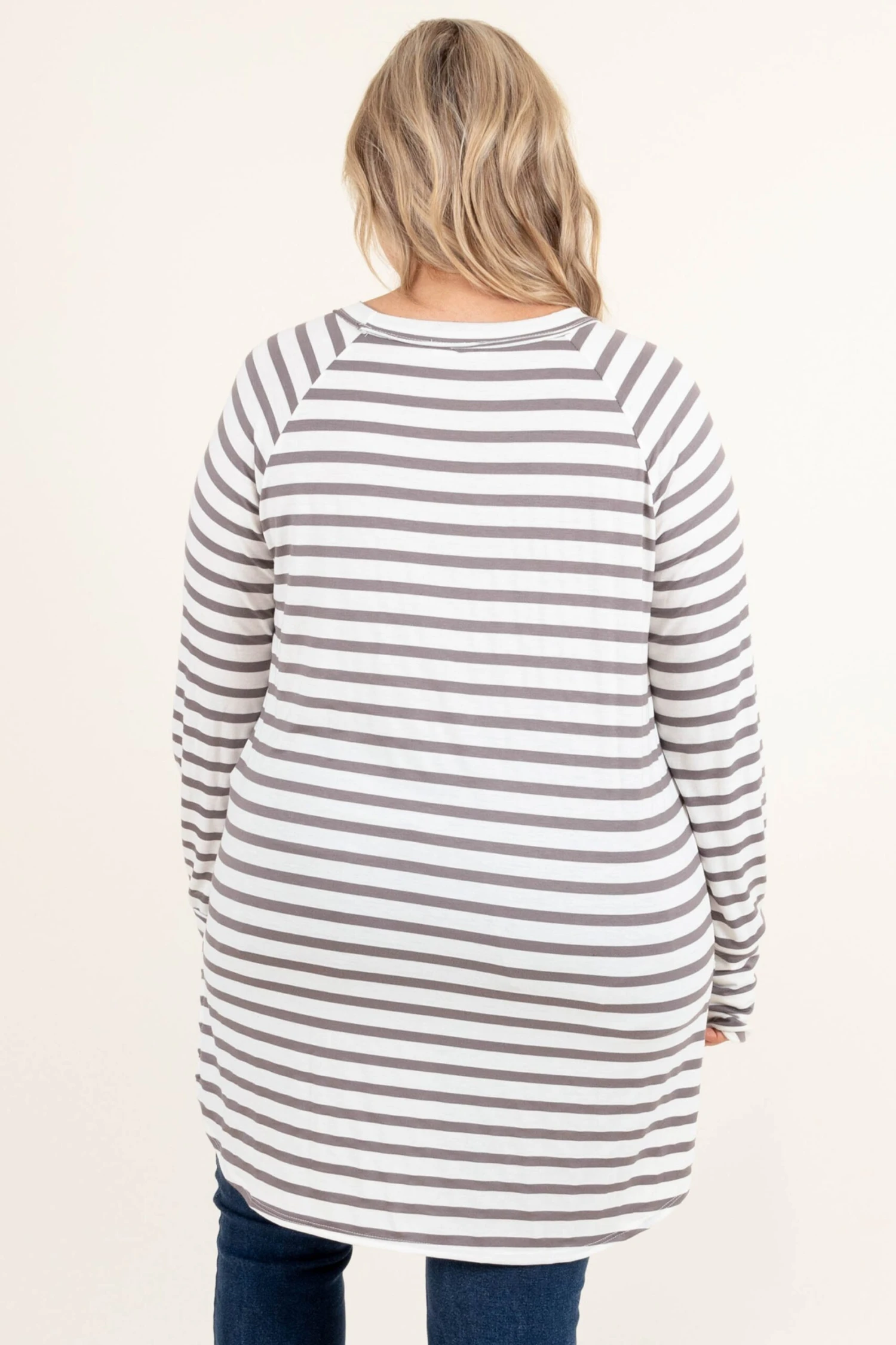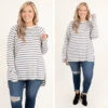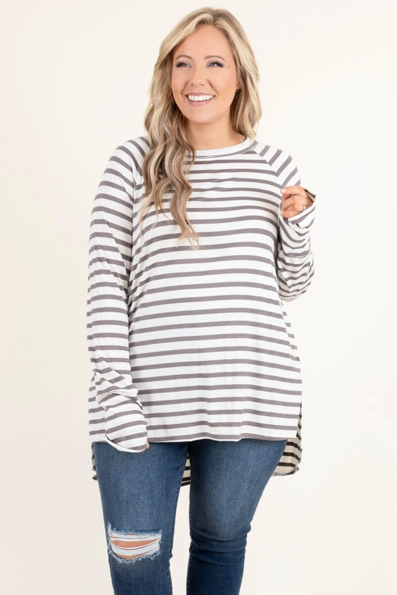 We are obsessed with this new top and we know you will be too! It has a super soft fabric and the cutest ivory and mocha stripes! Wear this beauty with skinnies and booties for a chic outfit!