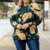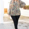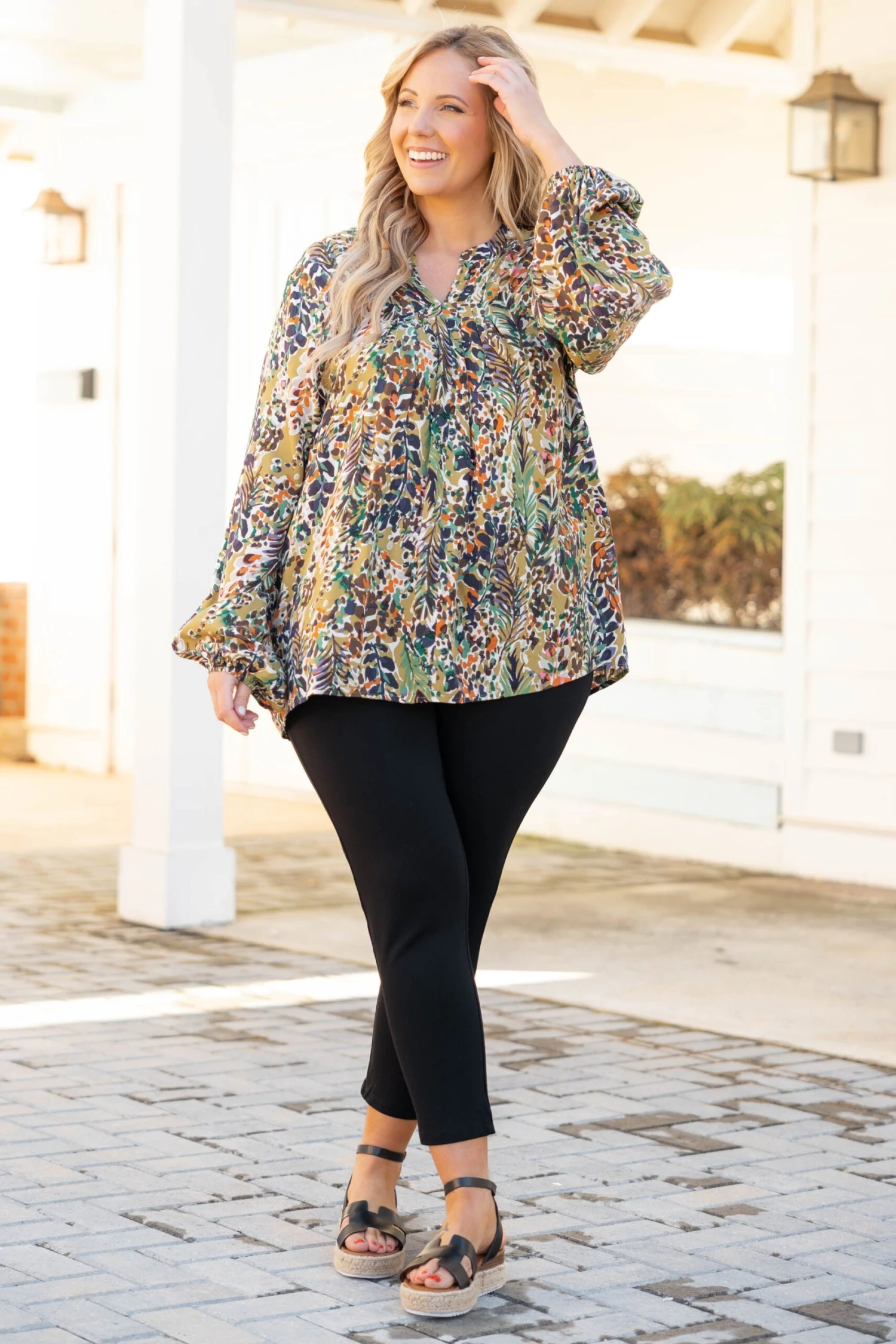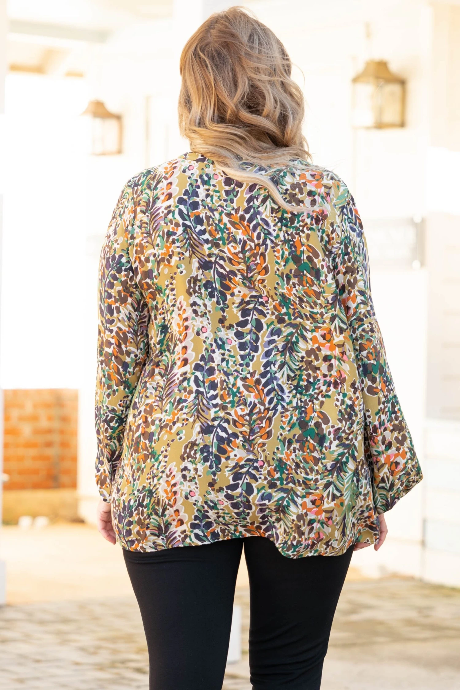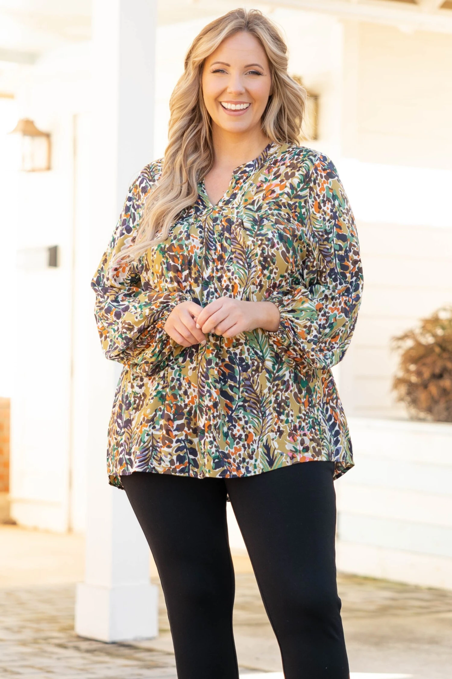 Break in the season in this trendy top! This top has a gorgeous olive color and chic floral design just in time for the season! The flowy style and figure flattering fit is perfect for all day wear! Style this top with some booties and skinnies for a classic, comfy look!Â