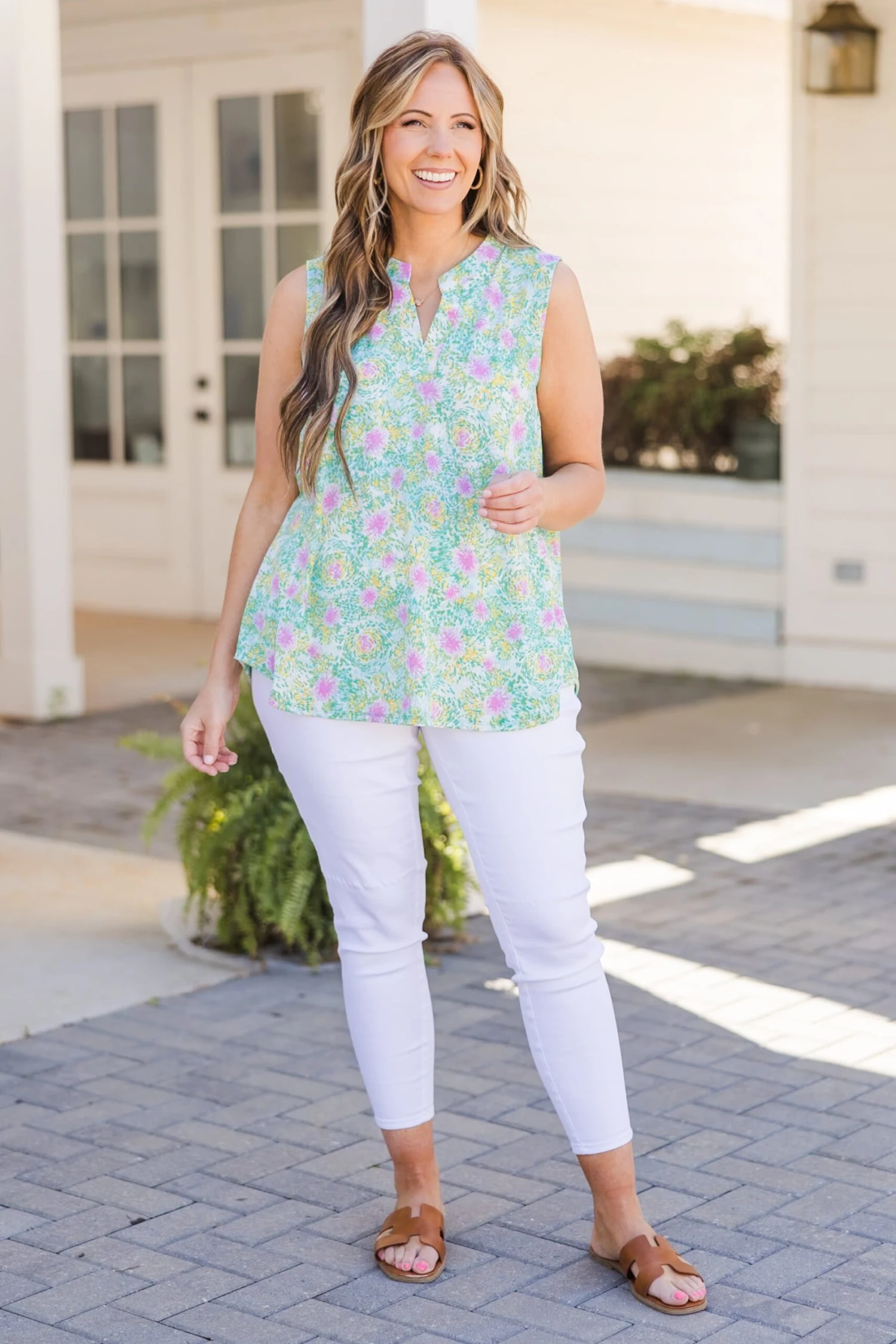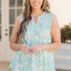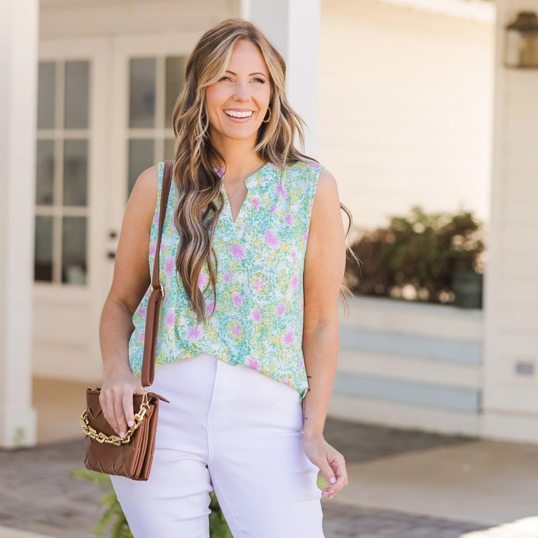 We think you’ll love this beautiful top! It features a bold mint floral pattern throughout, wrinkle free tank design, and an incredibly figure flattering fit! Perfect for any occasion, you’ll be sure to stand out and feel confident in this stylish and sophisticated piece!