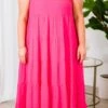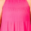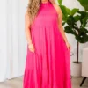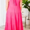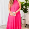 This beauty is bright on time for the season! It features a halter design and a flowy fit that perfectly complements its maxi length! The dress is made with a bold pink color that adds a touch of vibrance to your wardrobe! A must-have for any fashion-forward individual looking to make a statement!