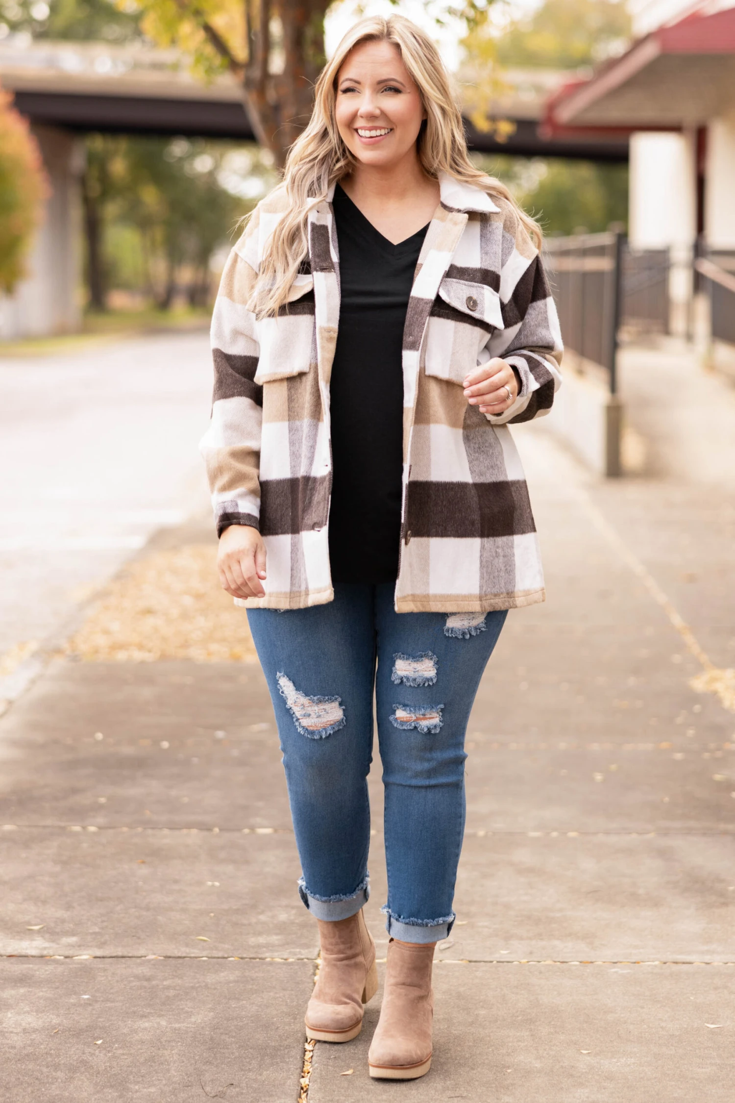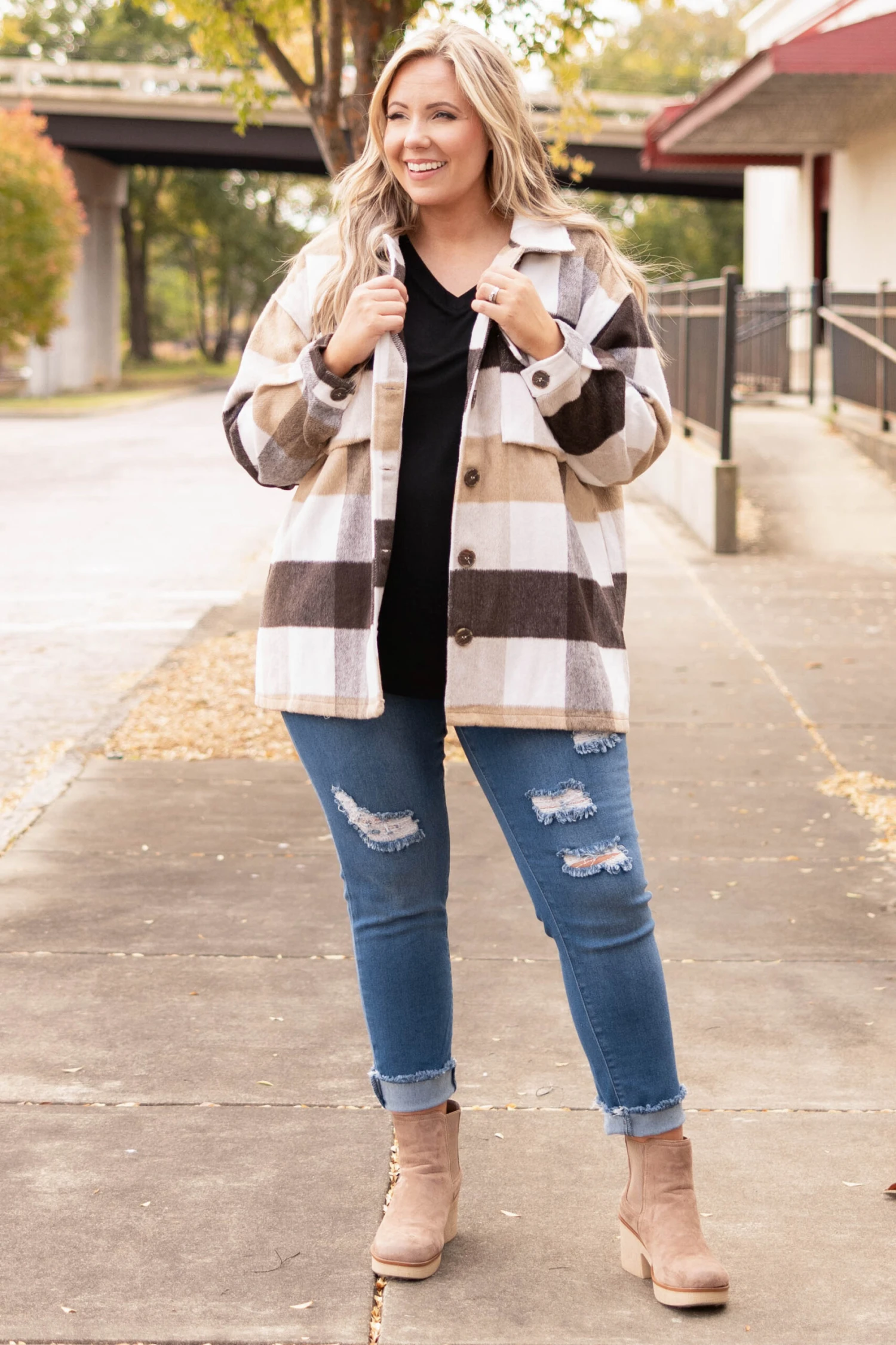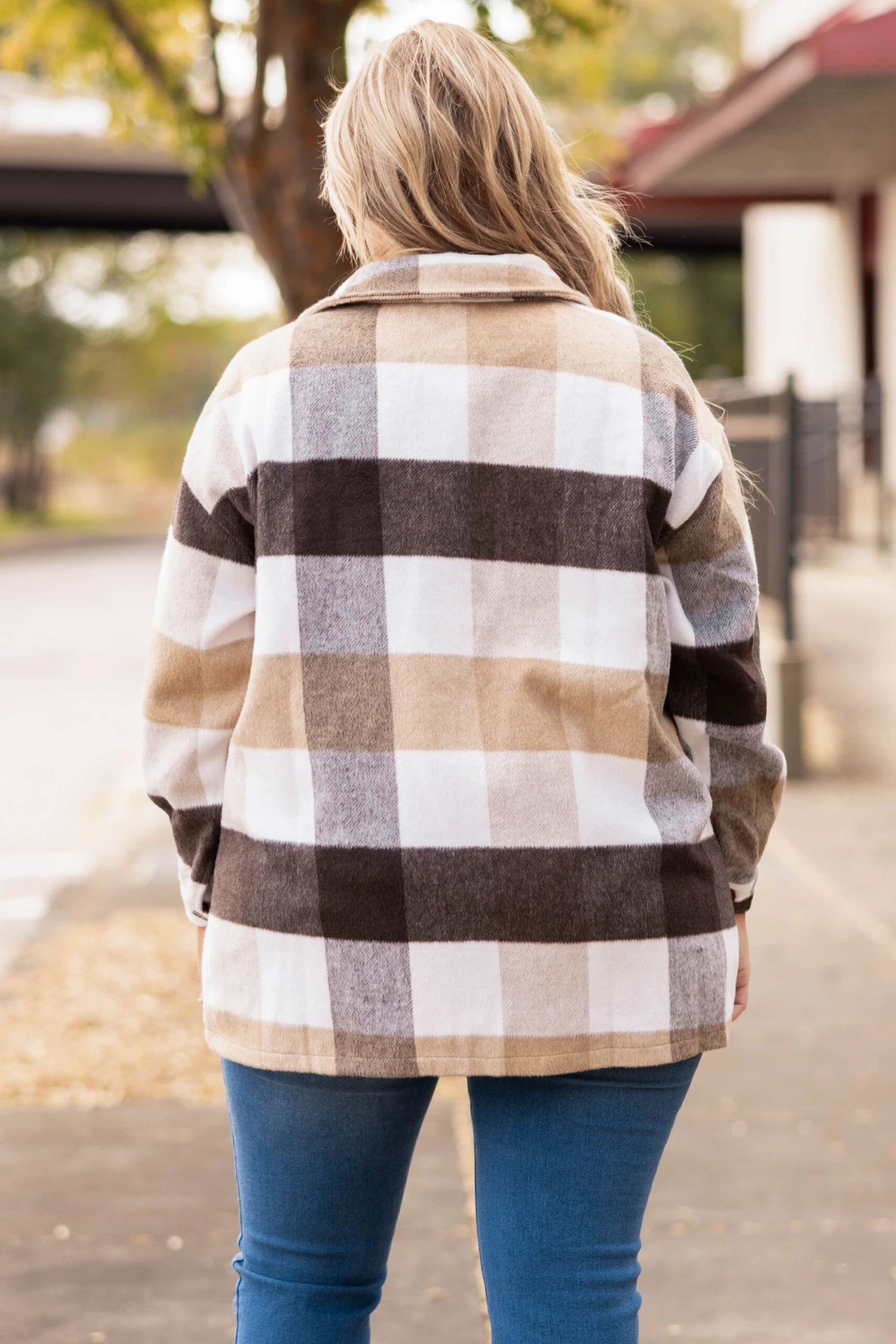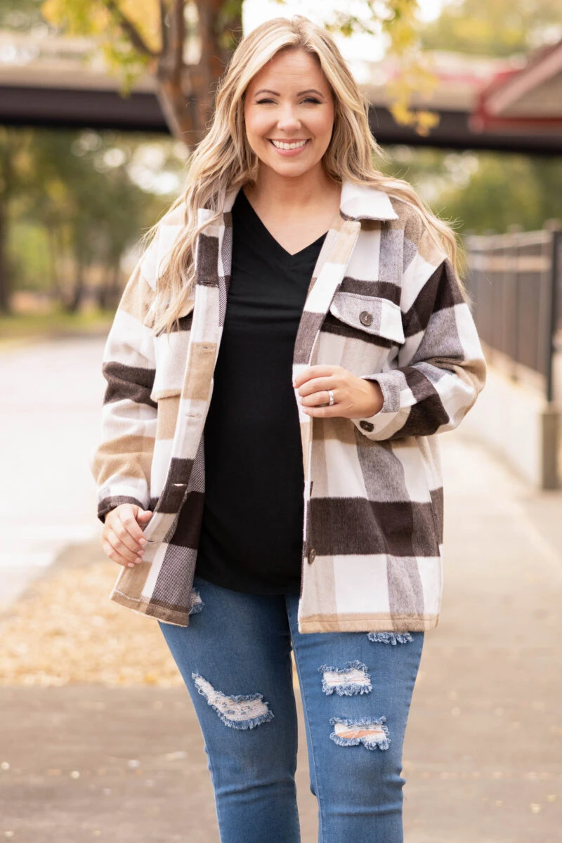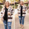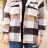 Grab this beauty for those windy days this season! This jacket has a neutral color with a plaid pattern that is super chic! The cozy, figure flattering fit is perfect for your new favorite layering piece! Style this jacket over all of your fave outfits for a trendy chic look!