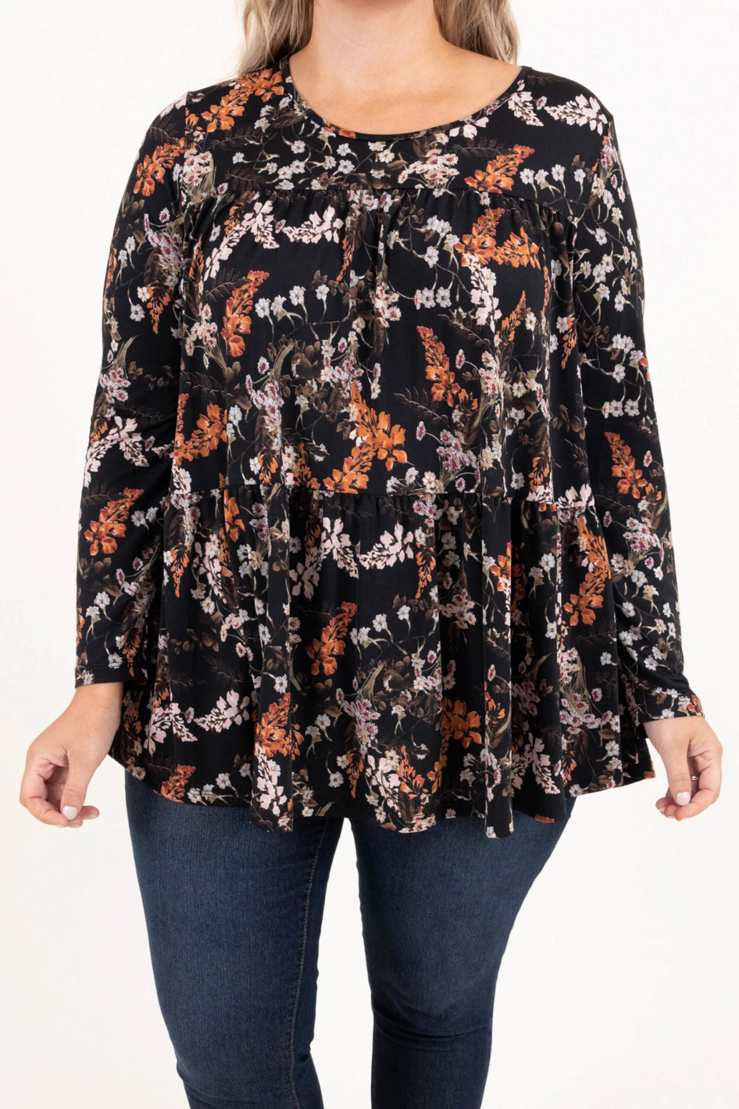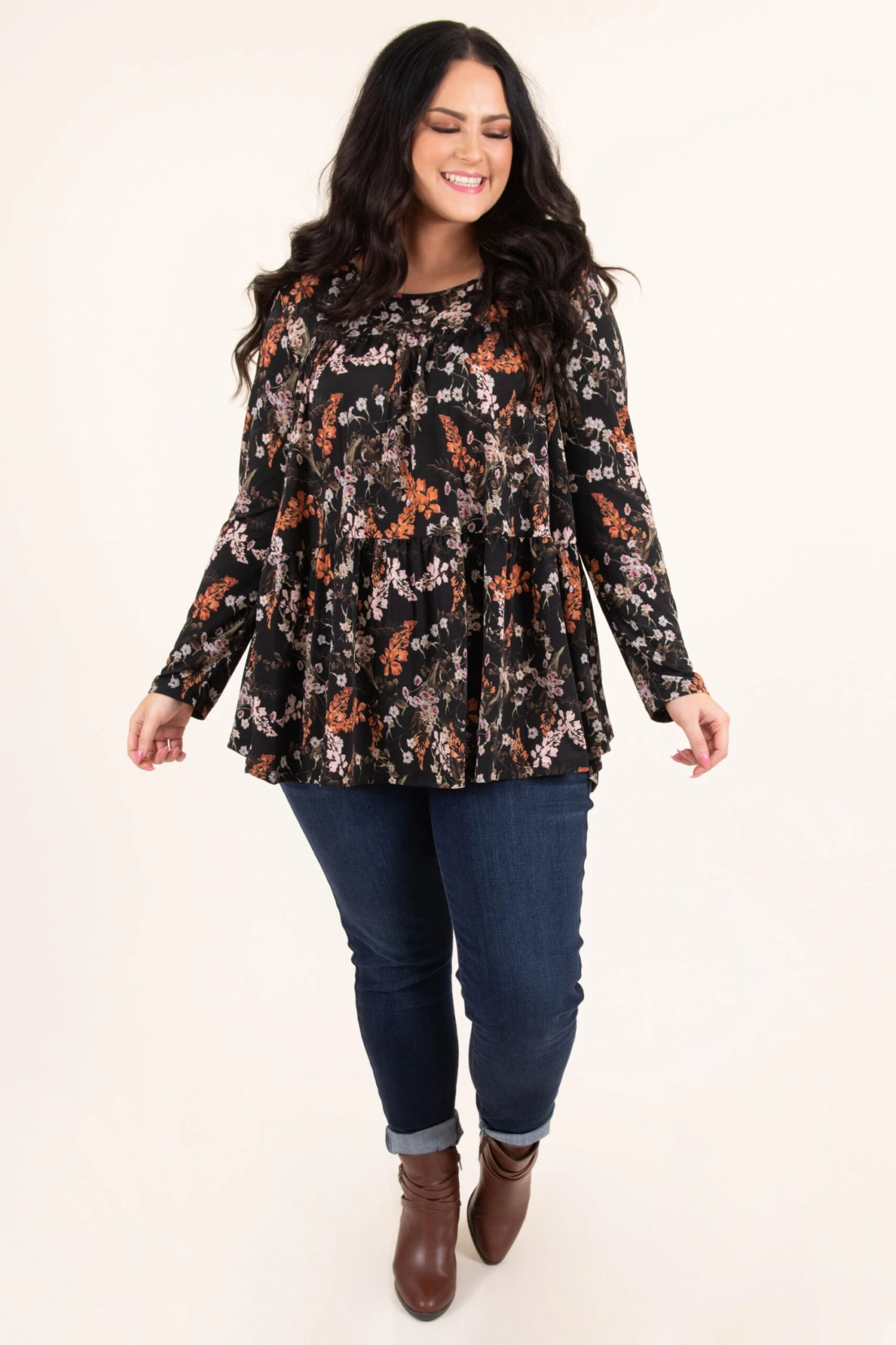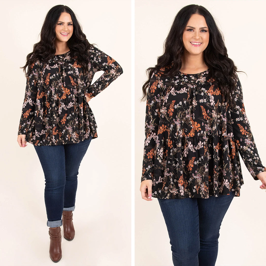 Grab this cutie to help with those brisk breezes this season! This top has a gorgeous black color with a trendy floral pattern! Dress this shirt up with some cute pants and heels or keep it casual with some skinnies and booties for a cozy, chic look!