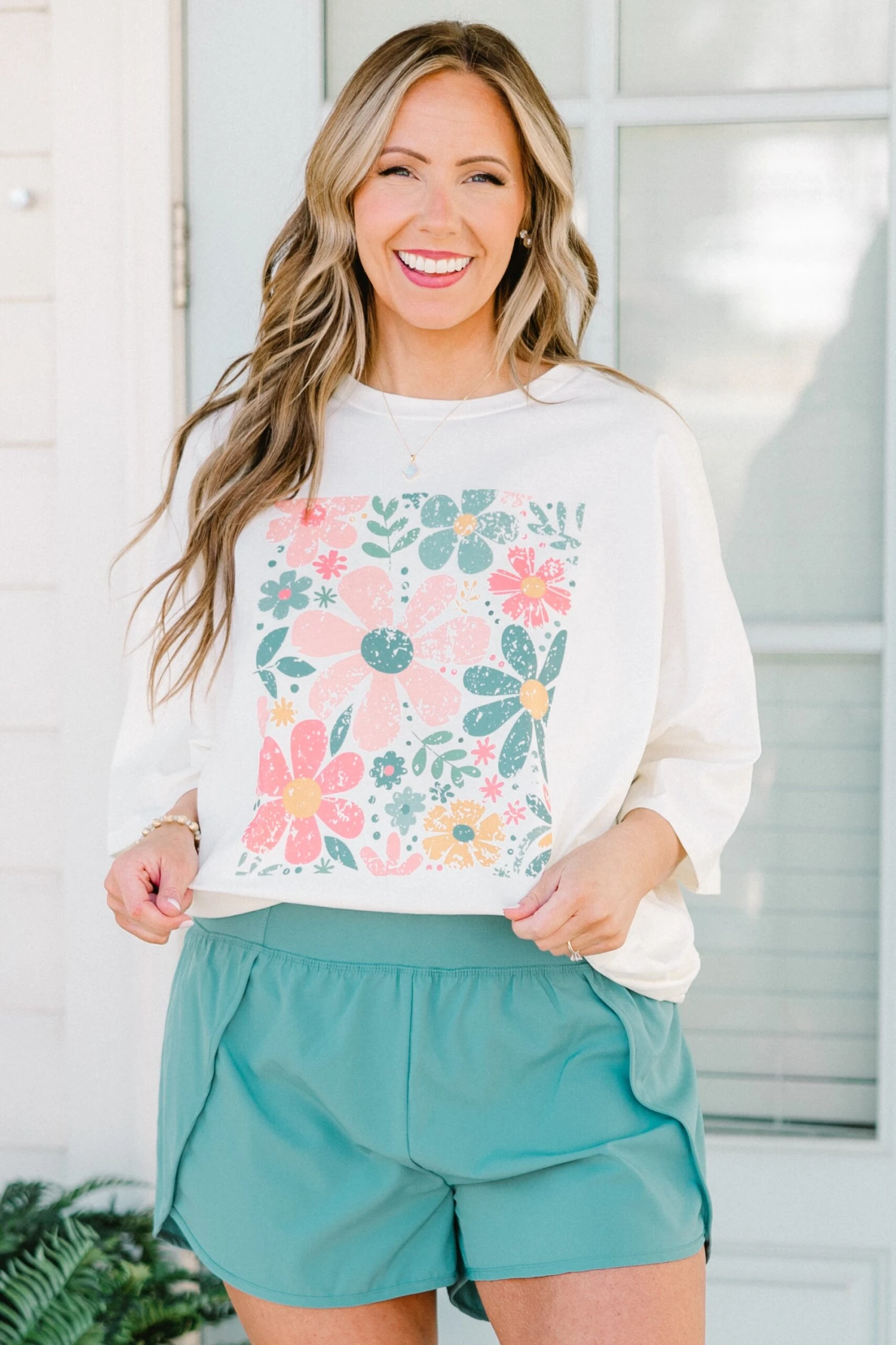Feel and look stylish in this boyfriend tee! This oversized tee features a collage of colorful flowers, perfect for adding a pop of color to any outfit! Comfortable and versatile, it’s a must-have for any wardrobe! Let your inner flower child shine with this ivory tee!