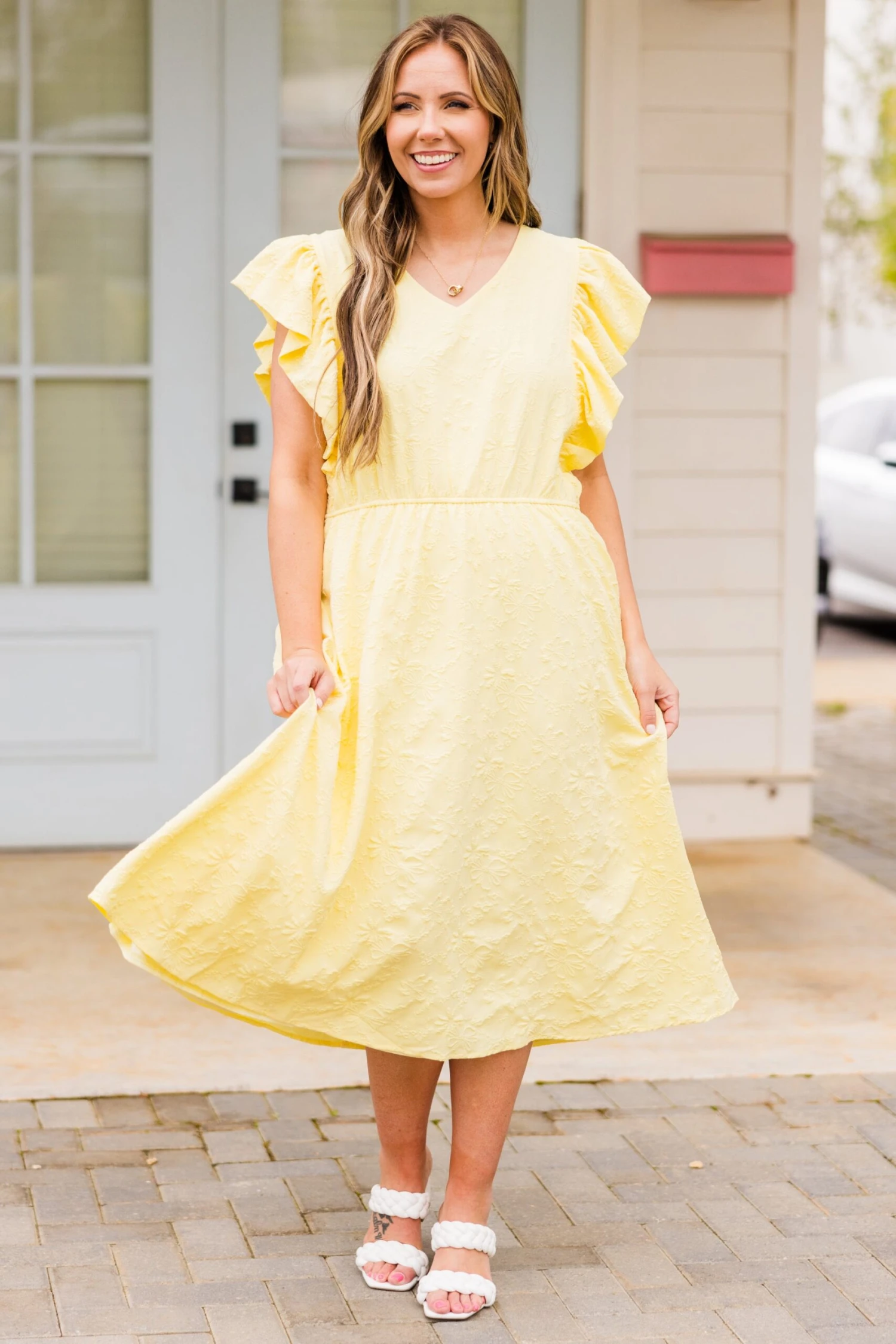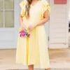 Be the life of the party in our Busy Lizzy Dress! From the textured floral material and flutter sleeves to the lovely lemon color and delicate ruffle detailing, this dress has it all! Plus, the functional pockets are super sweet! Get ready to turn heads and have some fun in this sassy, playful dress!