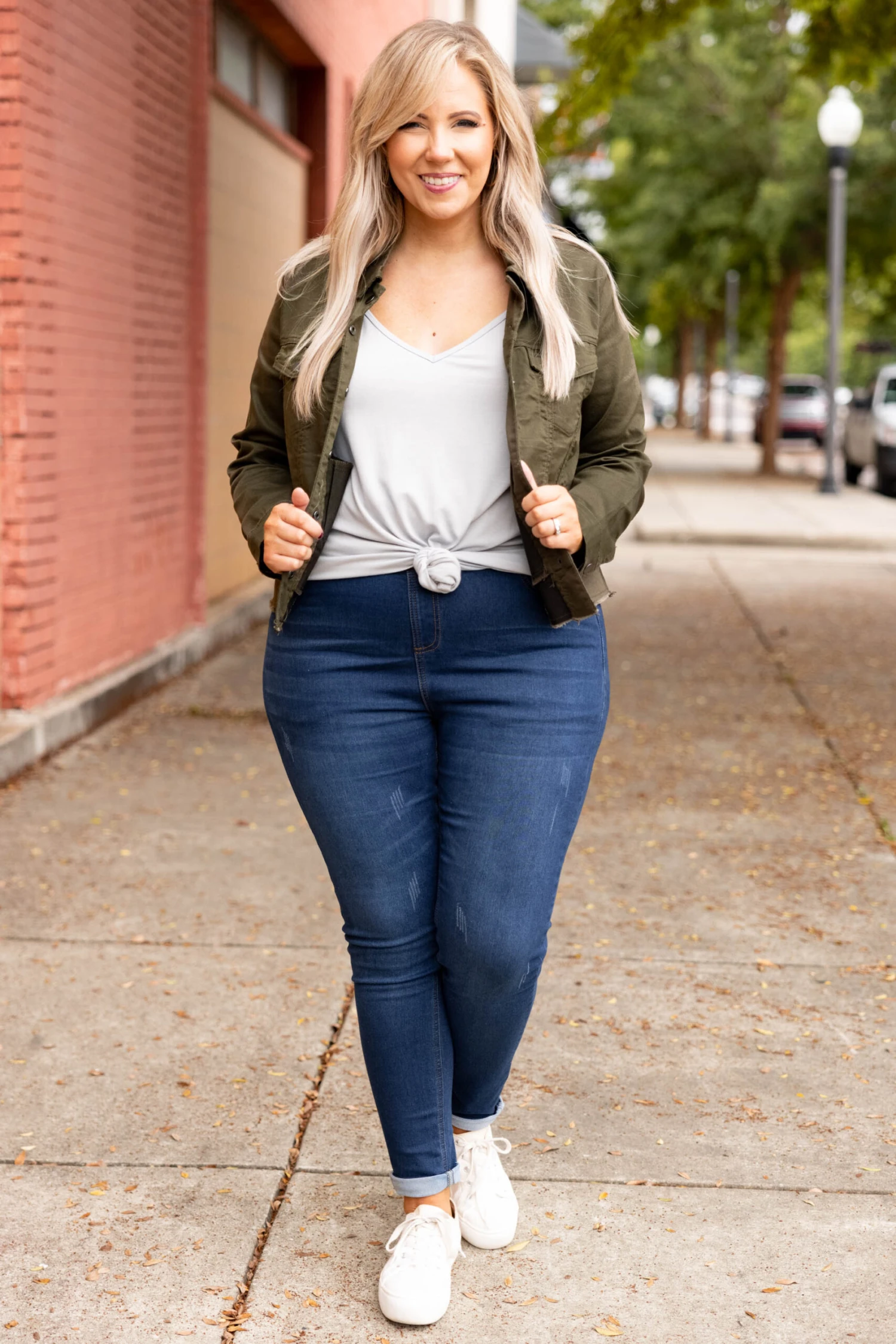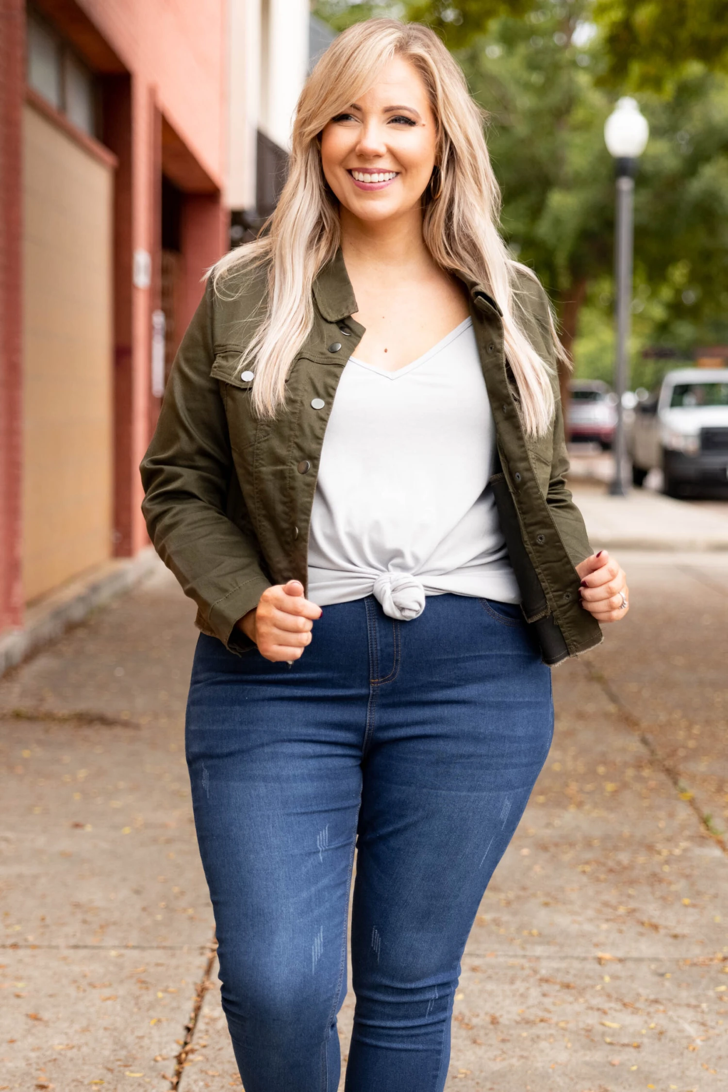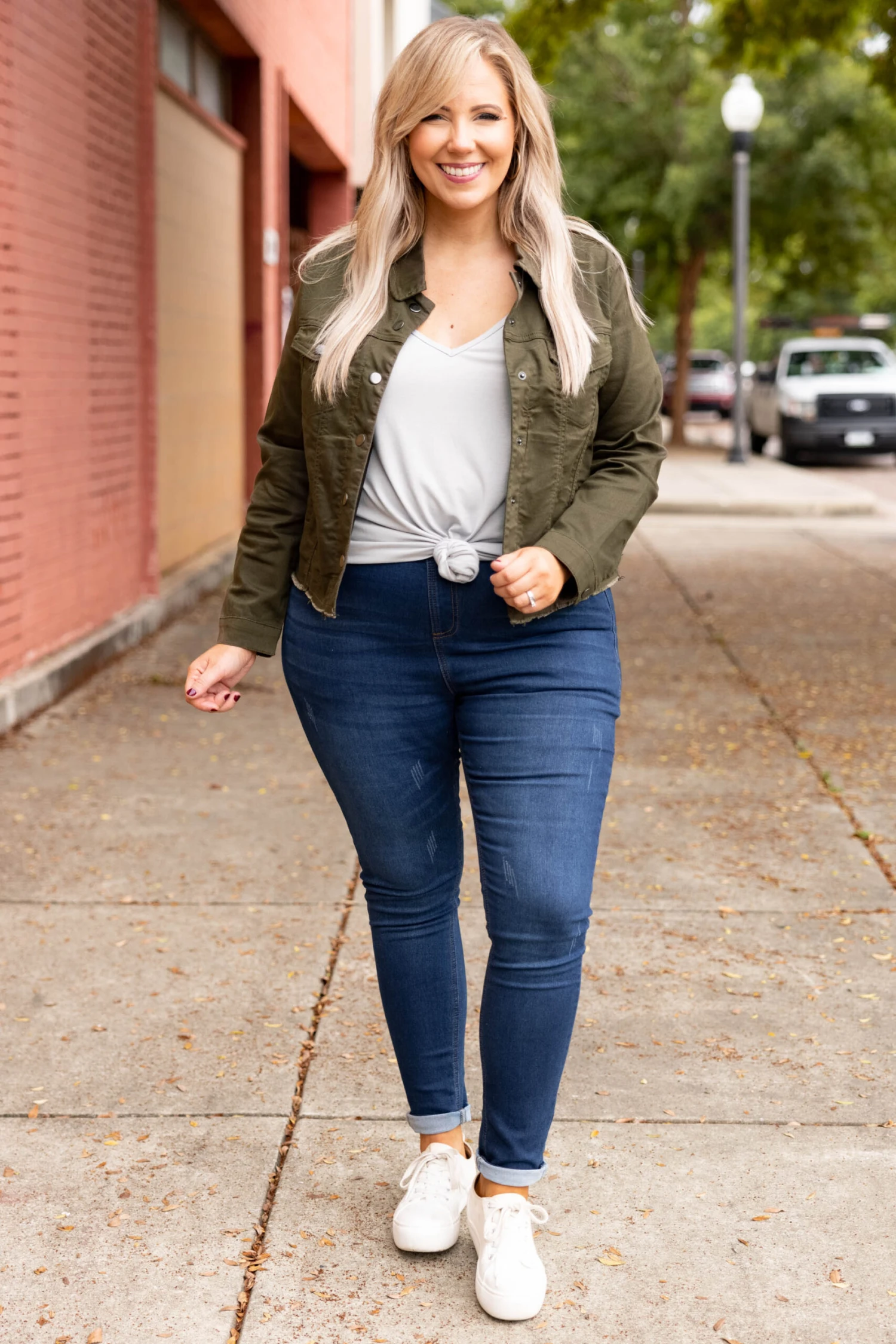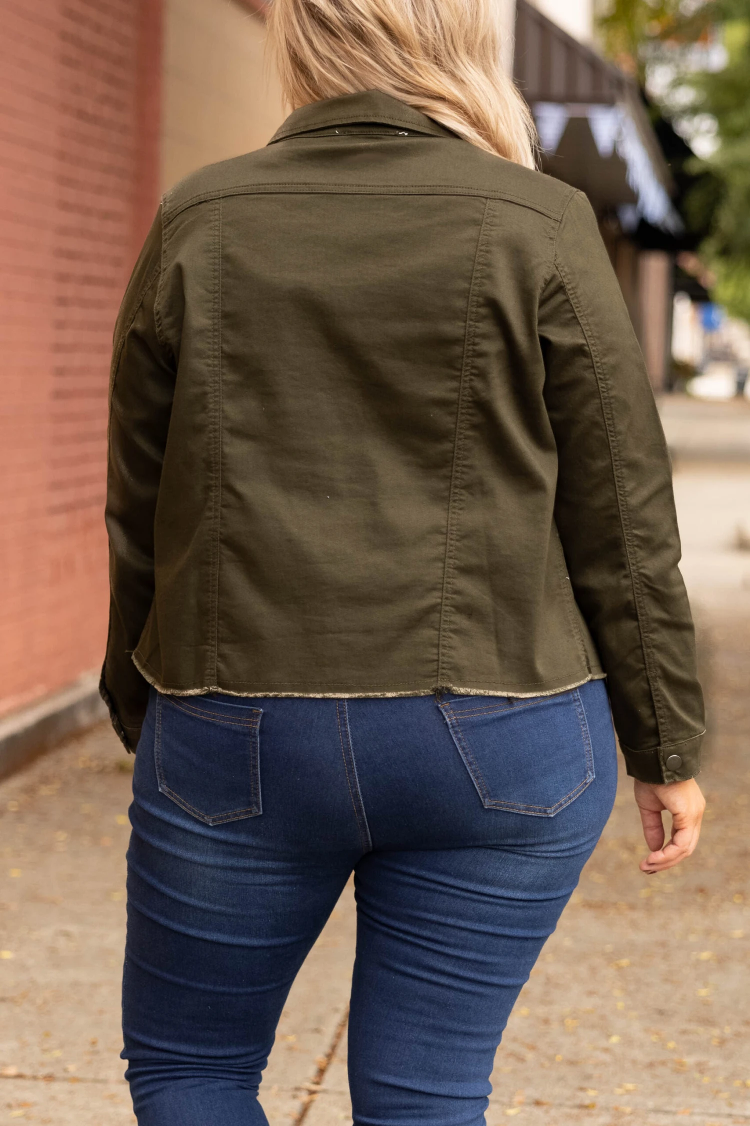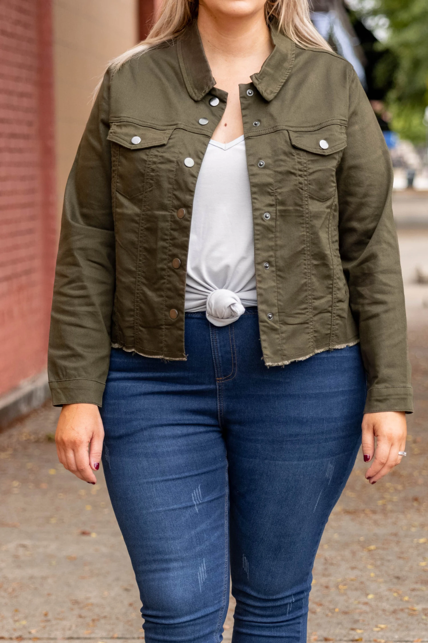 We want to see you in this chic button-down jacket! This jacket has a solid neutral color you can style with everything in your wardrobe! It’s comfortable for all-day wear, has a button-front design, and features the cutest frayed hemline! Simply, pair this jacket with a patterned top or dress for an effortlessly chic look!Â
