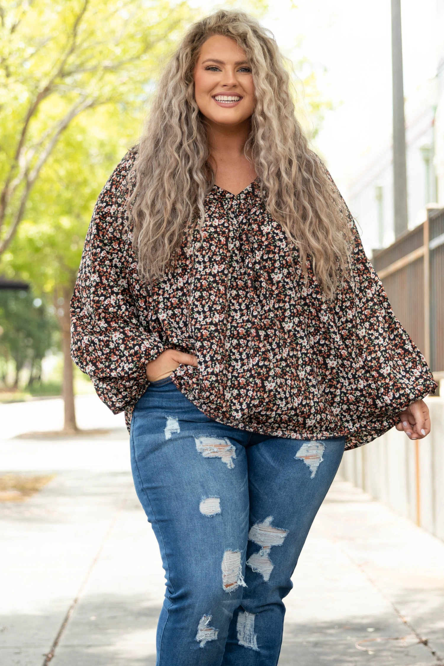 You’ll want to add this top to your wardrobe! It has a charming floral print with the perfect neutral colors for this season! Style this with your favorite pair of jeans and heels for a trendy chic look!