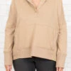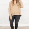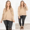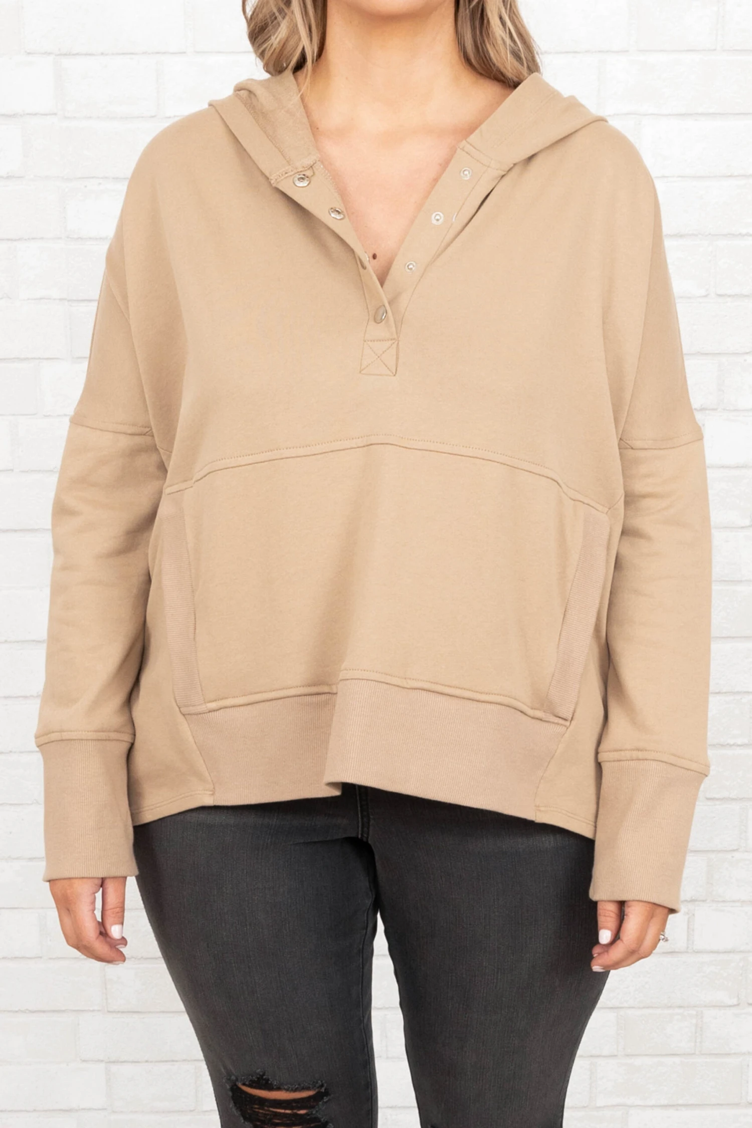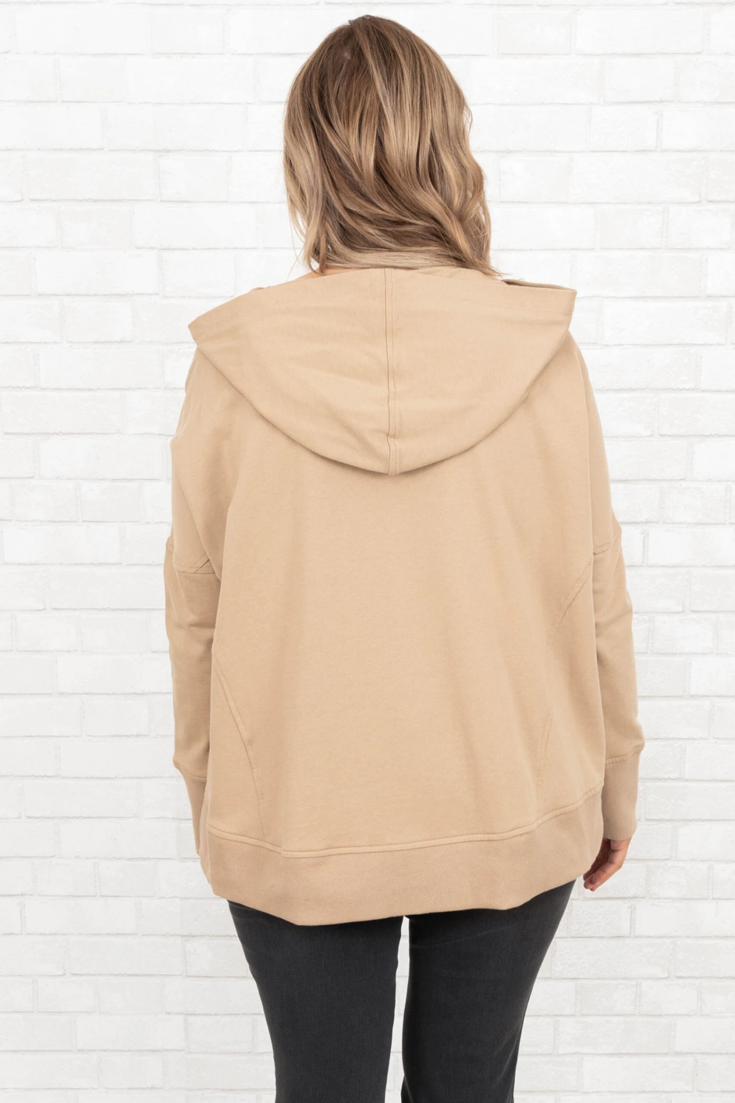 Pack this beauty for your next cabin trip! This hoodie has a neutral khaki color that is so easy to pair with all of your faves! The comfy, figure flattering fit is perfect for all day wear! Style this hoodie with some skinnies or leggings for a cozy, chic look!