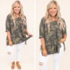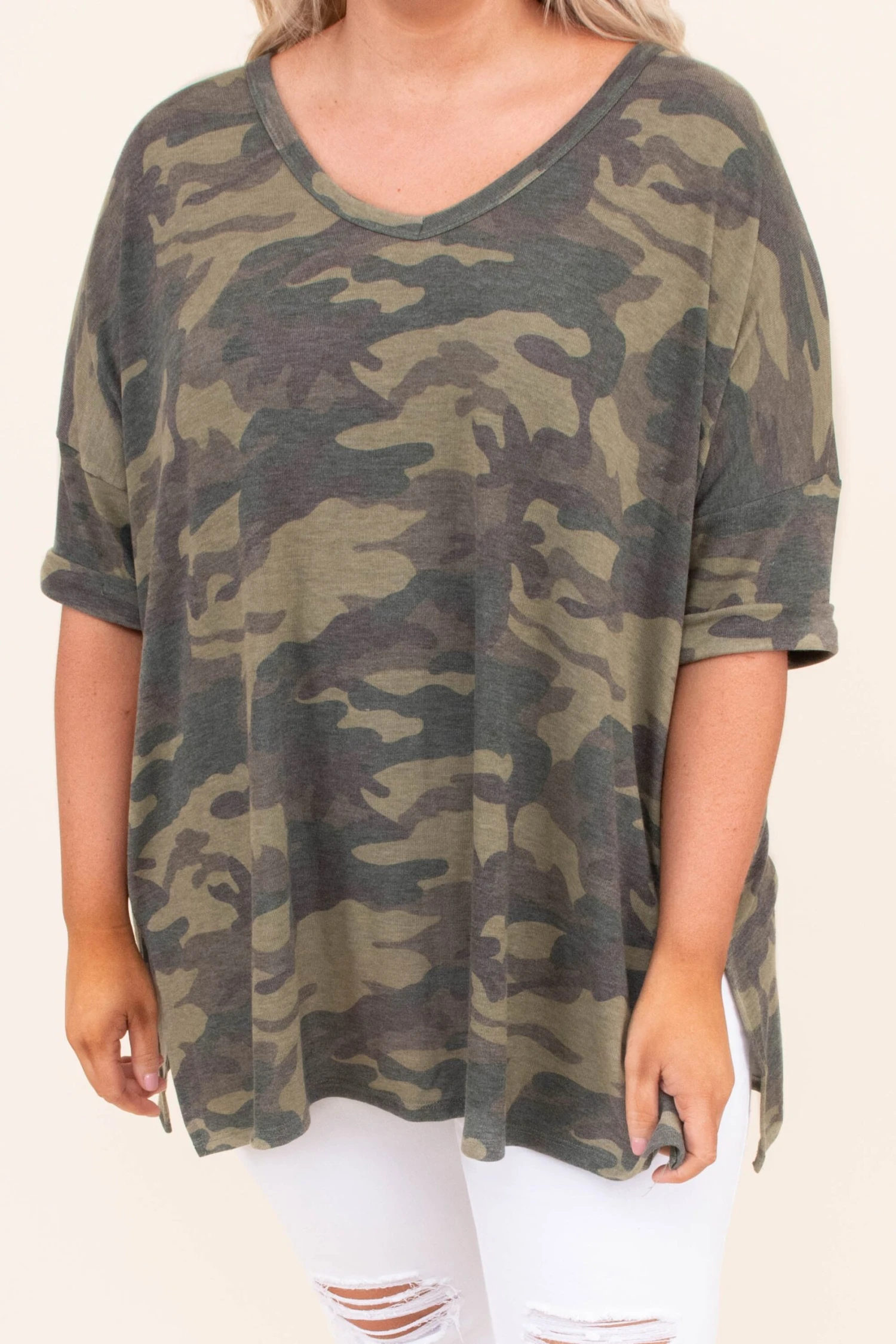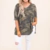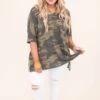 Camo for the win! This top is so on trend and perfect for an easy throw on out the door look! It is comfortable for all day wear, has an over sized fit to flatter every figure, and features a split side seam and v-neckline for the ultimate look! Pair this top with your favorite denim and sneakers a chic and edgy look!
