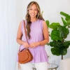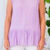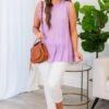 Look and feel beautiful in this gorgeous tank! This top features ruffled armholes and neckline for added detail, a flowy fit for all-day comfort, and a pretty purple color! It’s perfect for pairing with skinnies for a casual yet stylish look!