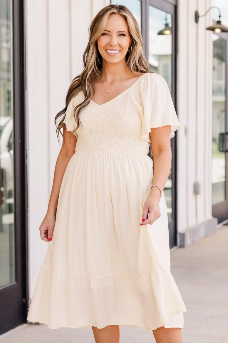 Your beauty can’t be outdone in this FAB dress! Featuring elegant puff sleeves, functional pockets, and neutral cream color, and a flattering smocking detail on the back, this dress is a must-have for any fashion-forward individual! Make a statement in this stunning pink dress wherever you go!