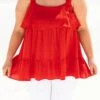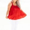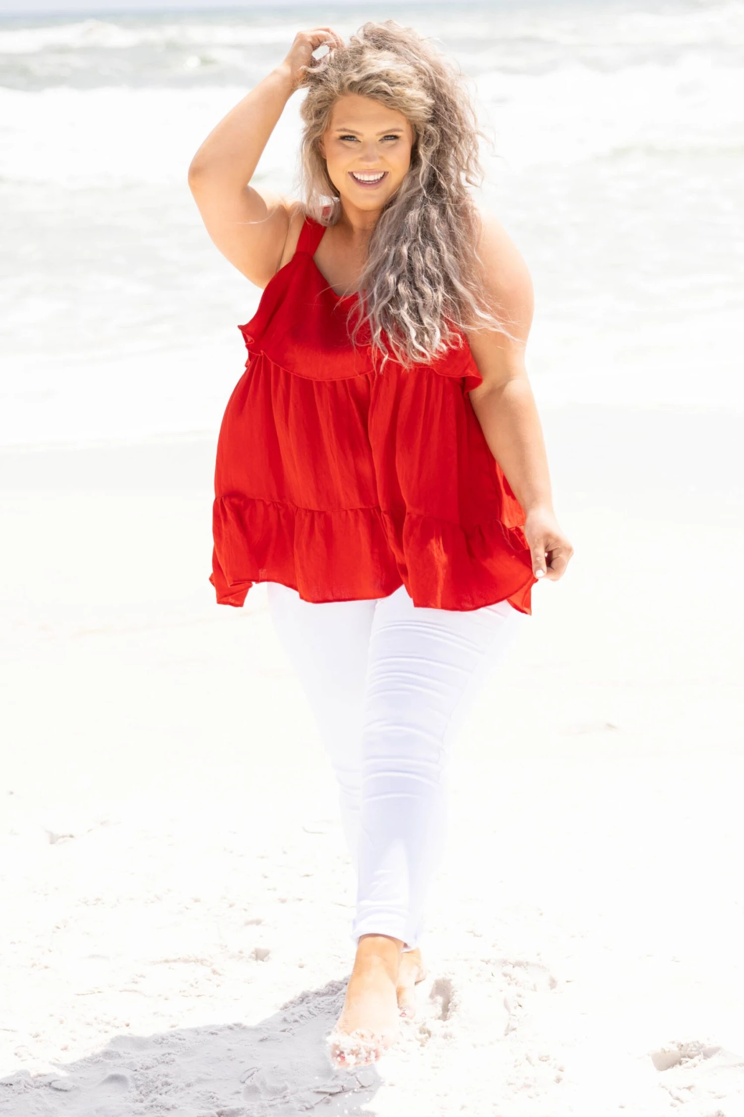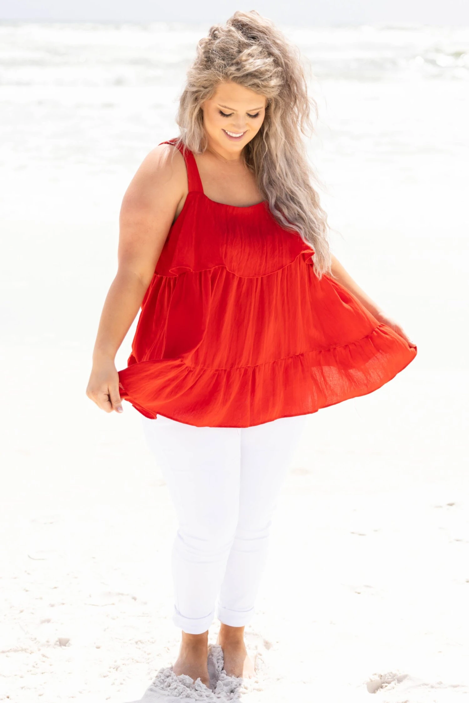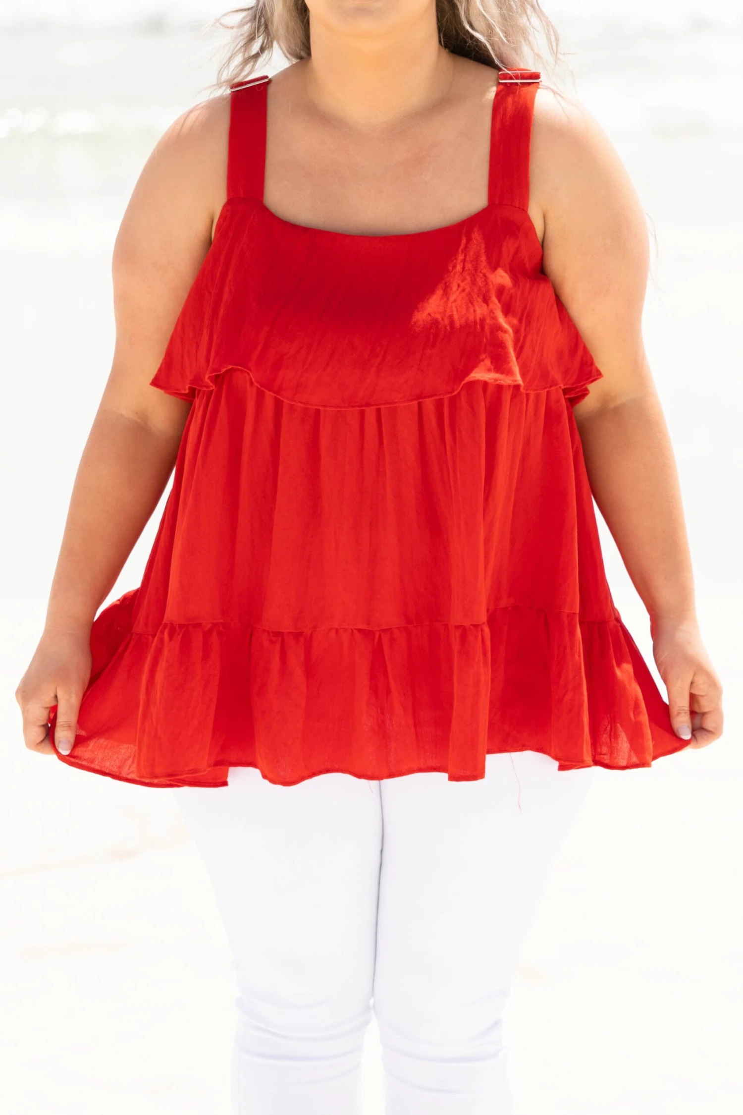 You will burn brighter than a candle in the sun in this tank! The red color is deliciously bold and the tiered style will look good on anyone! The straps adjust so you can have the perfect fit! Style this with skinnies and sandals for a super cute look!