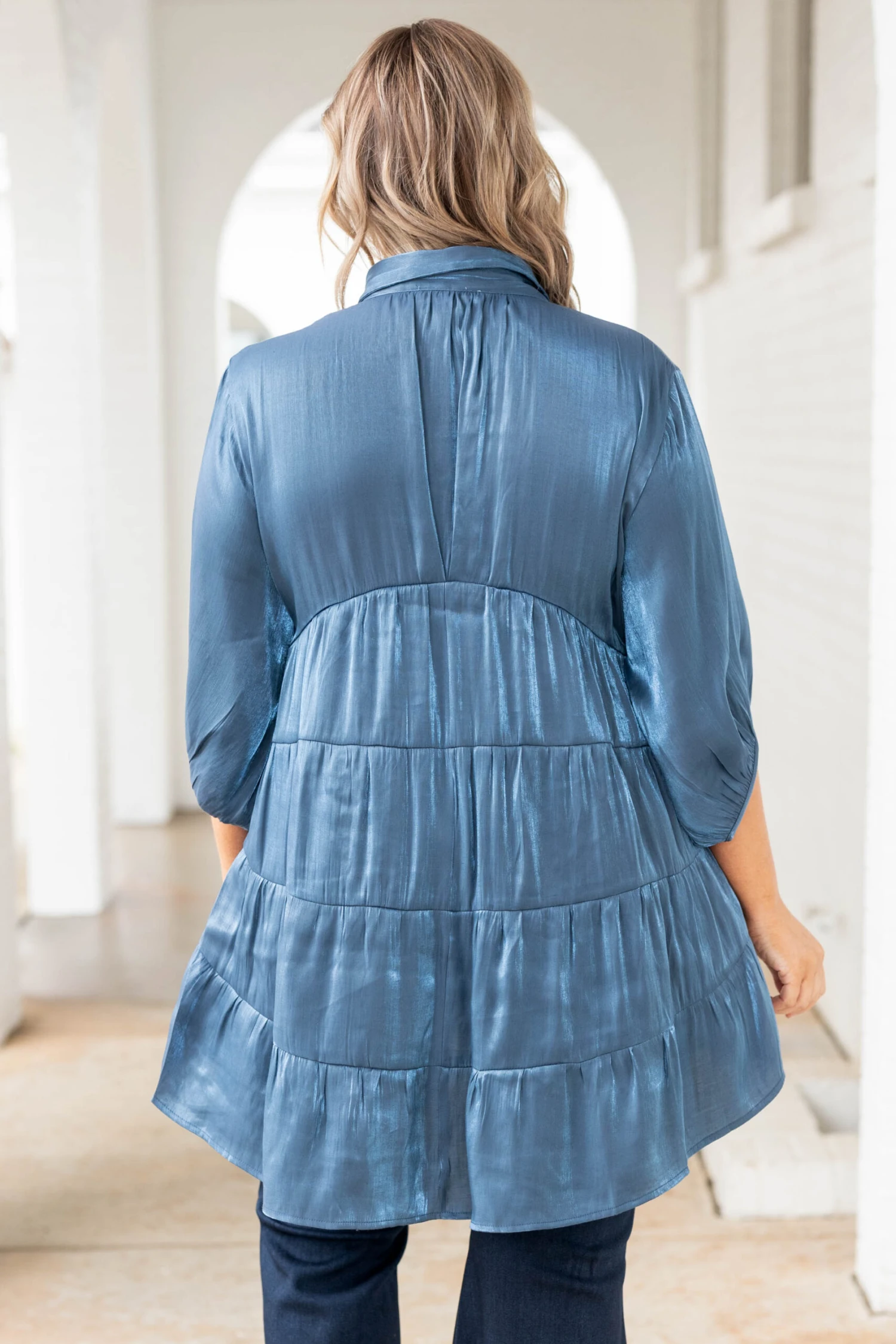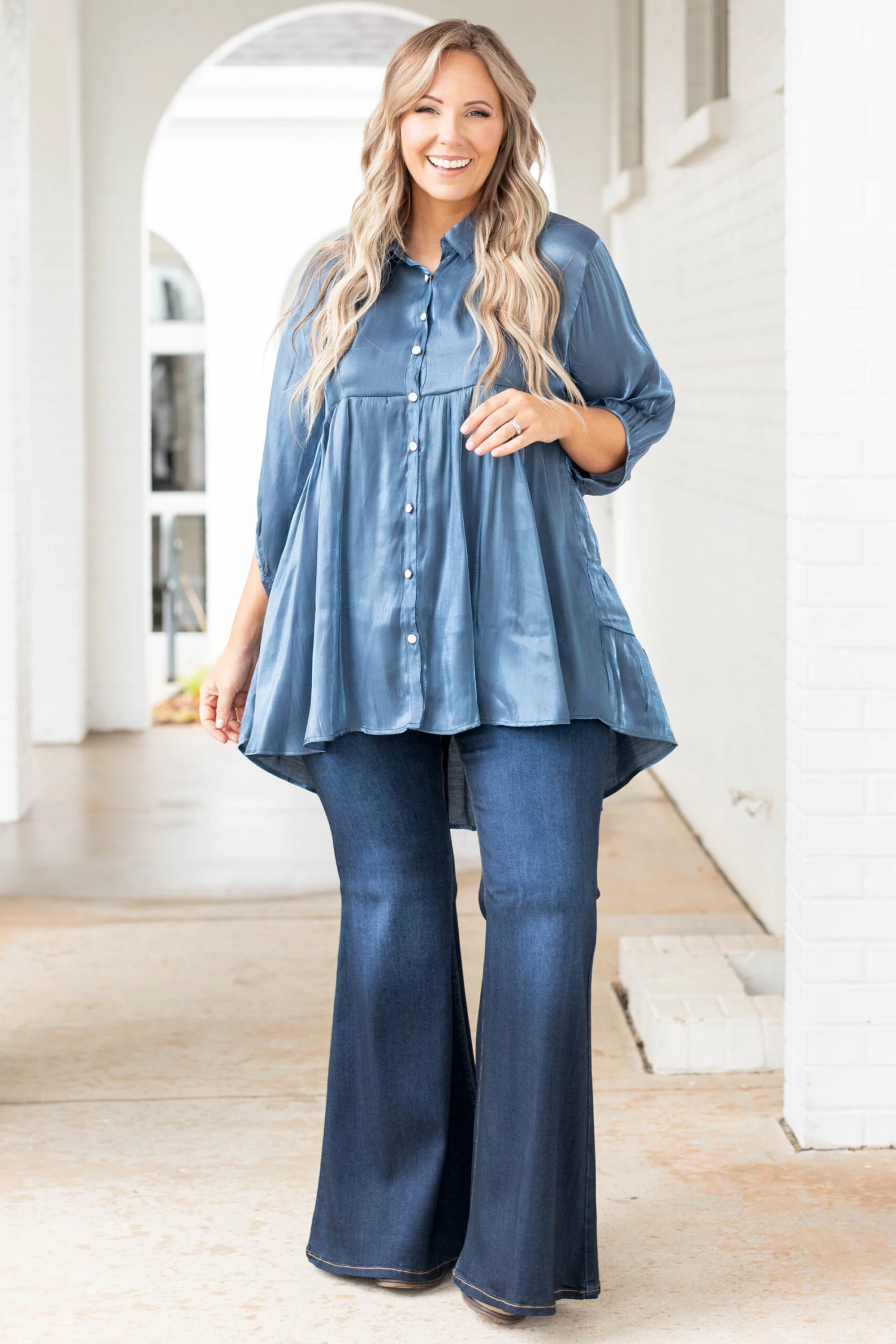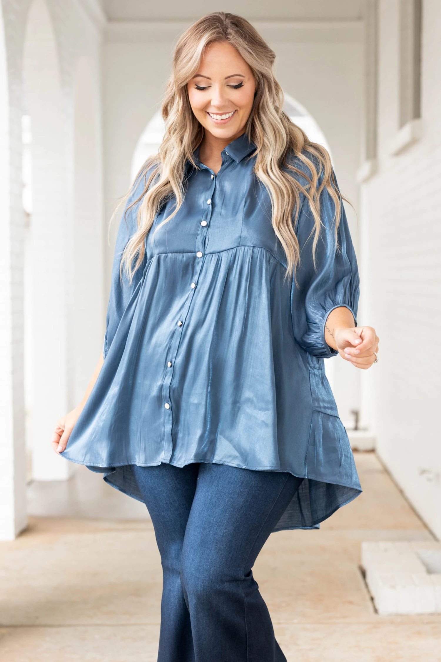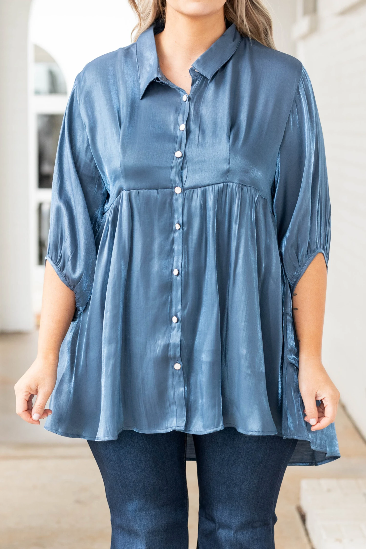 This gorgeous tunic is the perfect addition to your wardrobe! The midnight color fabric has a metallic shimmer that is perfect for dressing up or down! The pearl buttons add the perfect touch of elegance! Style this with flare jeans and booties for a super cute look!