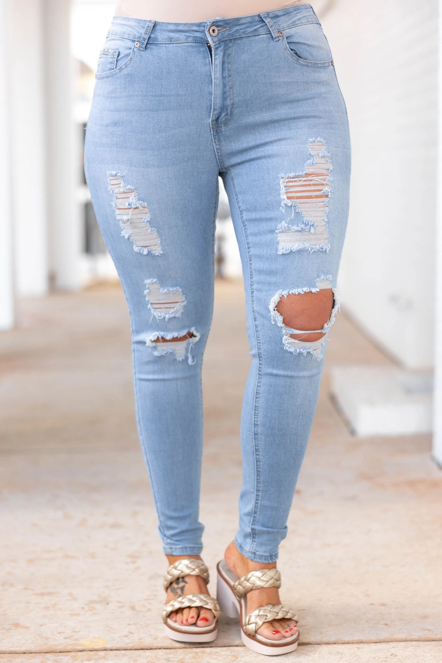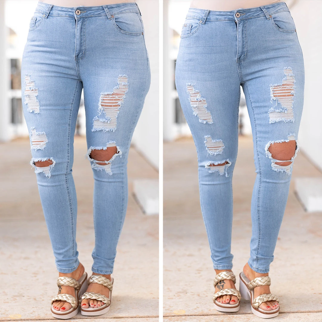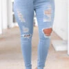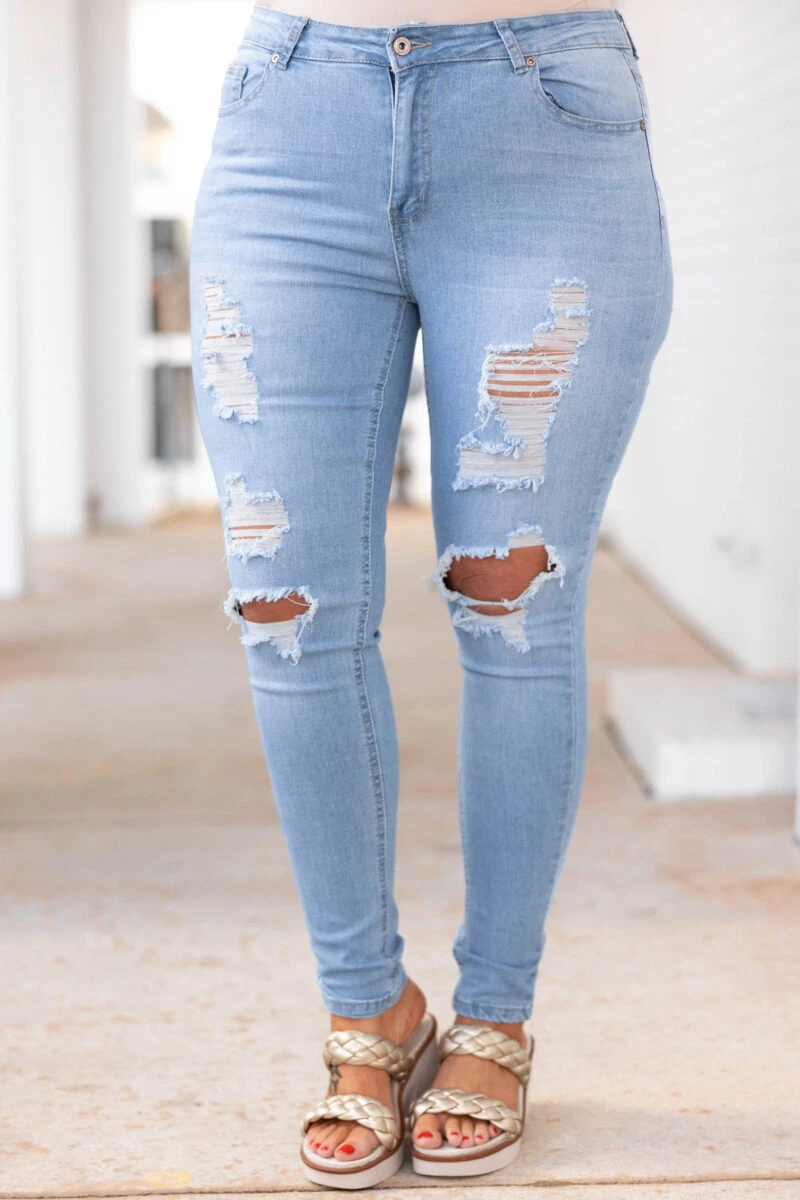 These jeggings are sure to become your new closet staple! The light blue color is so trendy and the distressed design will make sure you are walking in style! These can be cuffed for a sweet look or wear them normally for a classic look! Simply style them with your fave top and some cute shoes and you have an amazing outfit!Â