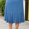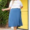 We are in a daze over this beautiful skirt! This wrap skirt has a bold blue color that can be paired with all your favorite tops and accessories this season! The ruffle detail on the front and around the bottom is SO chic! Simply style this skirt with a cute graphic tee and wedges for a casual, fun look!Â