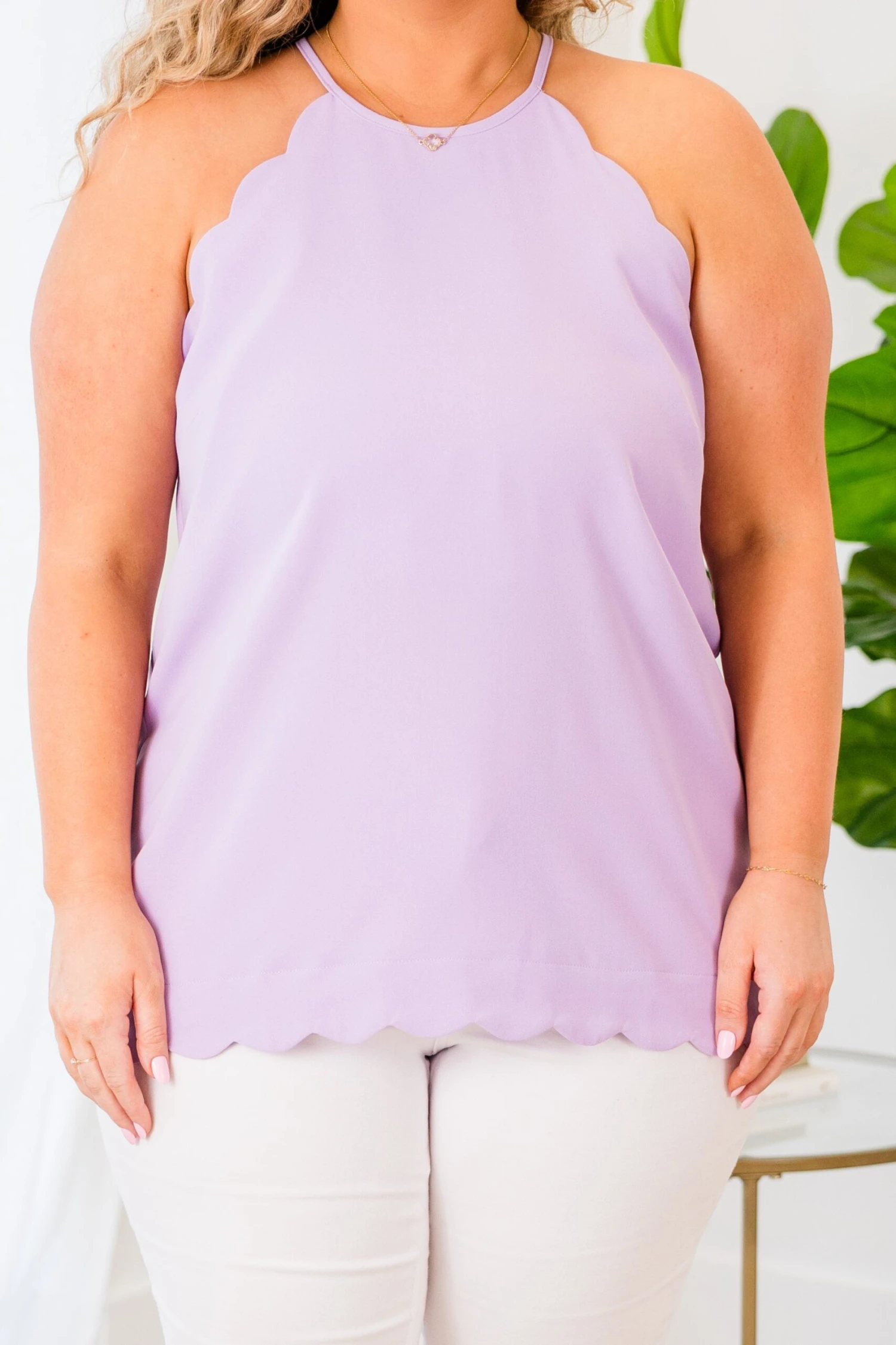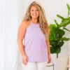 You’ll want to be caught wearing this beauty! The bold lavender color is so easy to pair with all of your faves! The scalloped design along the arms and hemline is so chic! We see this halter tank paired with skinnies or shorts for an unforgettable chic look!