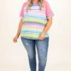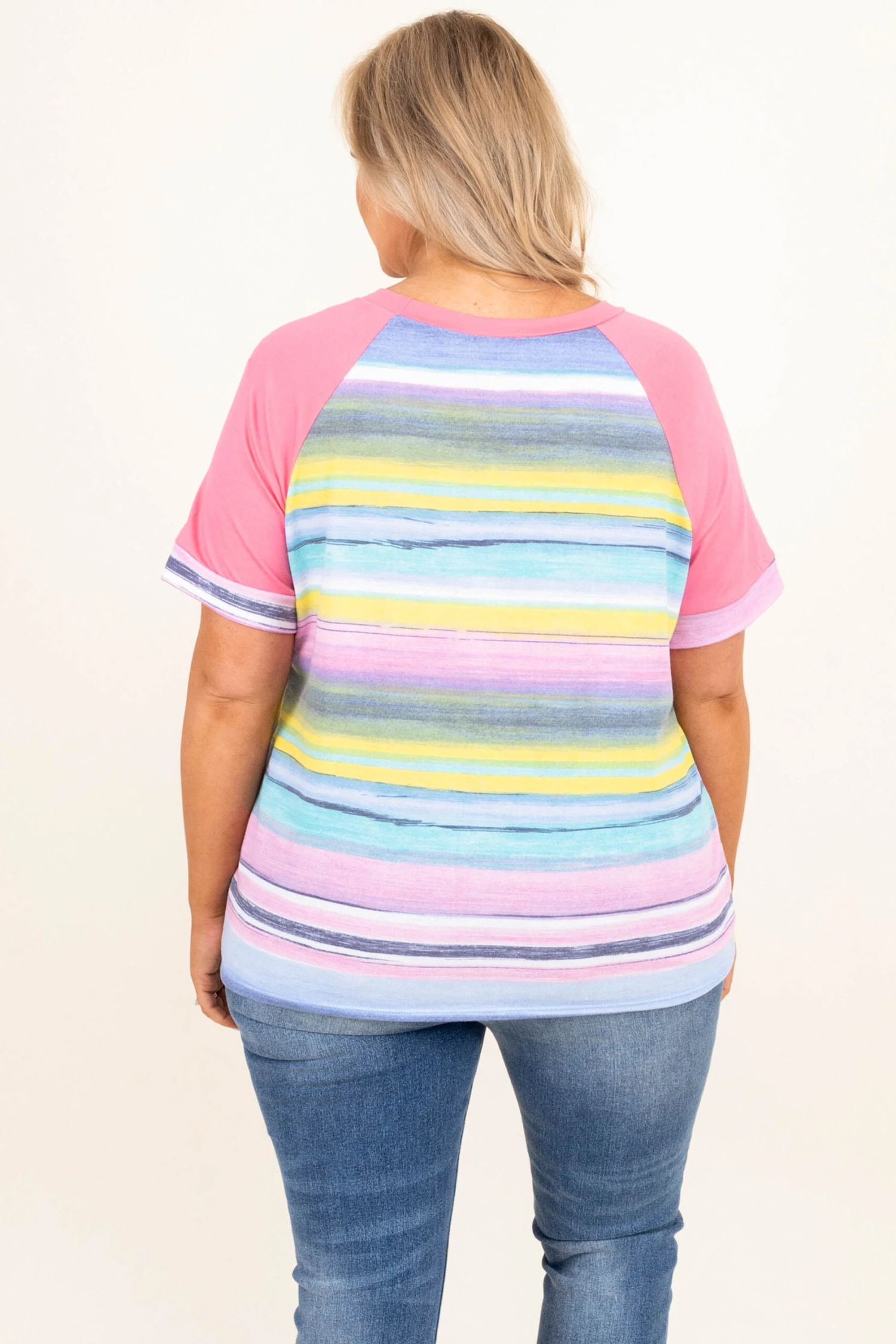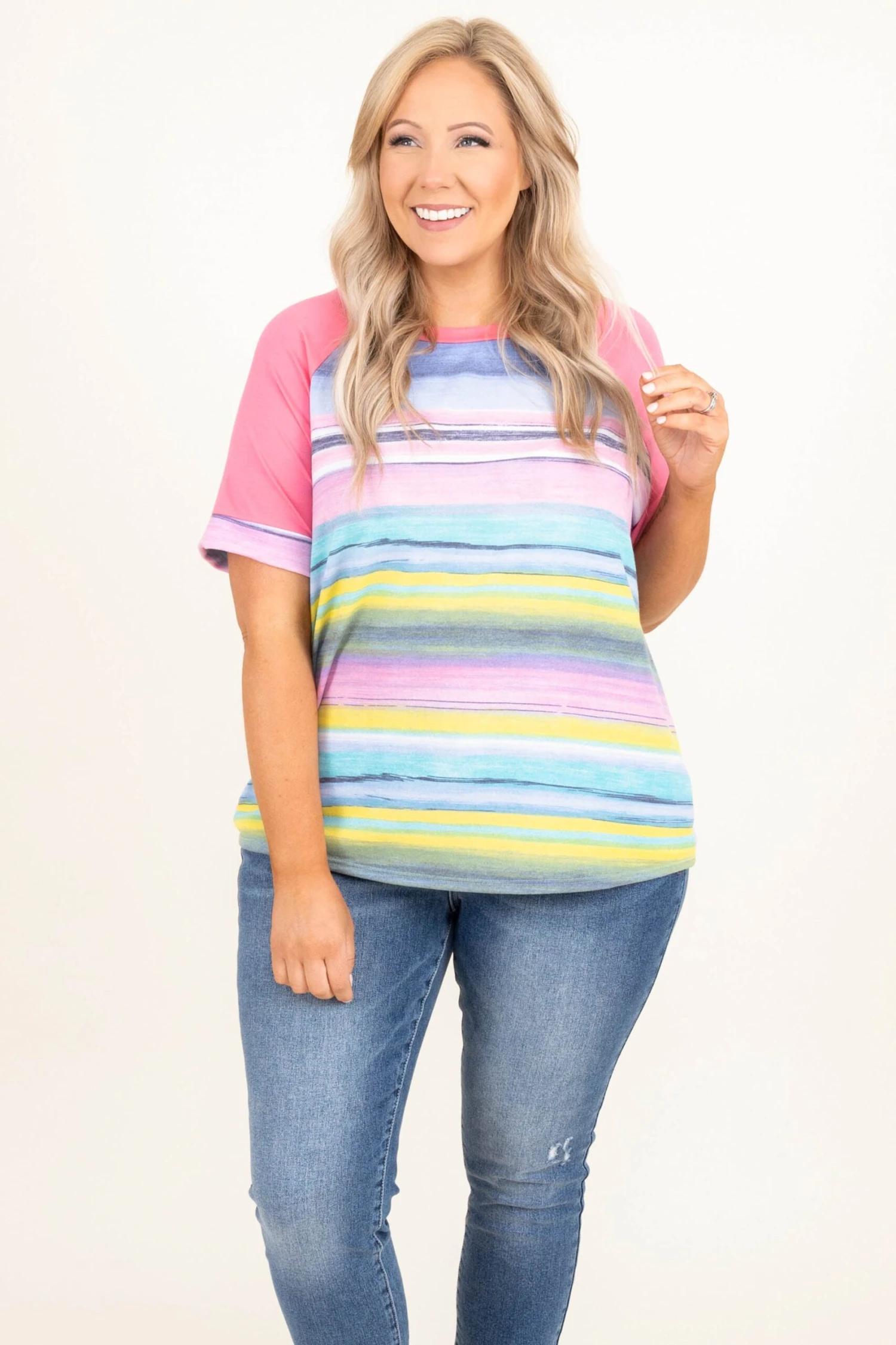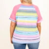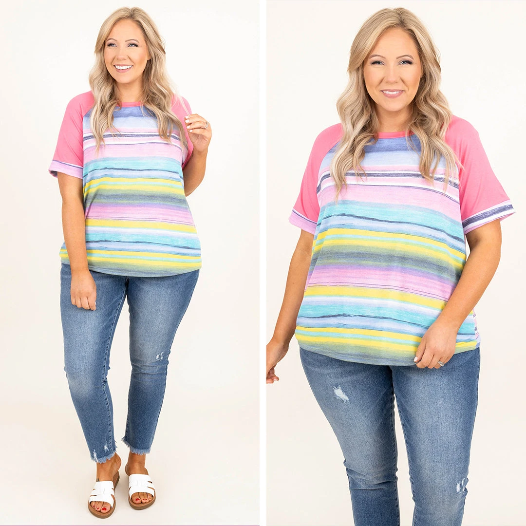Catch a flight to somewhere exciting in this top! This cutie has a trendy stripe pattern with different colors to make it pop! The pink sleeves and neck contrast so well and the oh so soft material will keep you comfy all day! Style this with some skinnies and sandals for a chic look this season!