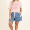 Catch the tide in these shorts! These have an elastic waist with a denim color and adjustable tie and a light distressed look. These are perfect for a day lounging on the beach or running errands just throw on a tank and some cute sandals and you are ready to go!