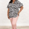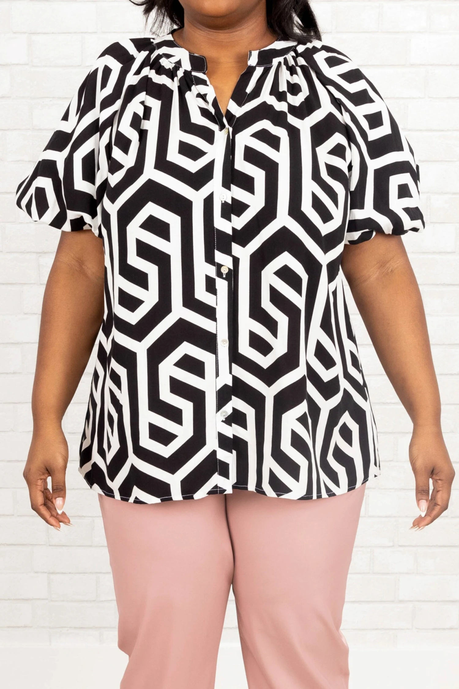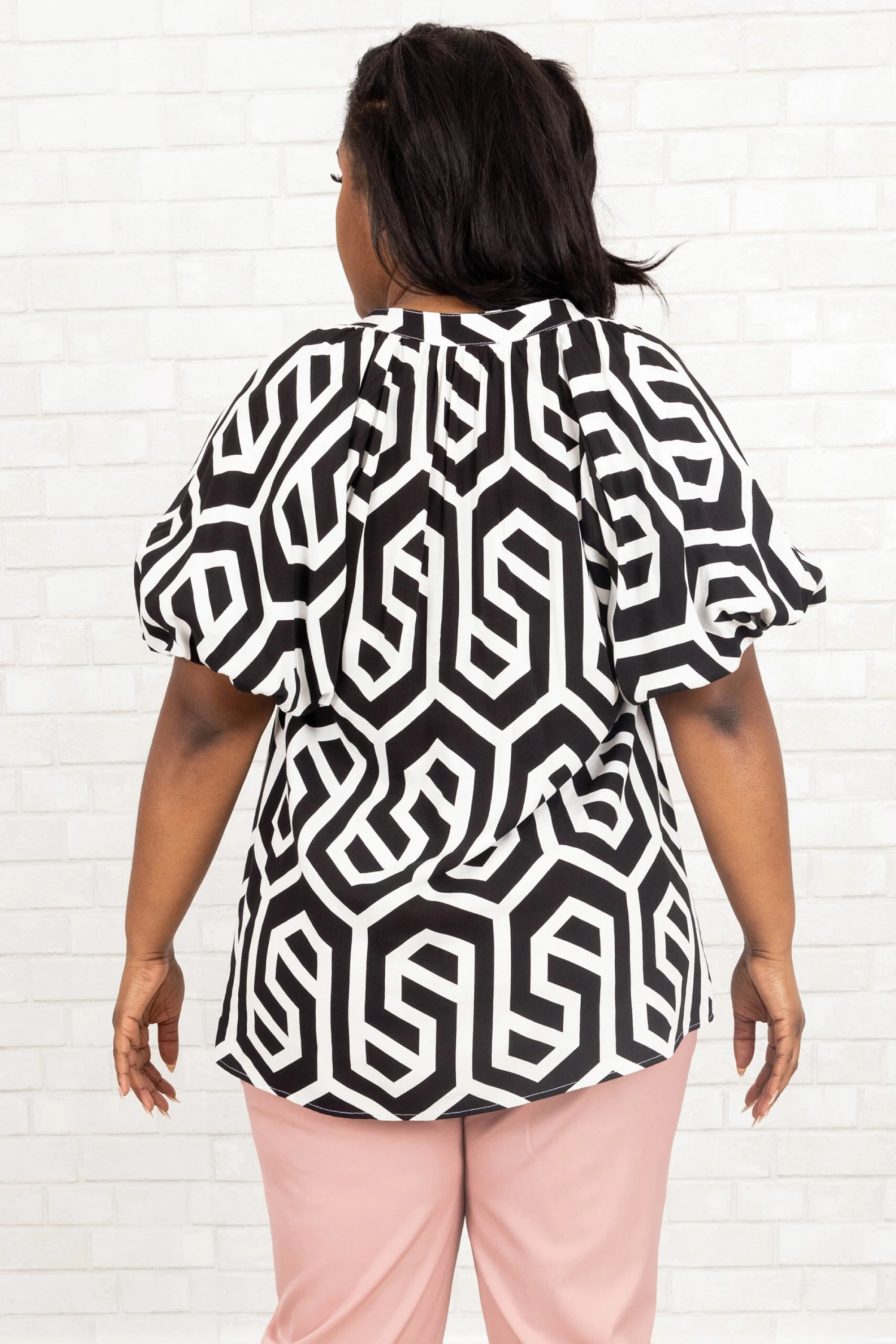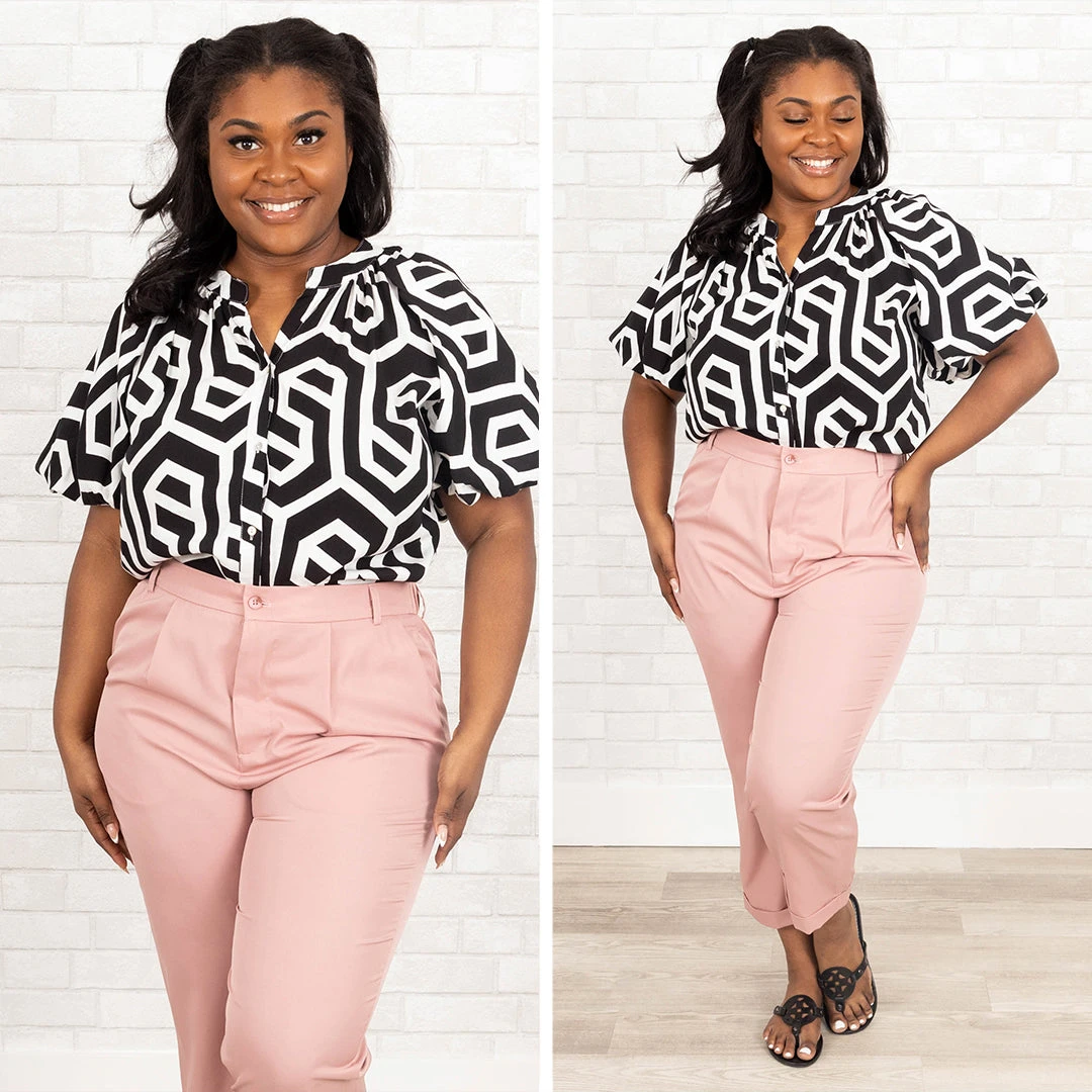 We are caught up in the beauty of this top! It has a neutral color with a geometric design that is so classy and chic! The bubble sleeves and figure flattering fit is perfect for the office or even a date night! Style this top with some cute pants and sandals or heels for a sassy chic look!