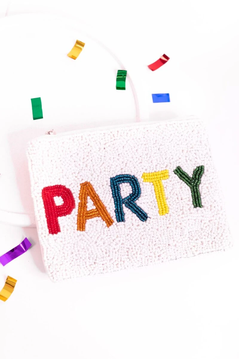 Everyday is a party day with this cutie! This adorable coin purse has a classic white color with a bold beaded design that is irresistible! What better way to stash away all of your loose change than in this trendy pouch that pairs well with all of your faves!
