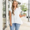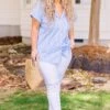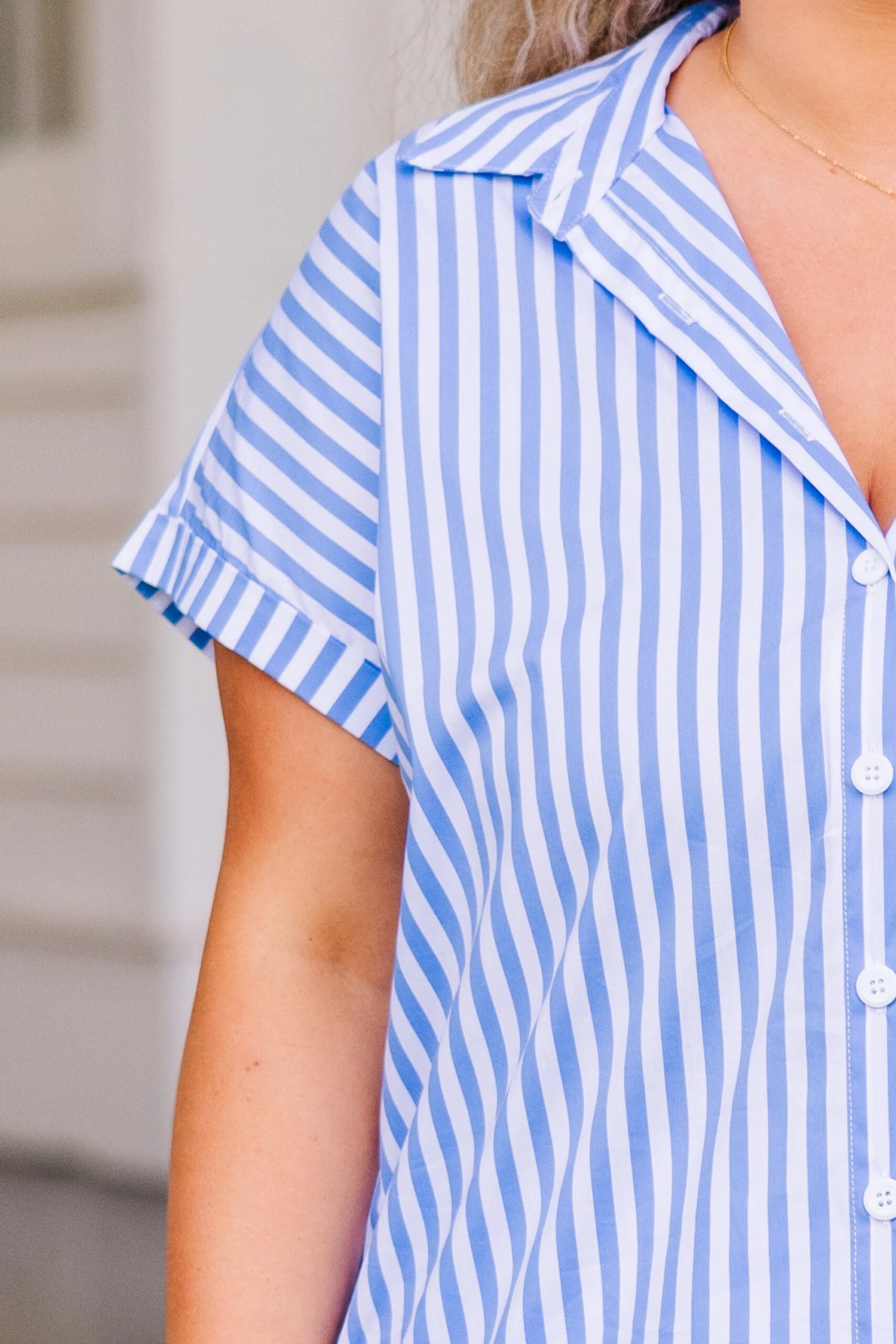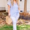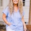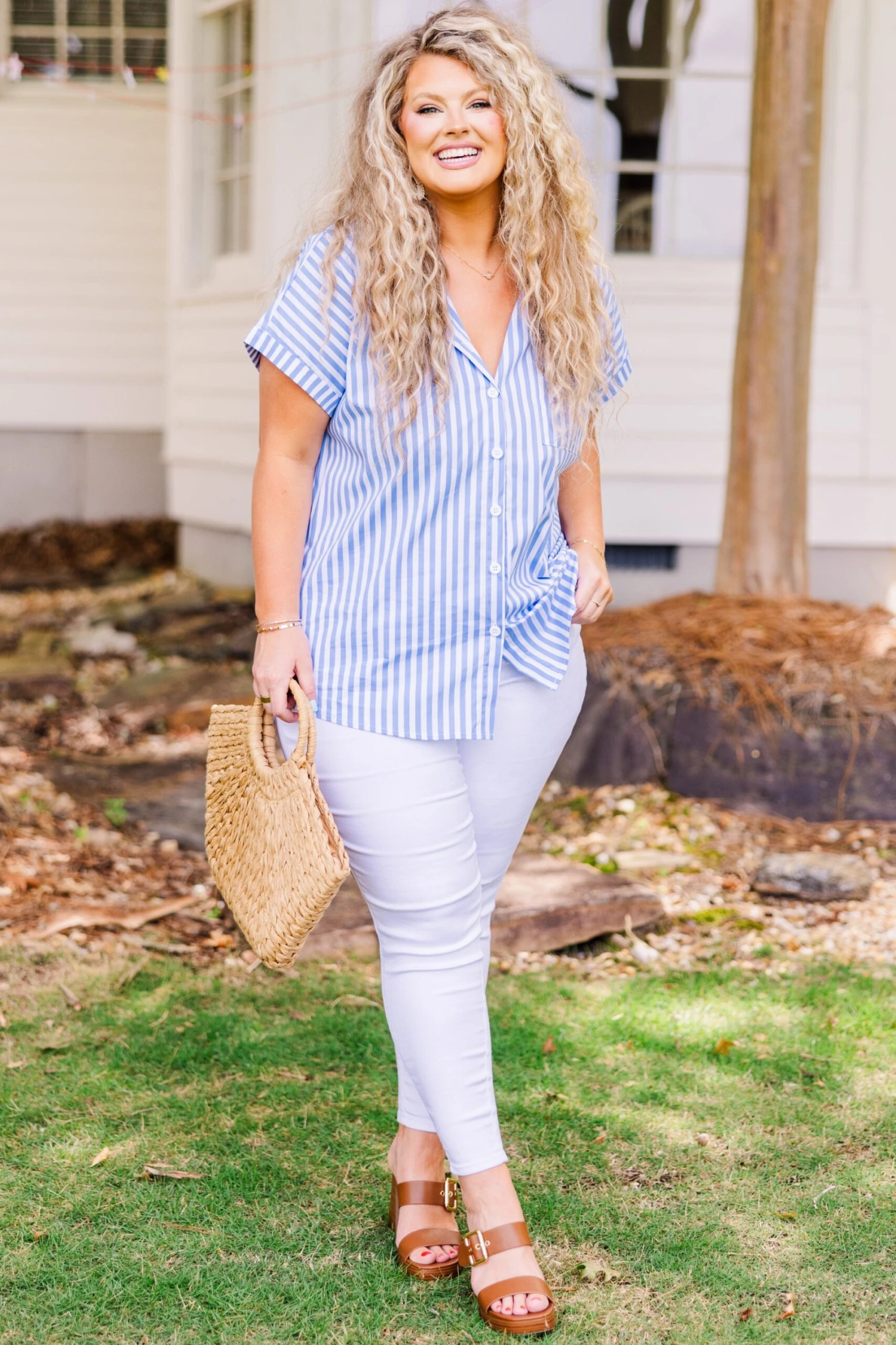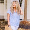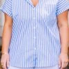 Elevate your style with our Celebrate Today Top, in denim and ivory stripes! Featuring a high-low hemline, functional buttons, and cuffed sleeves, it’s perfect for any occasion! Pair with blue or white denim for a patriotic 4th of July look!