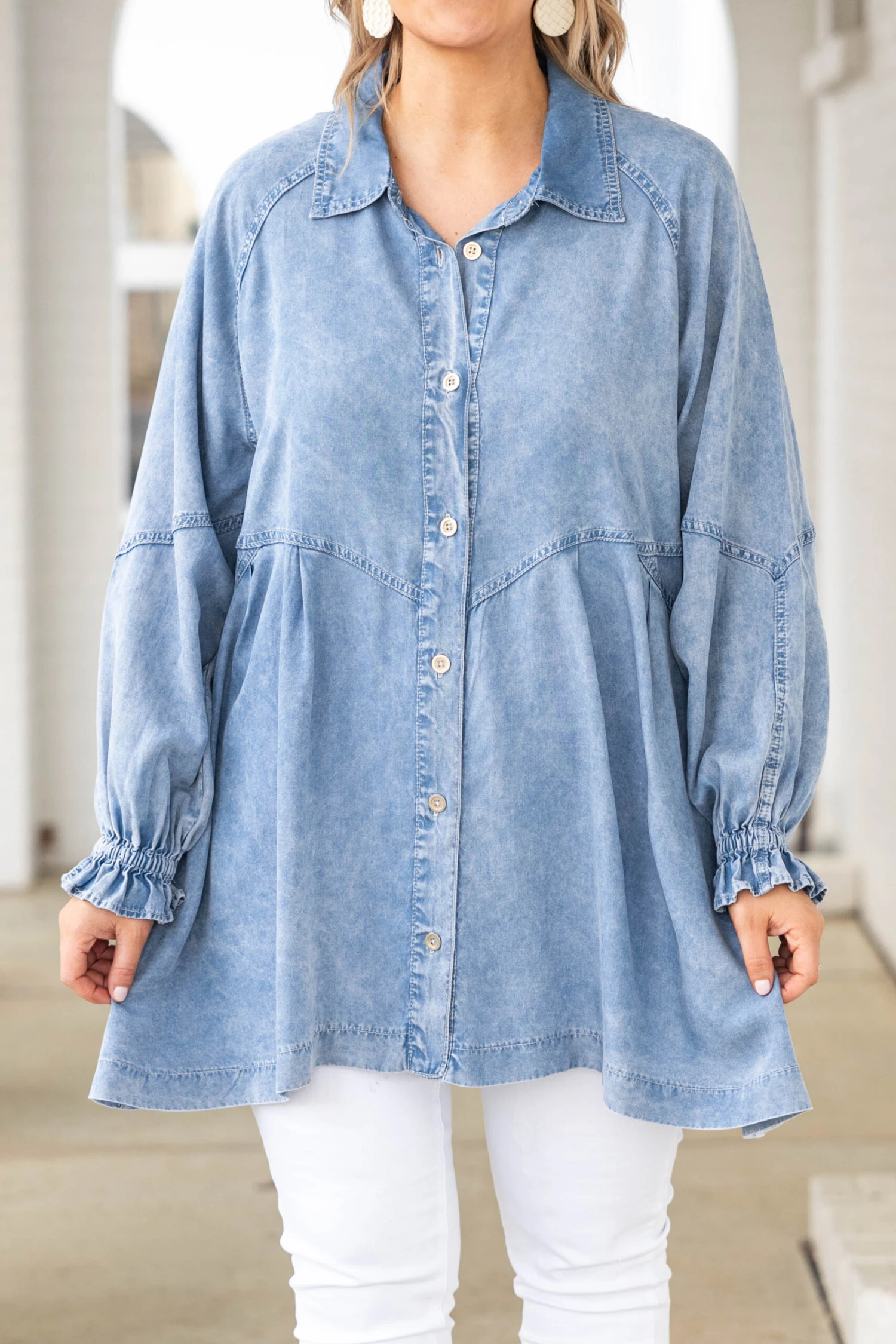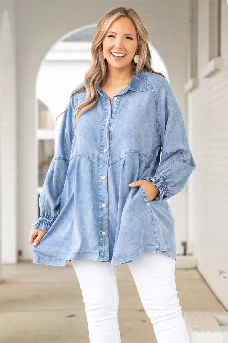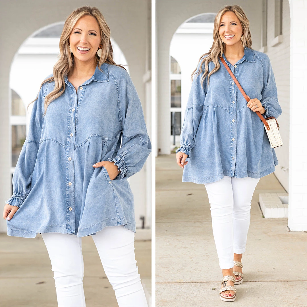 We are in LOVE with gorgeous top! This top has a super trendy acid wash and a lightweight, comfy design that is perfect for season! The bubble sleeves and functional pockets are so sweet! Style this top with jeggings or shorts for a classic chic look!