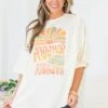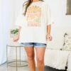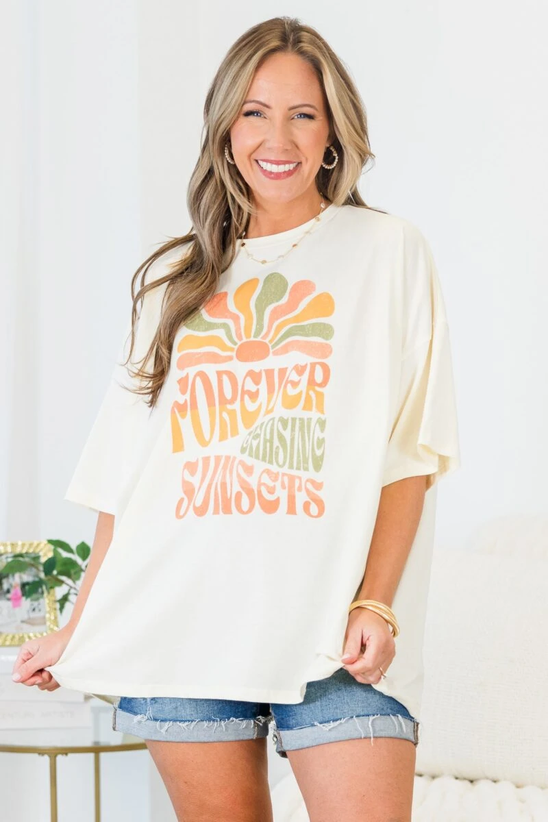 This oversized boyfriend tee in ivory is perfect for a comfortable yet stylish look! Featuring a sunset graphic, it adds a touch of personality to any outfit! Its loose fit and soft fabric make it the ideal choice for a casual day out!