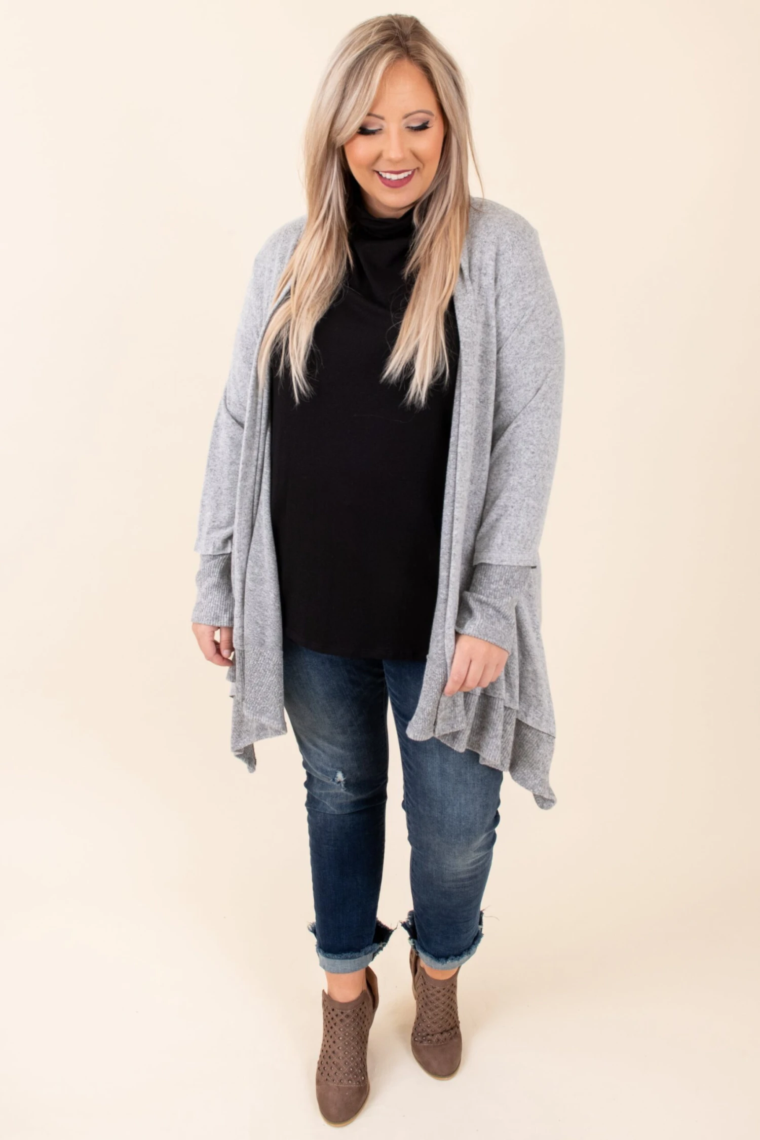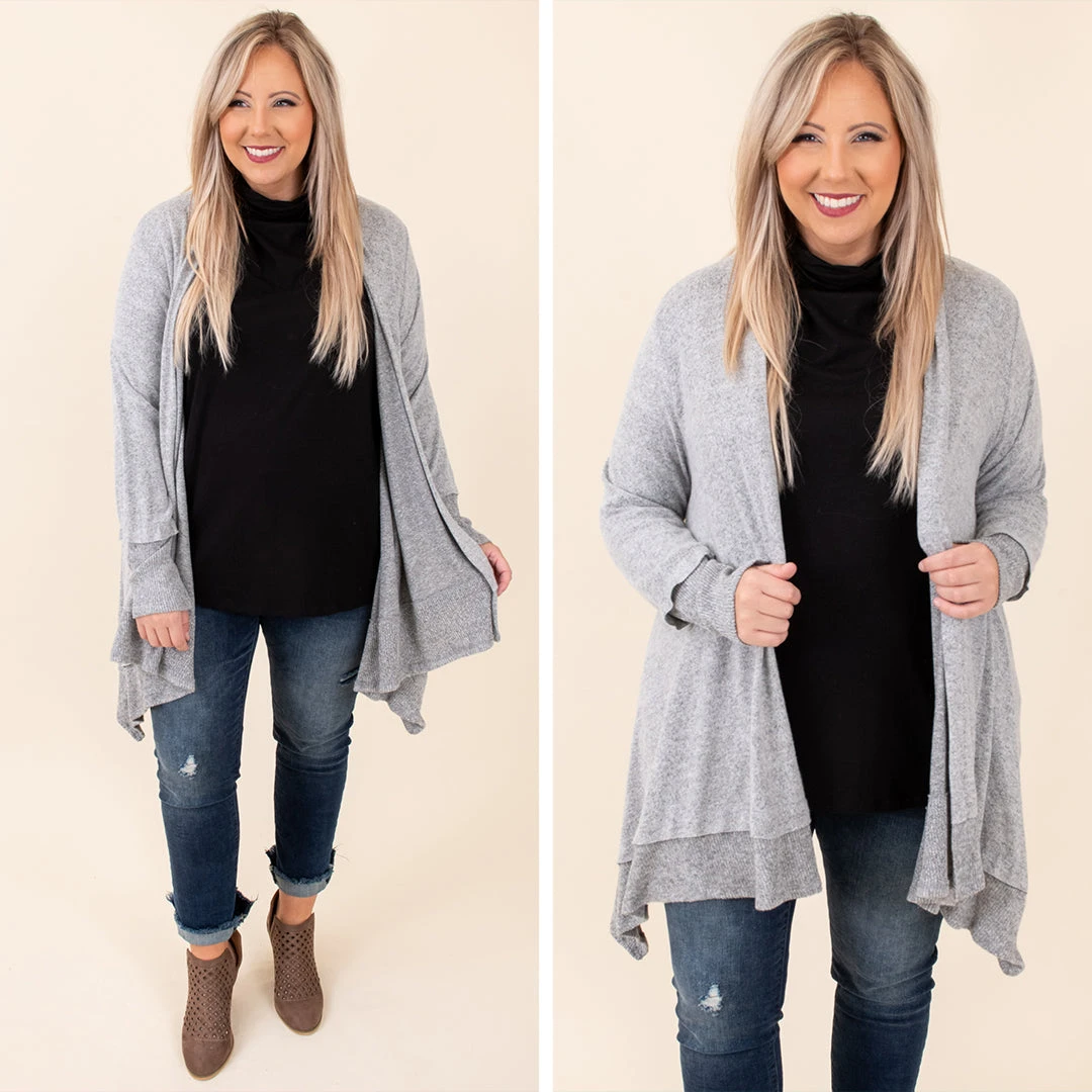 Everyone will be chasing you down asking where you got this cardigan! This cardigan has a solid gray color you can dress up or down and style with everything in your wardrobe! This cardigan has heathered detailing that is dreamy and a shark bite hem that will bring a pop of fun to your wardrobe! Layer this cutie over a patterned top for a stylish and super cozy outfit!