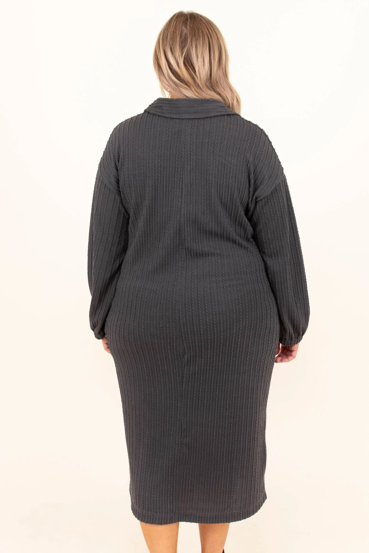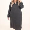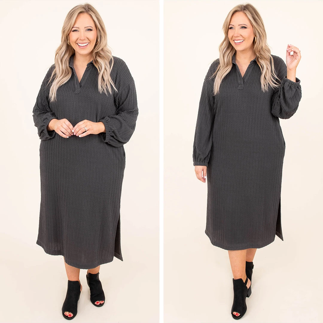 You will definitely feel chilled out when you are wearing this super comfy midi! The knit texture fabric is so comfy and the gray color can be matched with anything! The collared neckline is so trendy and the pockets on the side are an amazing added bonus!