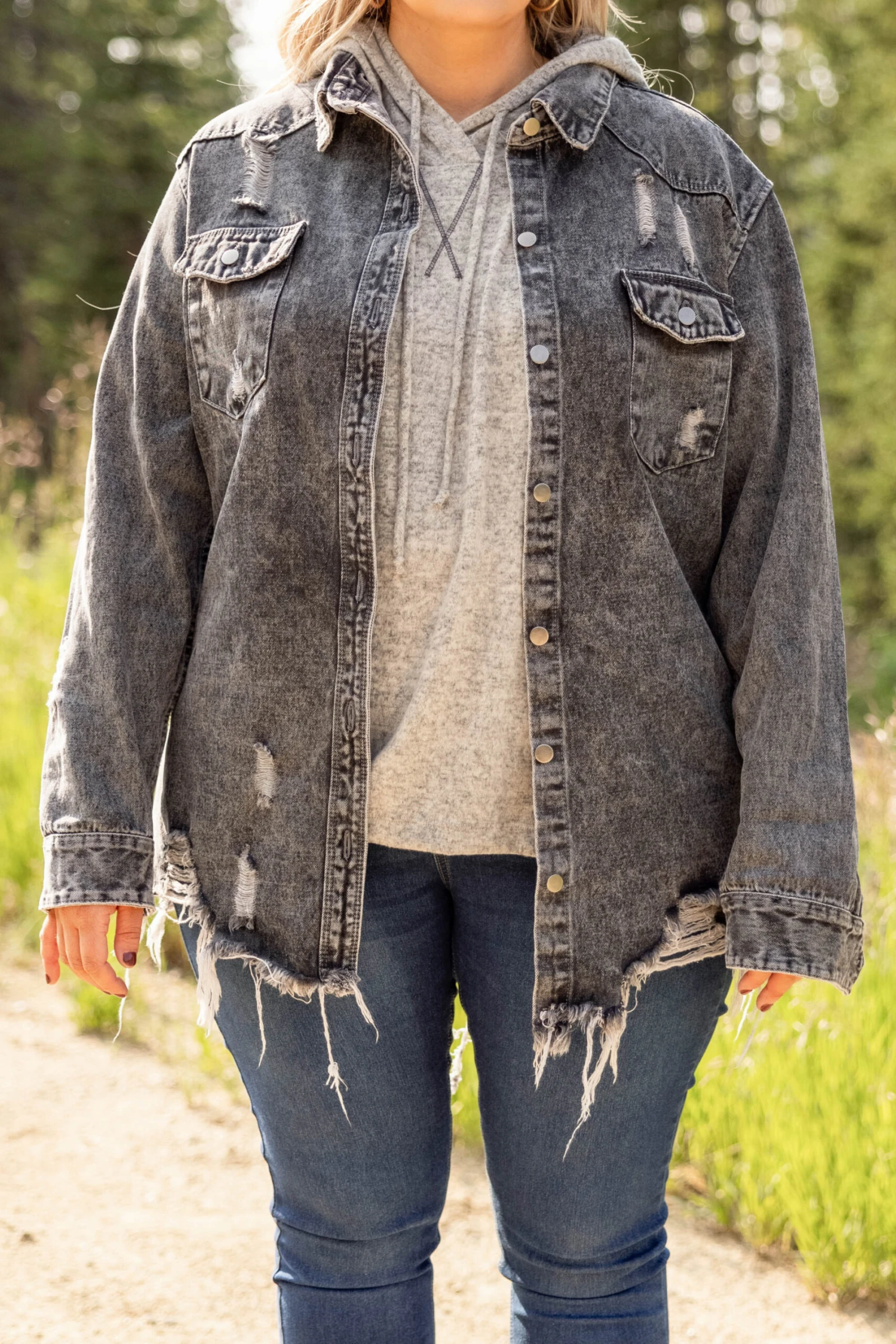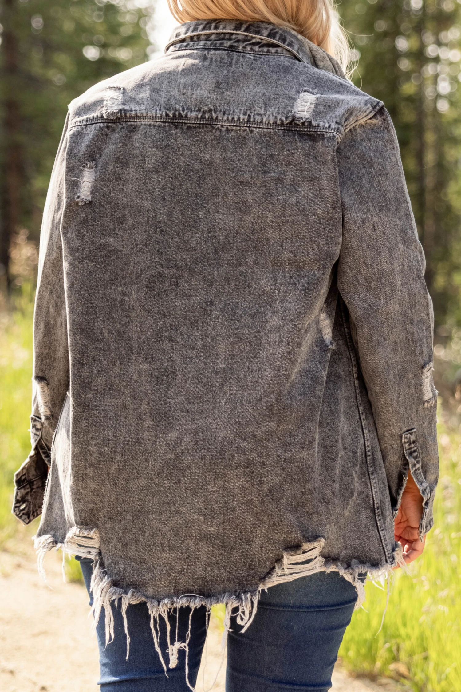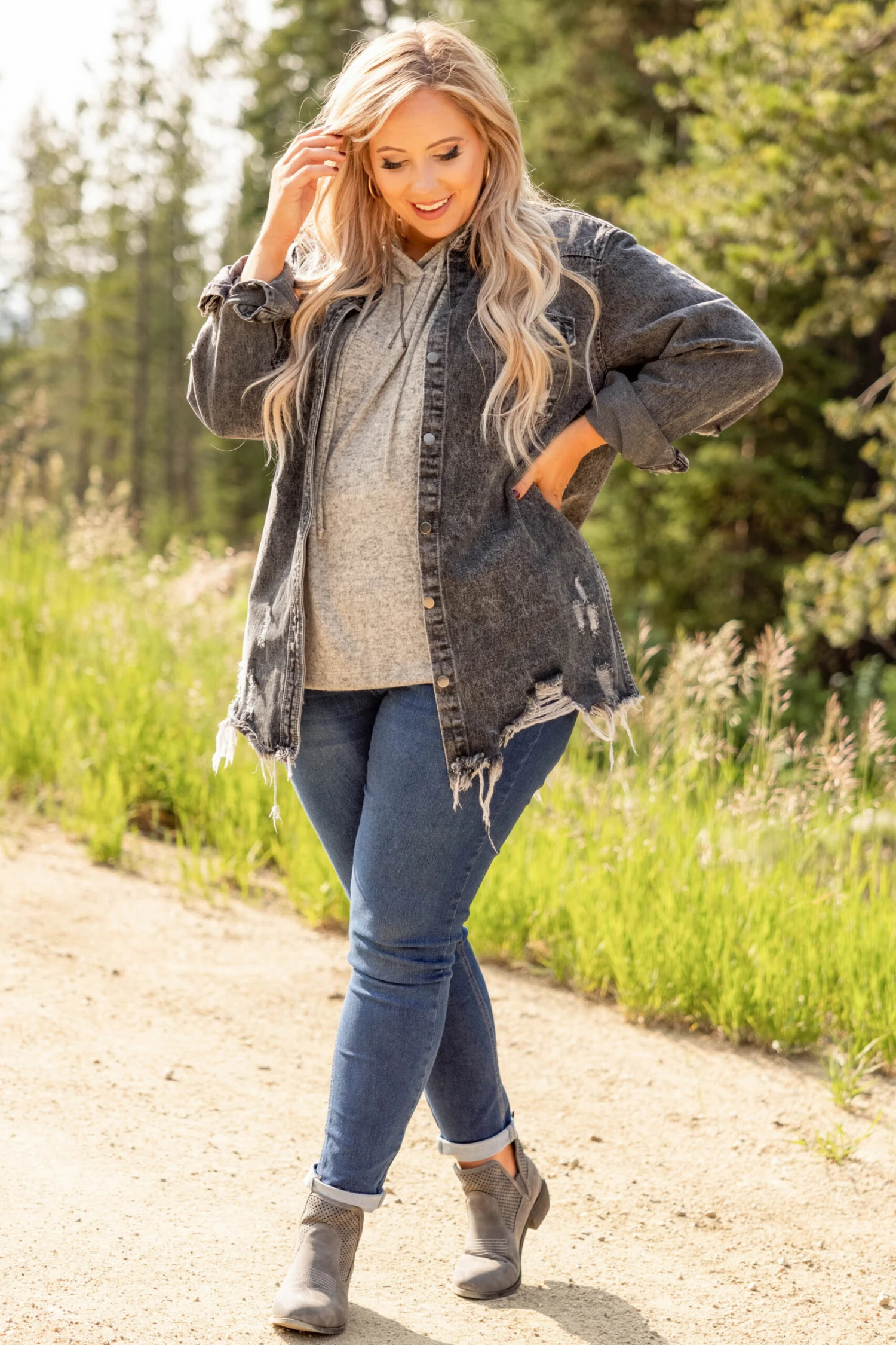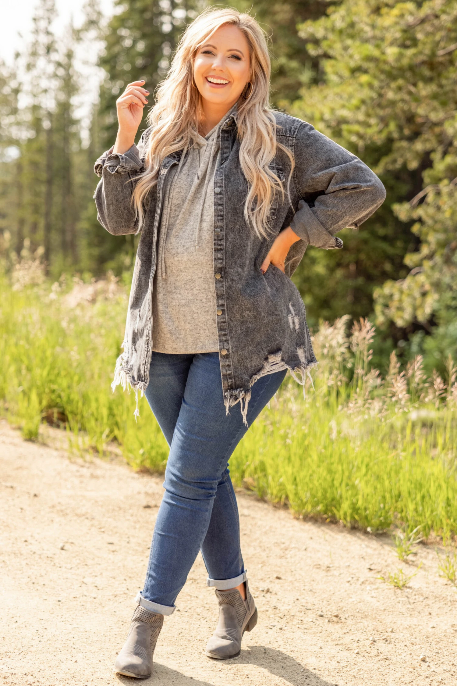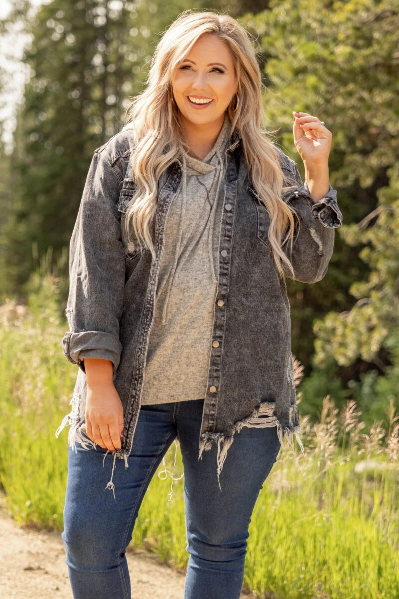 This chill top is just what your wardrobe has been missing! It has a classic denim fabric with a solid grey color you can style for every occasion! It features a button-front, a distressed hemline, and can be worn alone or as a layered look! Style this top with a basic tee and shorts for an effortlessly chic outfit!Â
