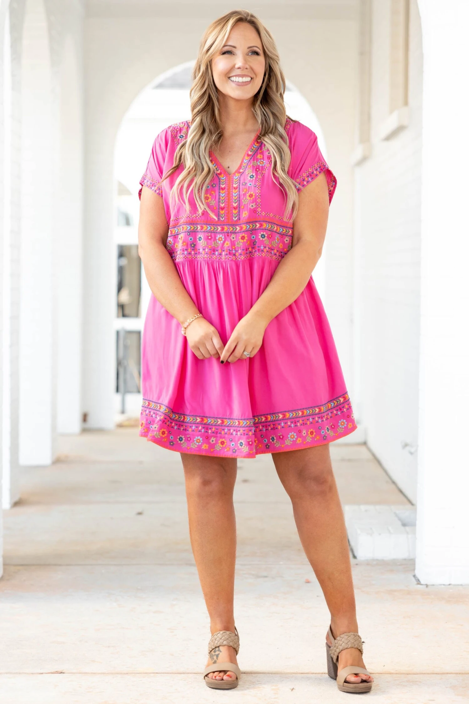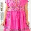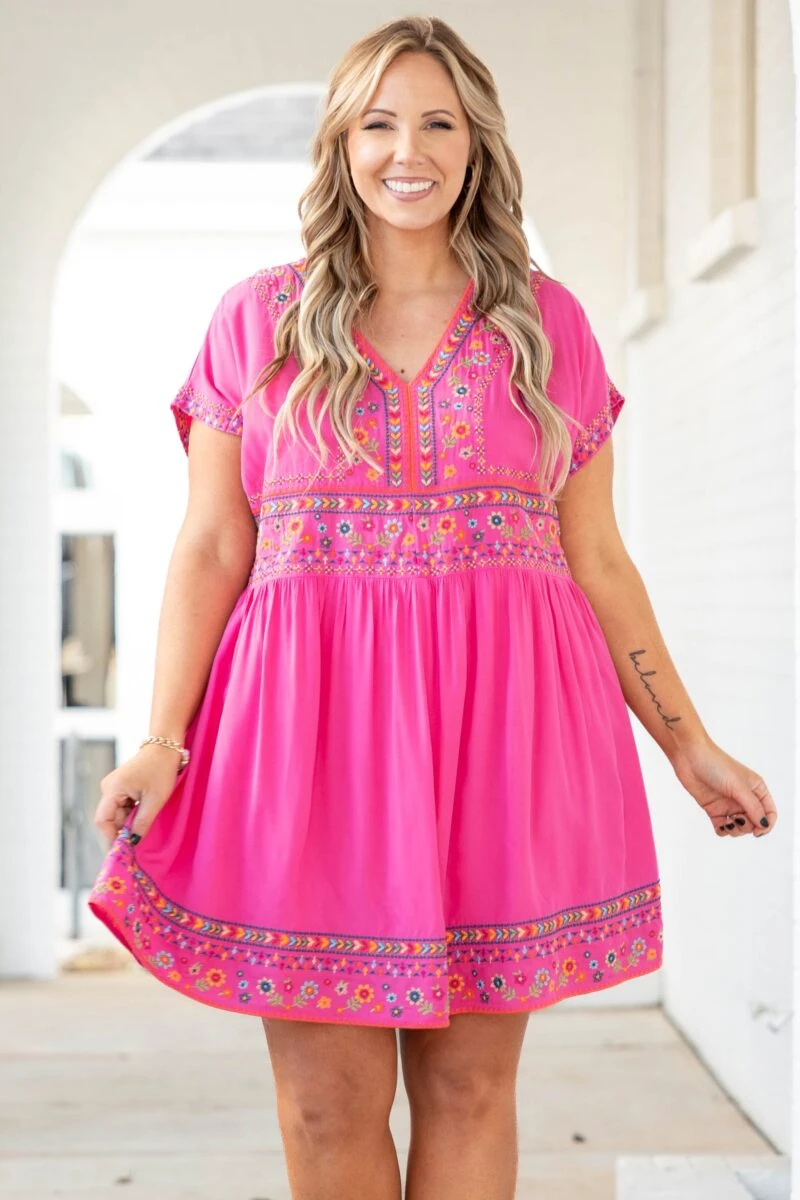 We can’t help but chime in about how much we love this dress! The hot pink color is boldly chic and the embroidered pattern is so stunning! We love the babydoll style that is sure to flatter anyone and this cutie has a liner for ultimate coverage! Style this dress with heels for a perfect look at your next event!Â