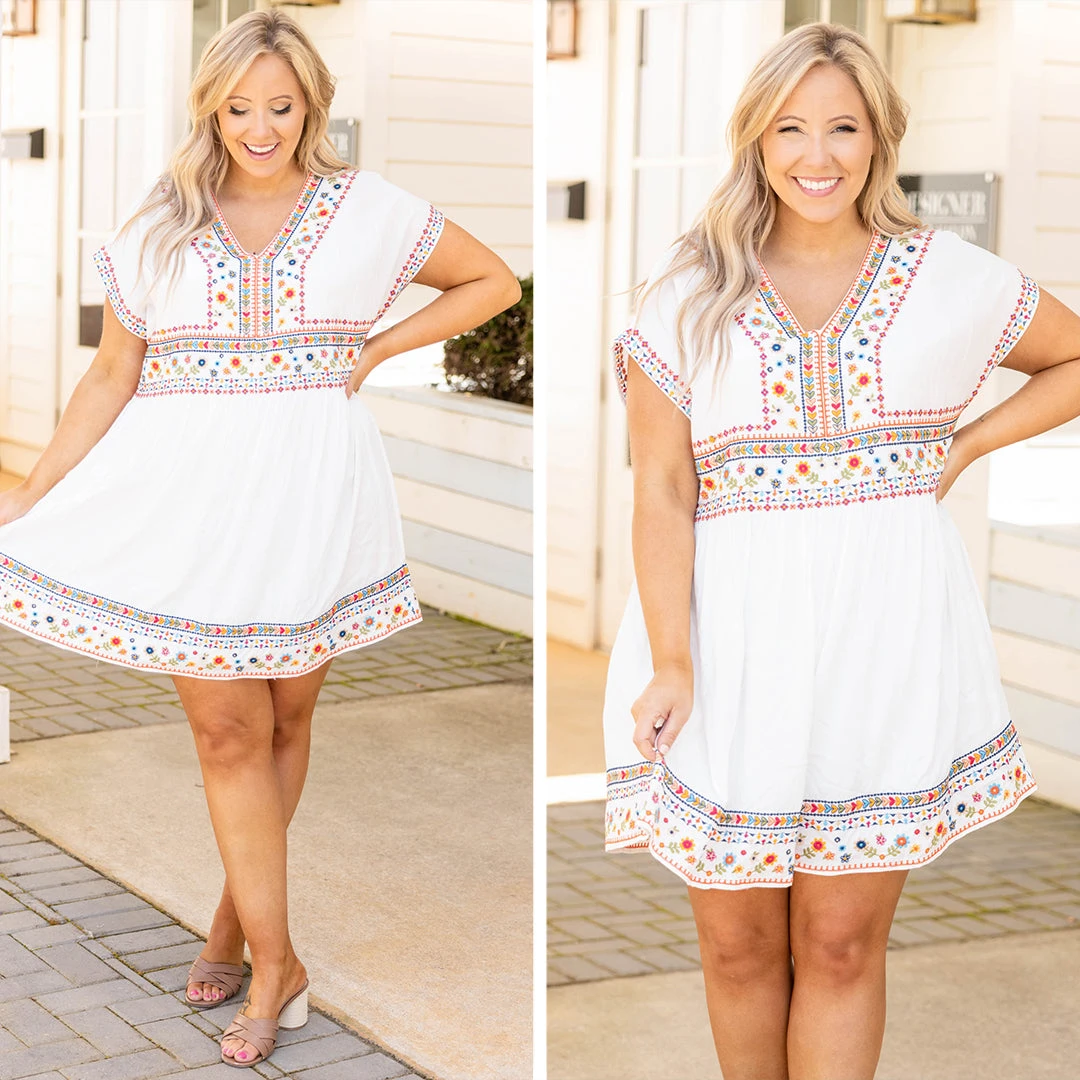 We can’t help but chime in about how much we love this dress! The white color is classically chic and the embroidered pattern is so stunning! We love the babydoll style that is sure to flatter anyone and this cutie has a liner for ultimate coverage! Style this with heels for a perfect look at your next event!Â