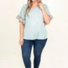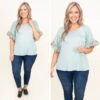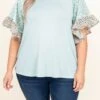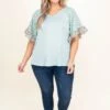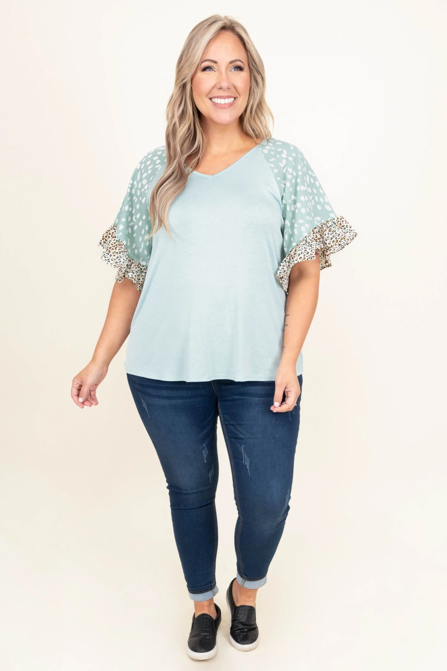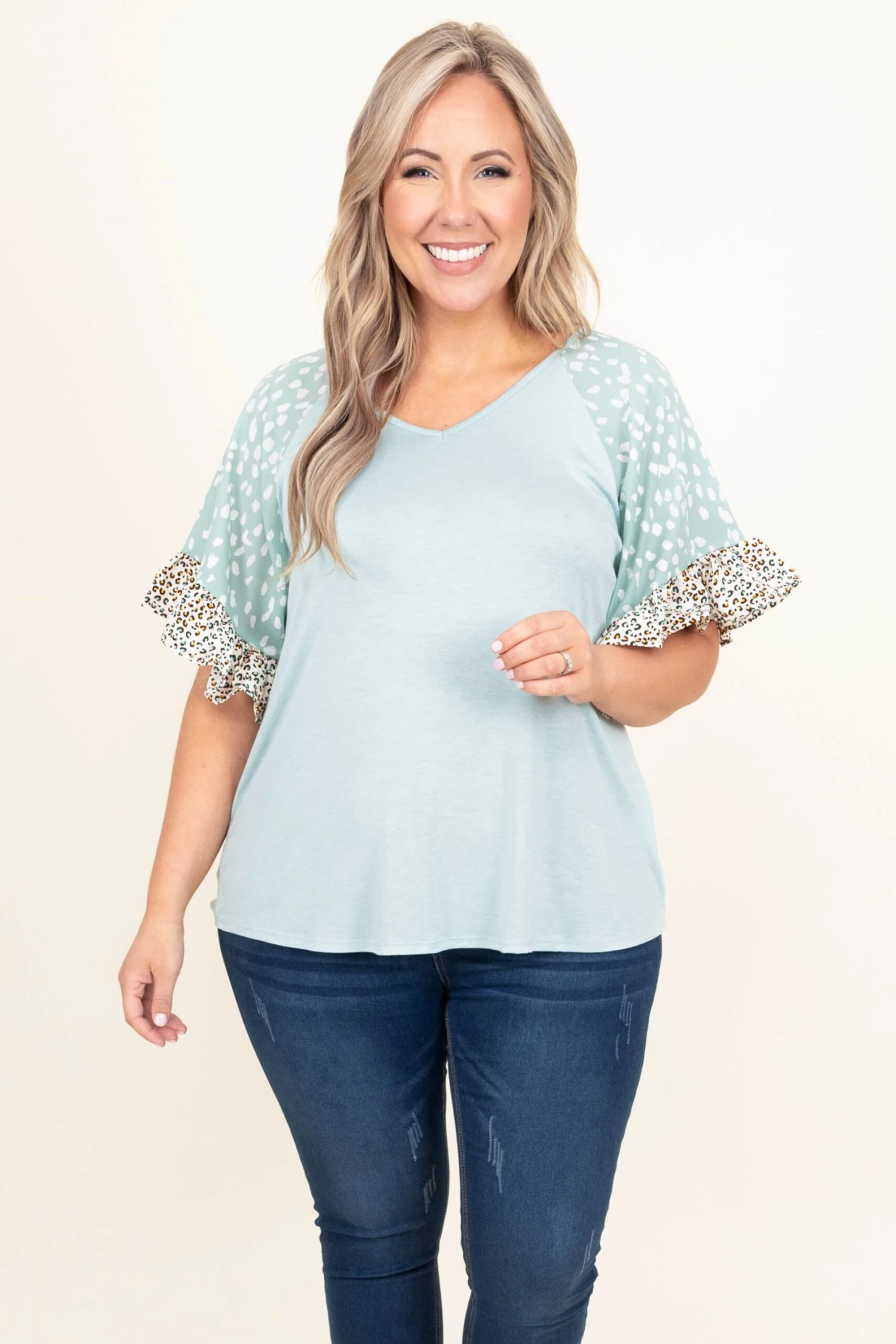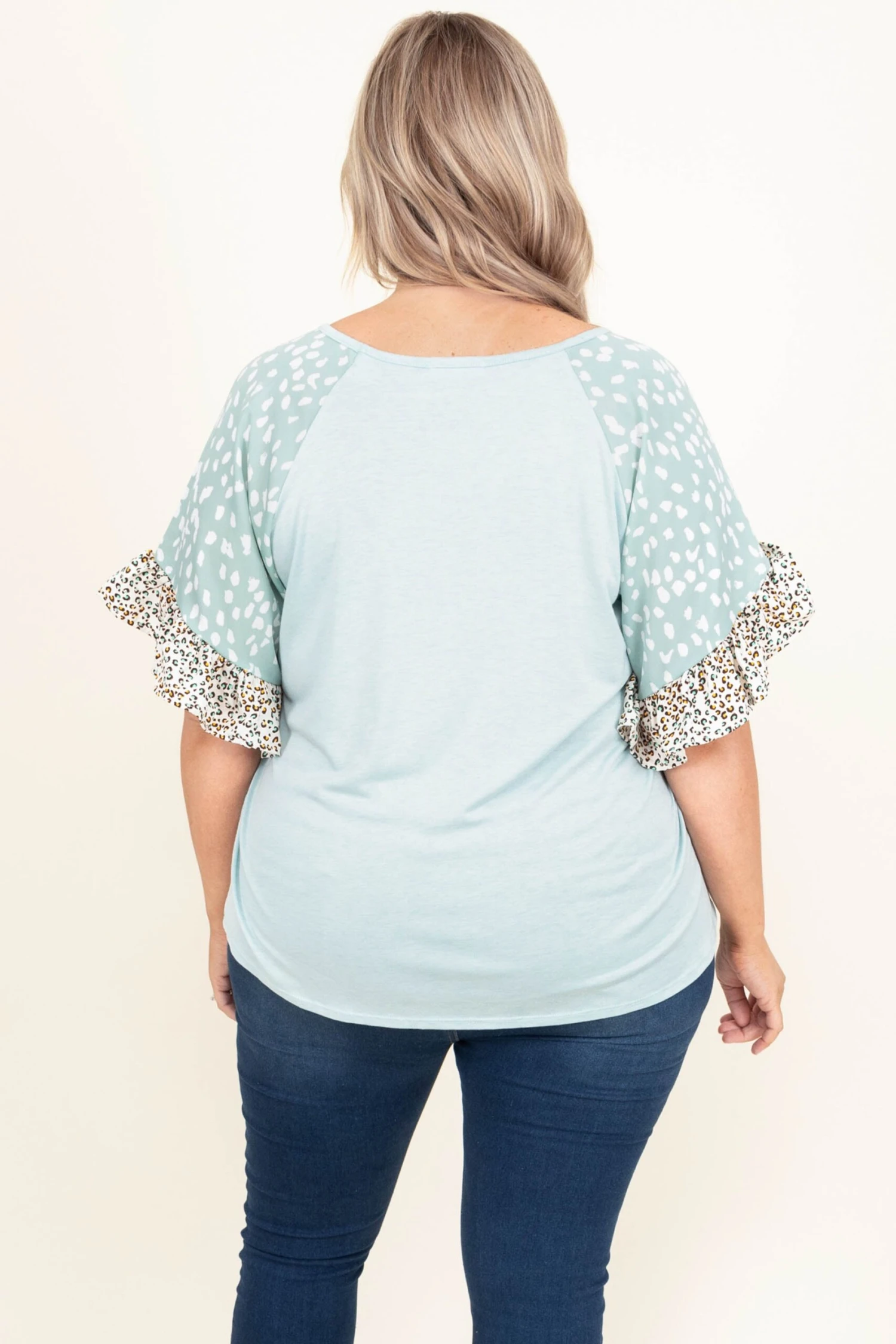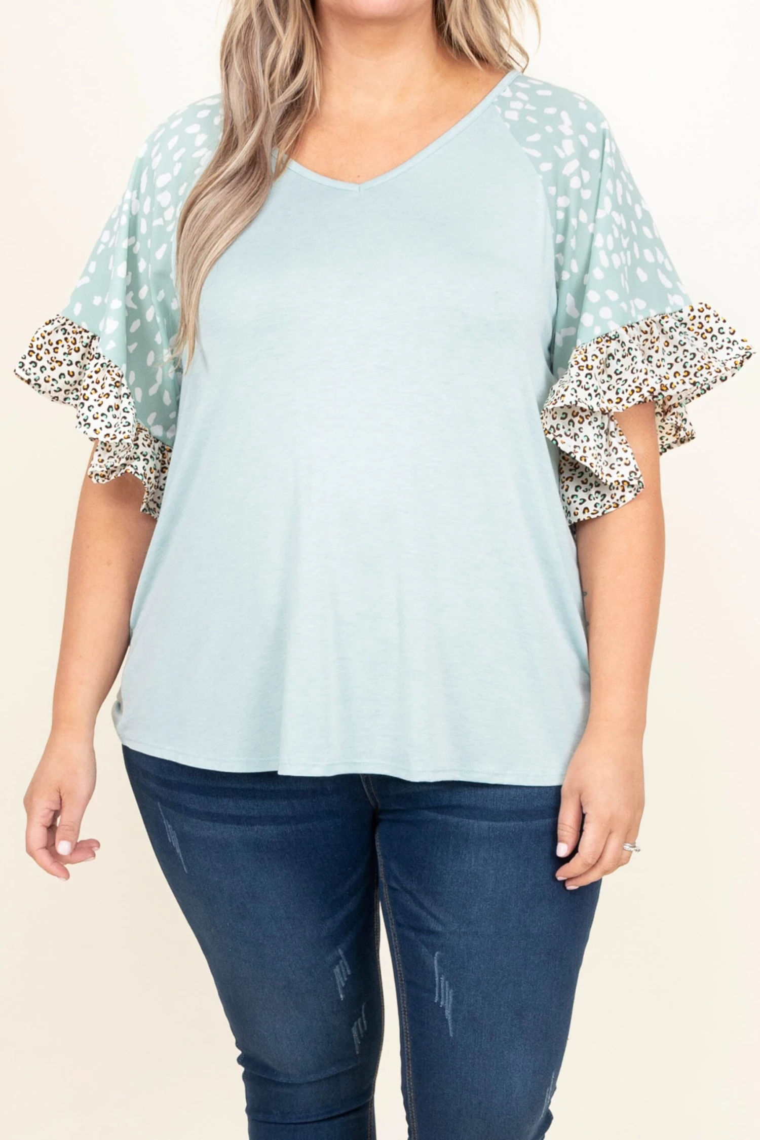 You’ll want to choose this gorgeous top to add to your wardrobe! This top has a soft sage color with ruffled sleeves that have a trendy leopard pattern! The comfy, figure flattering fit is perfect to pair with all of your faves this season! Style this top with some skinnies or leggings for a casual chic look!Â