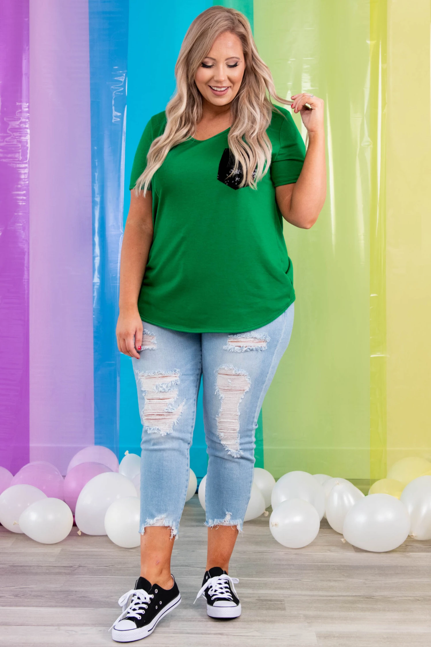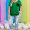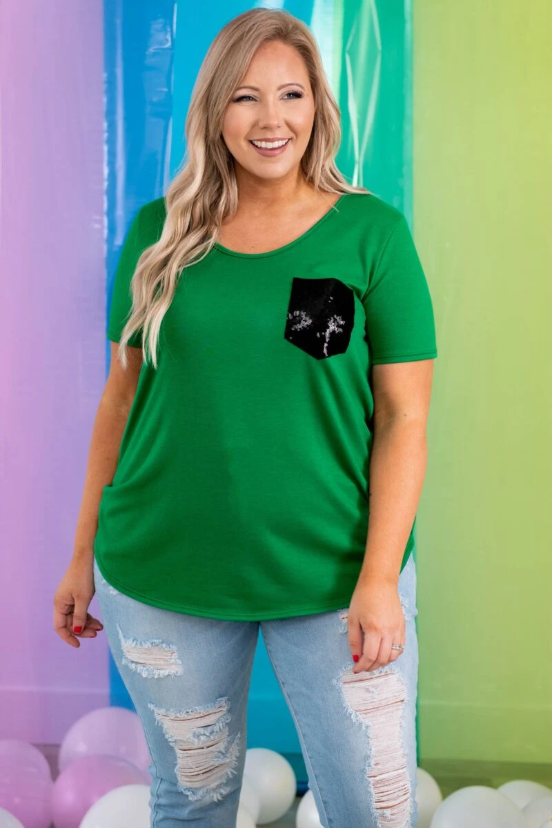 Sparkle all day like the city lights at night. From the sparkle pocket to the fun kelly green color, this top is too cute! We love how soft it is and how easy it is to pair with all of your favorites! It’s comfortable for all-day wear, has a relaxed fit to flatter your figure, and can be paired with all of your outerwear! Style this top with jeans and sneakers for all of your activities!