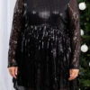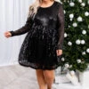 This dress has all of the sparkle that we love and is perfect for the holiday season! This dress features a beautiful black color and a curved babydoll fit to flatter every figure! Paired with your favorite heels and glam accessories for a chic, holiday look!