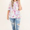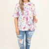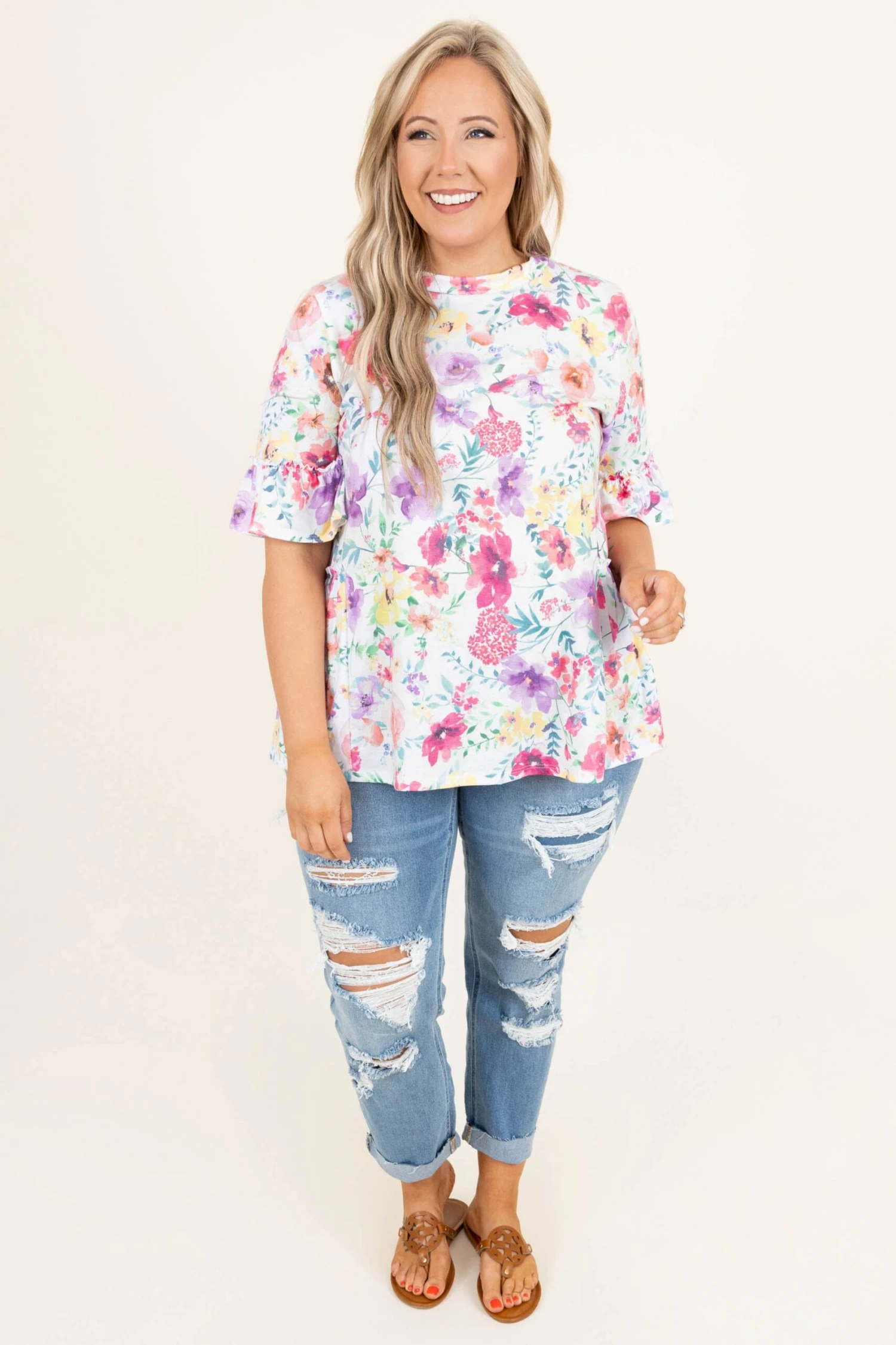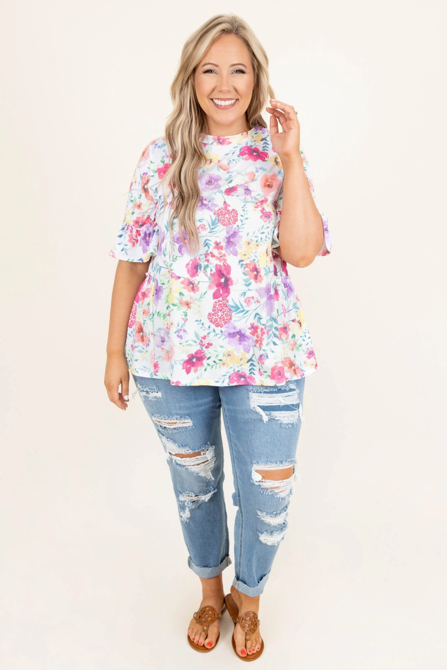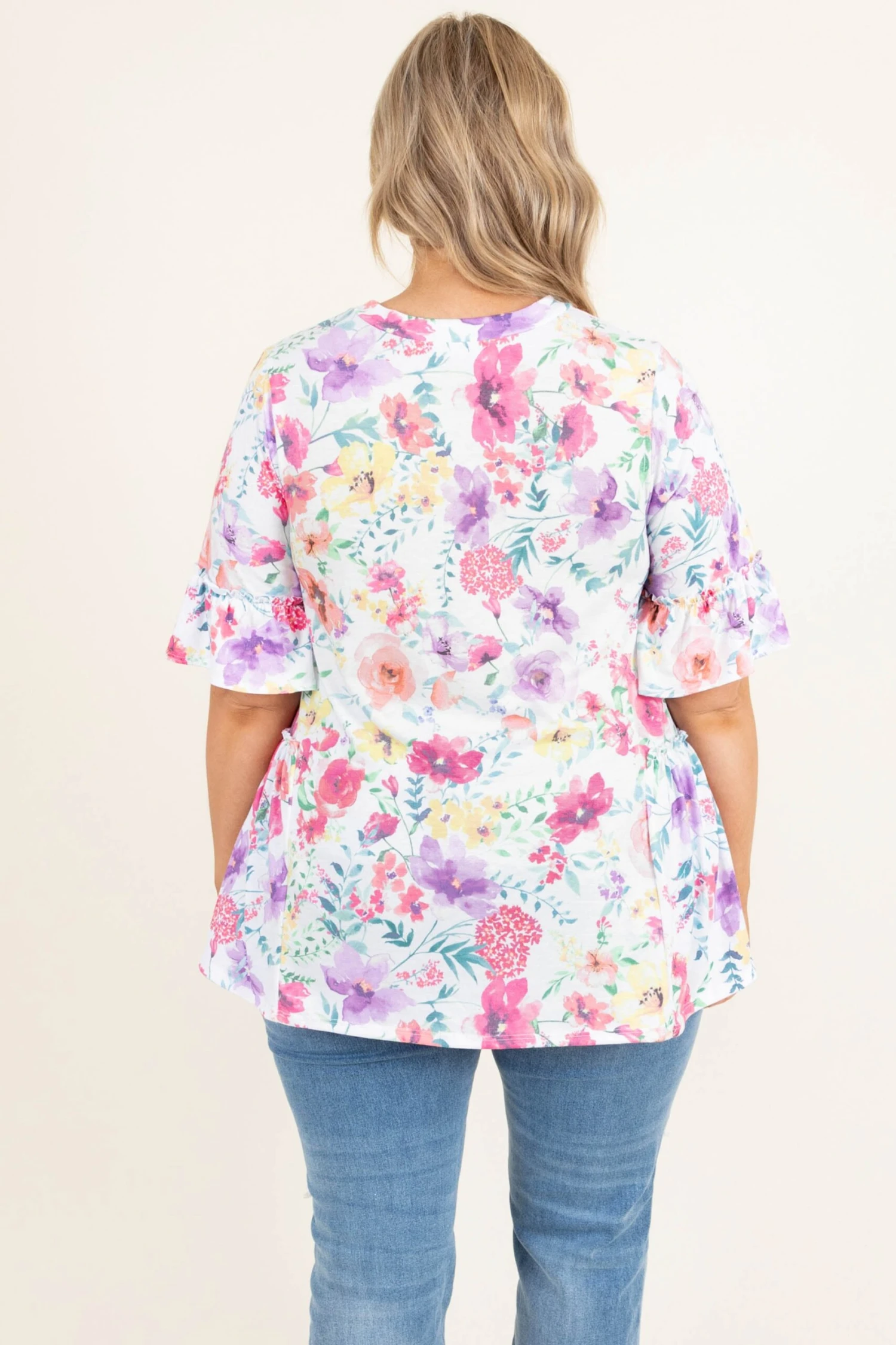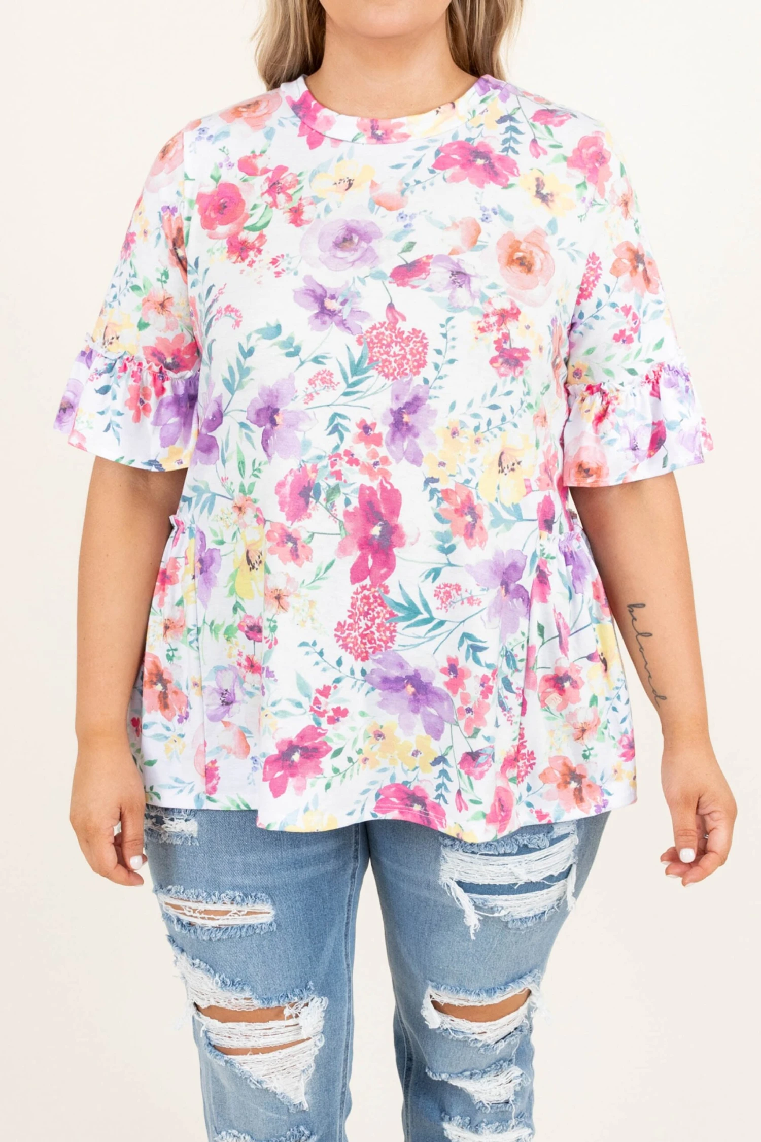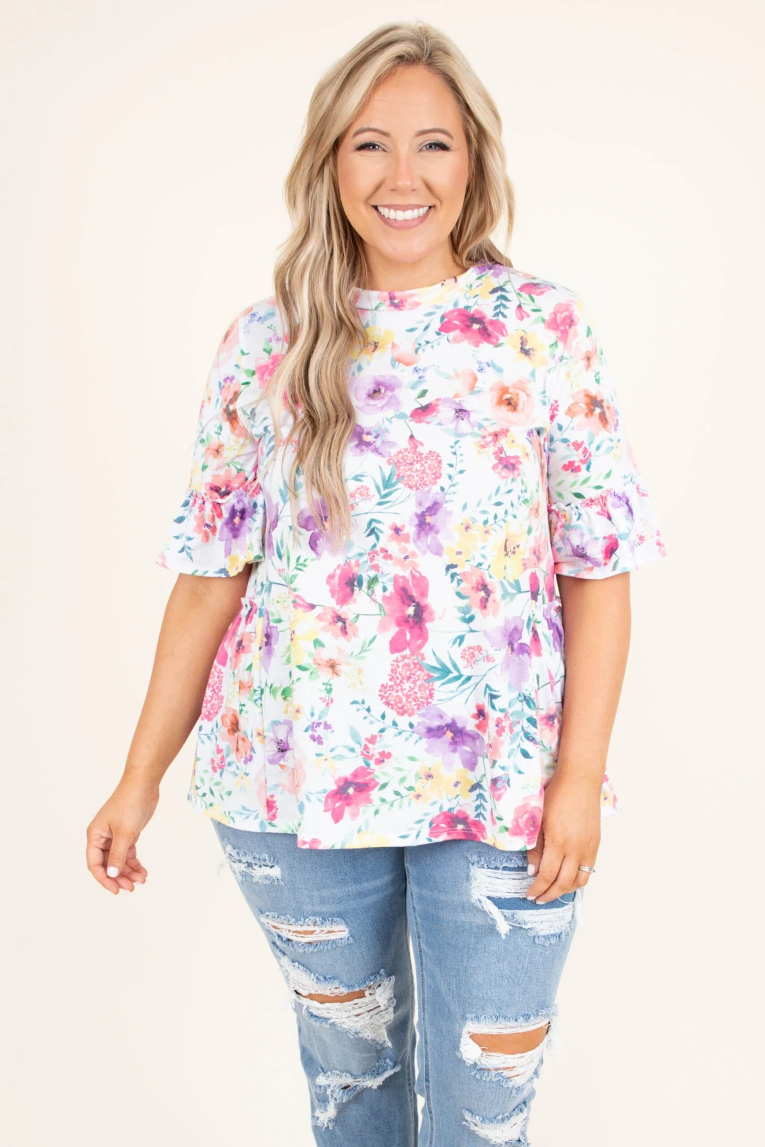 This top will be on rewind in your closet! The ivory color makes the multi-floral pattern pop and the ruffle on the waist and sleeves is so cute! We love the babydoll style that will look so good on every body type! Style this with skinnies and sandals for the perfect look!