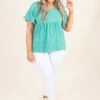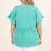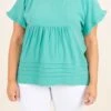 Get in on the coastal trend with this top! The emerald color reminds us of turquoise ocean waters and the linen look is perfect for a beachy vibe! The babydoll style is so flattering and the line design at the bottom is super unique! Style this with white jeans and gold wedges for beachy chic look!