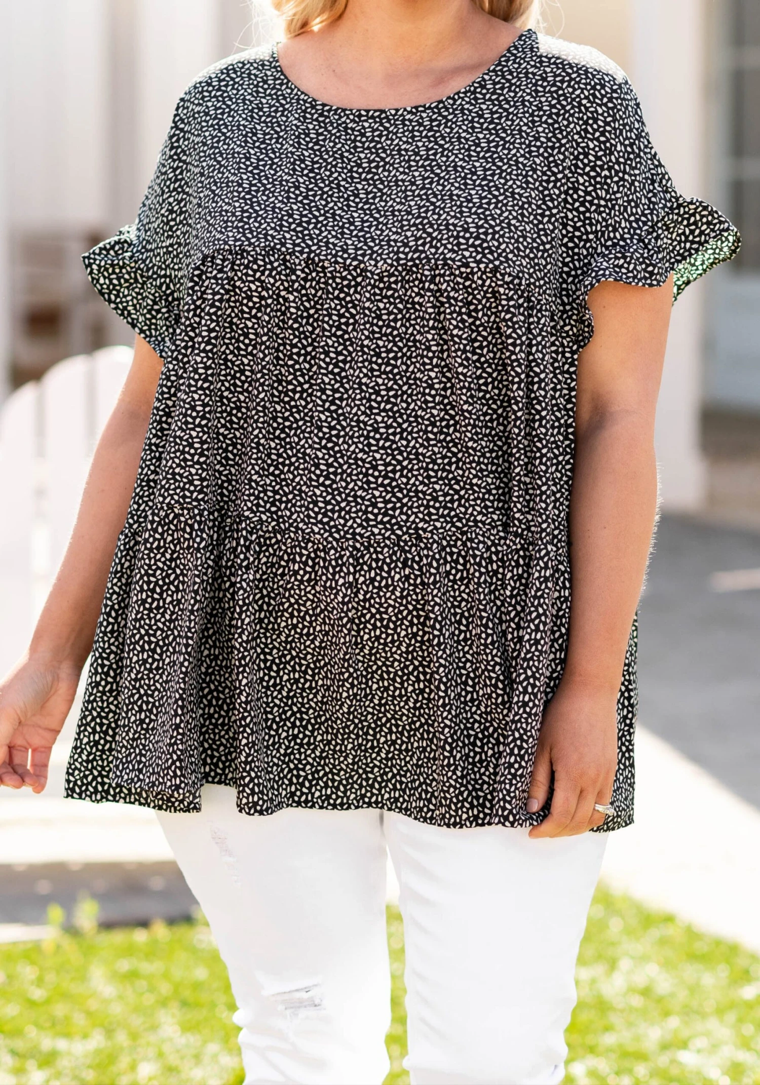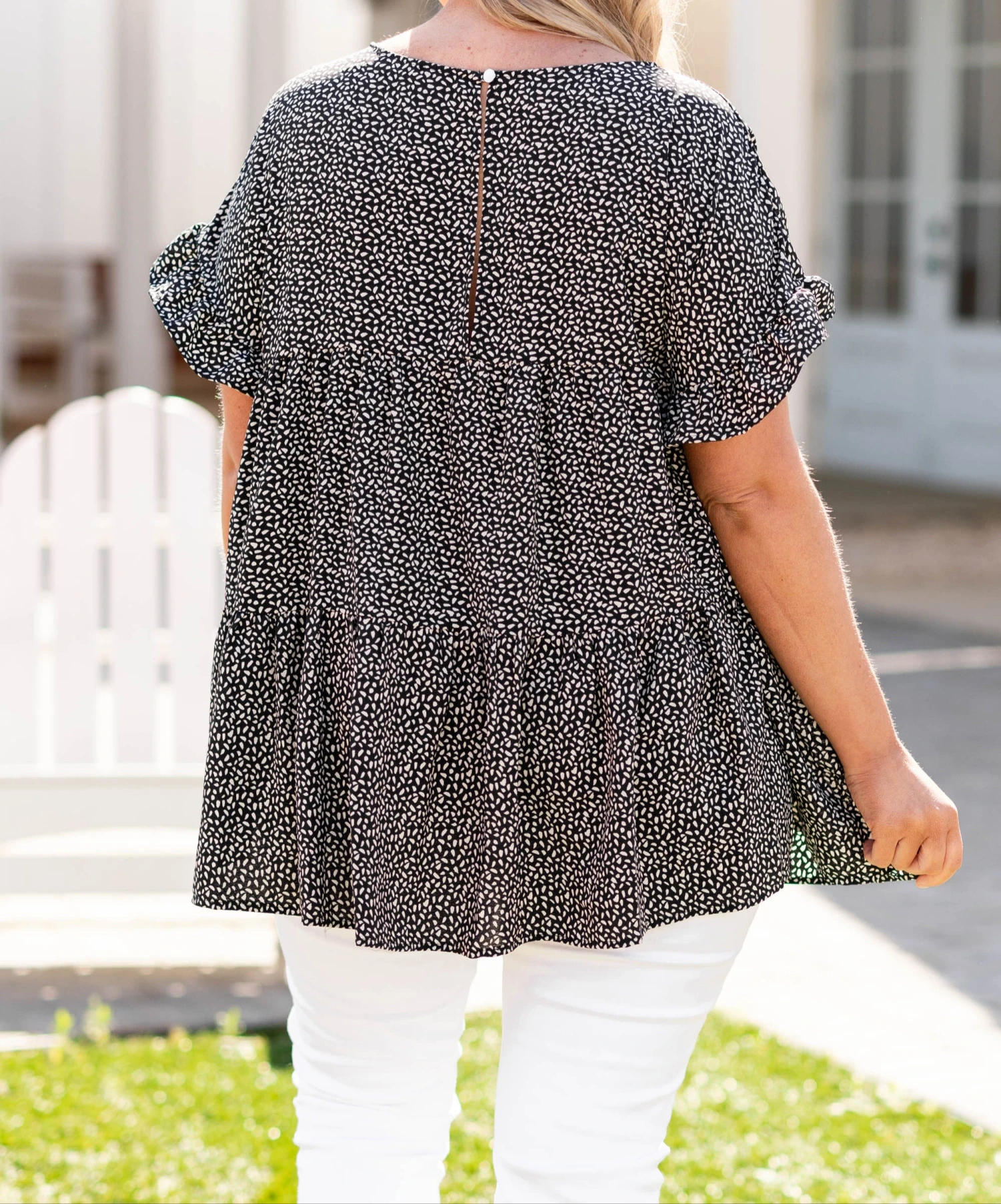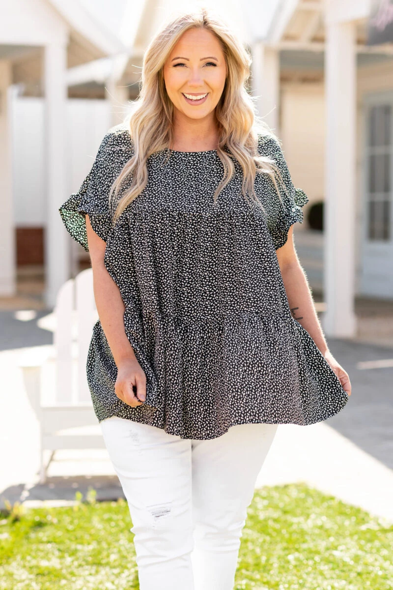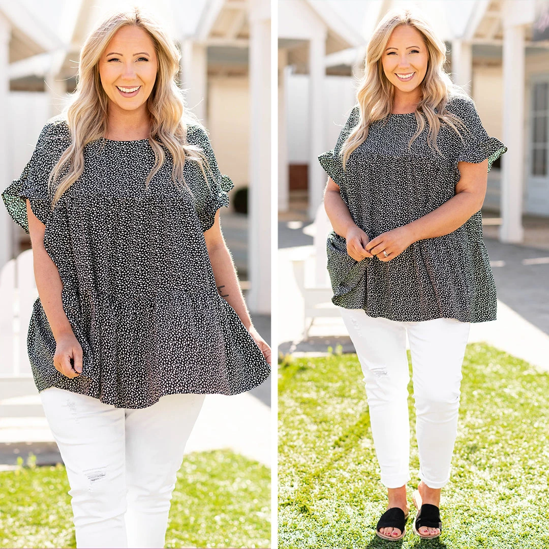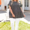 Grabbing coffee with the girls? This top is perfect! This top has a trendy polka dot pattern with a black color that is perfectly chic! It’s comfortable for all-day wear, has a flowy fit, and features the cutest baby doll design! Style this top with skinnies and sandals for an effortlessly chic look!Â