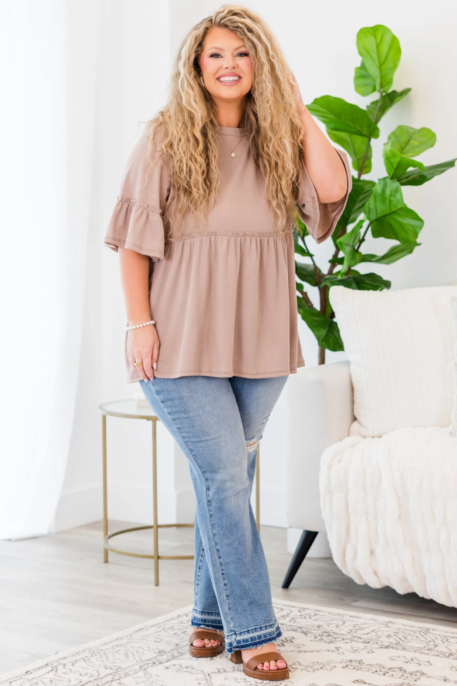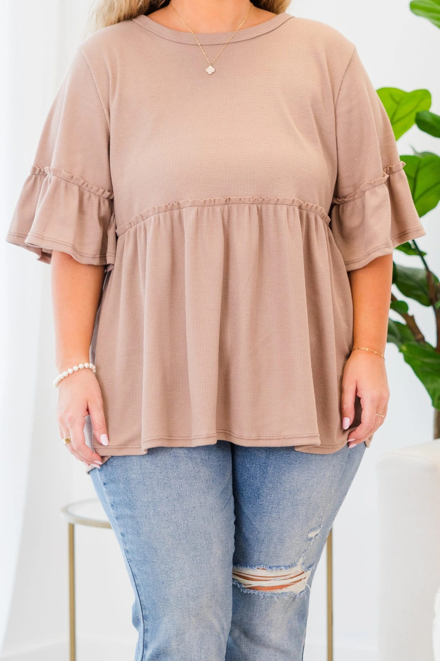 This tunic in taupe offers a stylish and effortless look for any occasion! Its bell sleeves, waffle knit material, and babydoll silhouette provide comfort and style! Pair it with your favorite denim for a versatile and chic outfit!