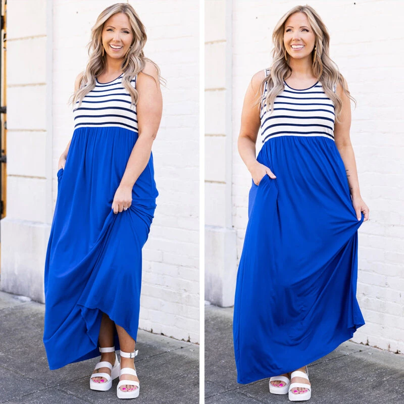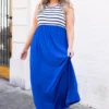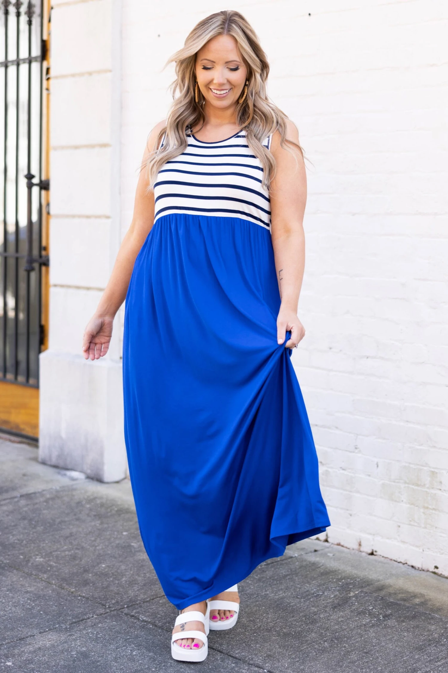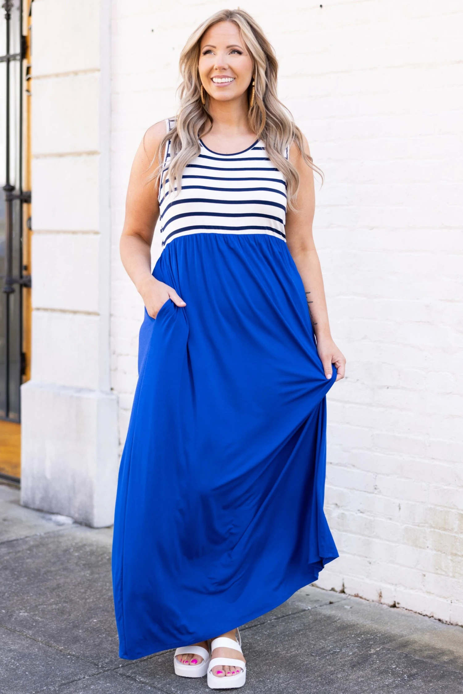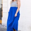 Grab this beauty and look cool by the pool this season! This dress has a gorgeous striped pattern and royal blue color that will stand out in a crowd! The flowy, figure flattering fit is great for all day wear! Pair this dress with sandals or wedges for an everyday chic look!